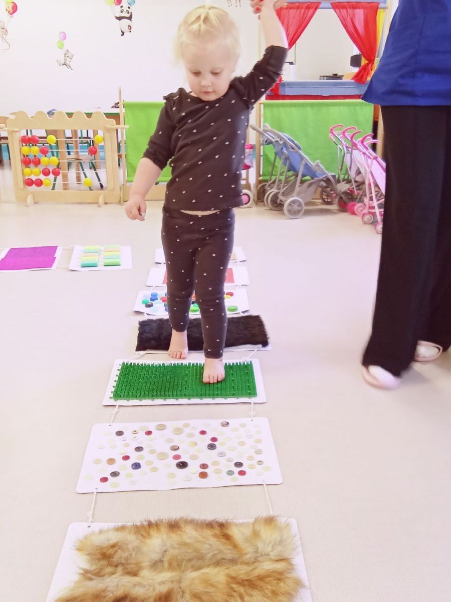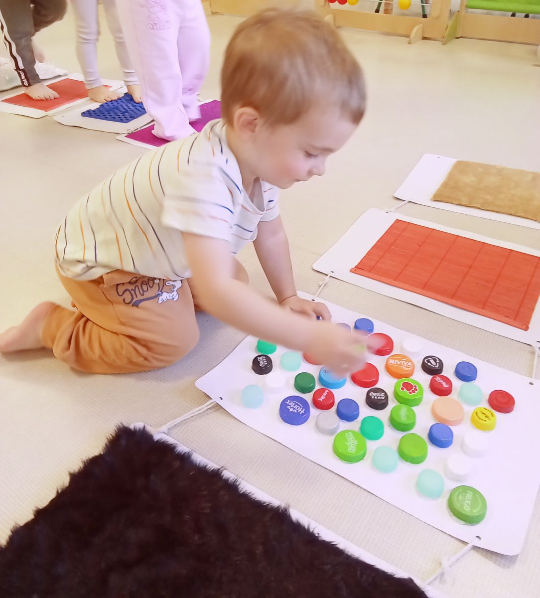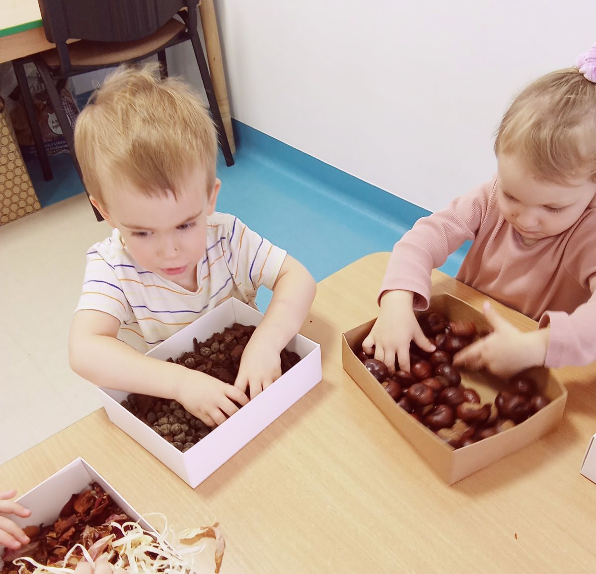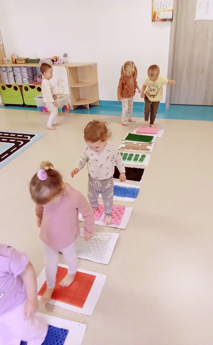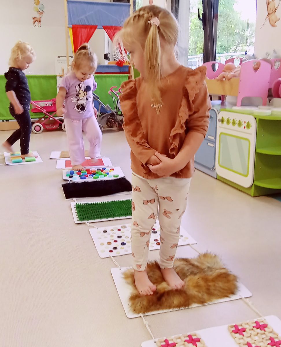 Zajęcia z pudełkami sensorycznymi oraz spacer po ścieżce sensorycznej to świetna zabawa mająca na celu stymulowanie zmysłów dzieci (wzroku, słuchu, dotyku, węchu).