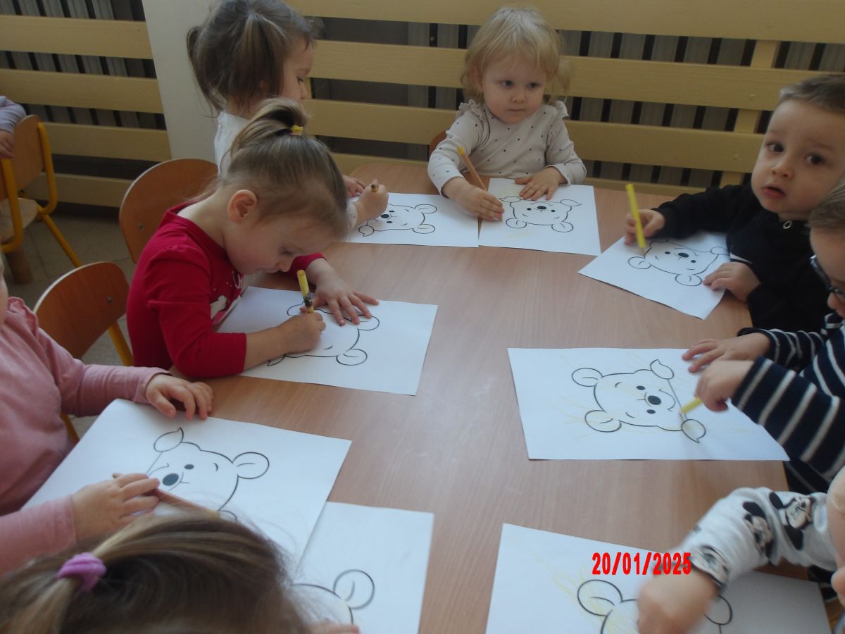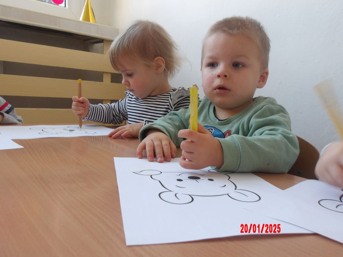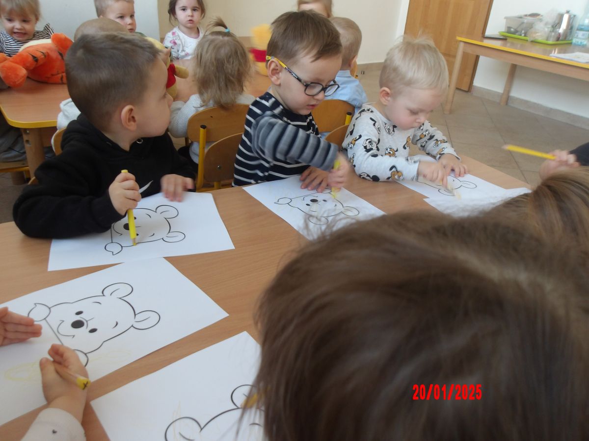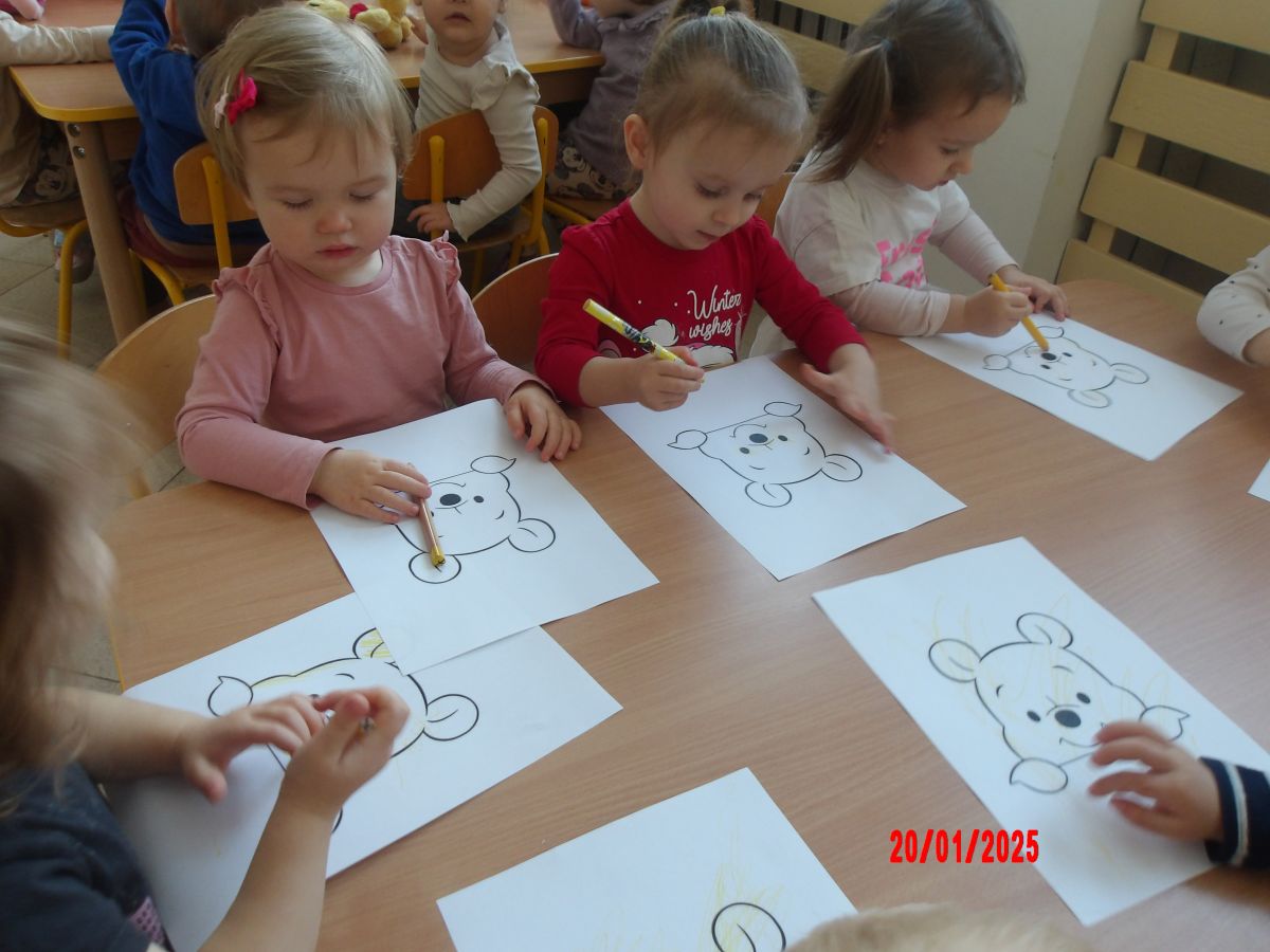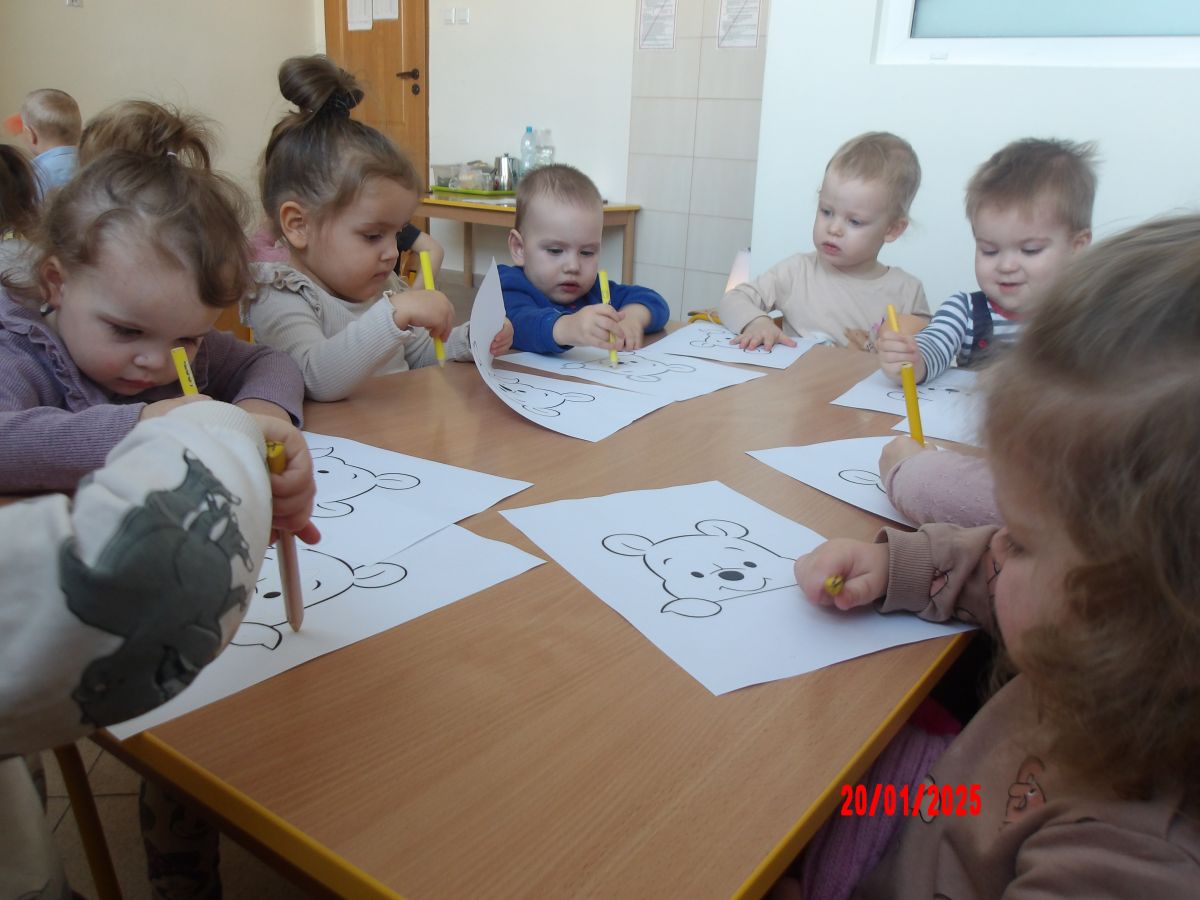 Dzieci wykonały również pracę plastyczną pt. "Kubuś Puchatek". Podczas kolorowania, dwulatki wysłuchały tytułowej piosenki z bajki telewizyjnej "Już pora wstać.".