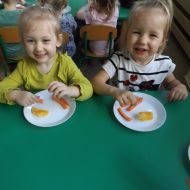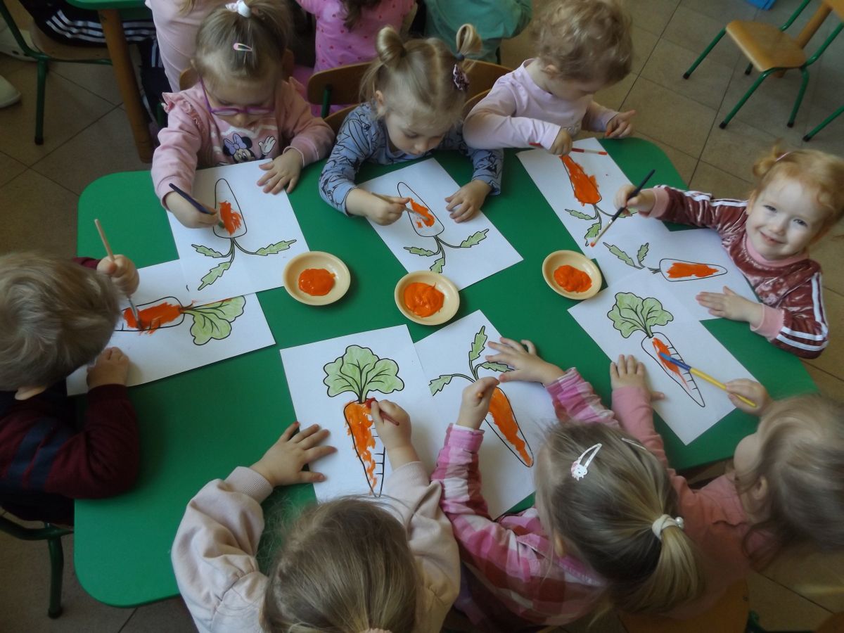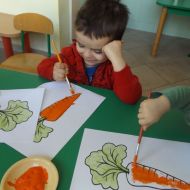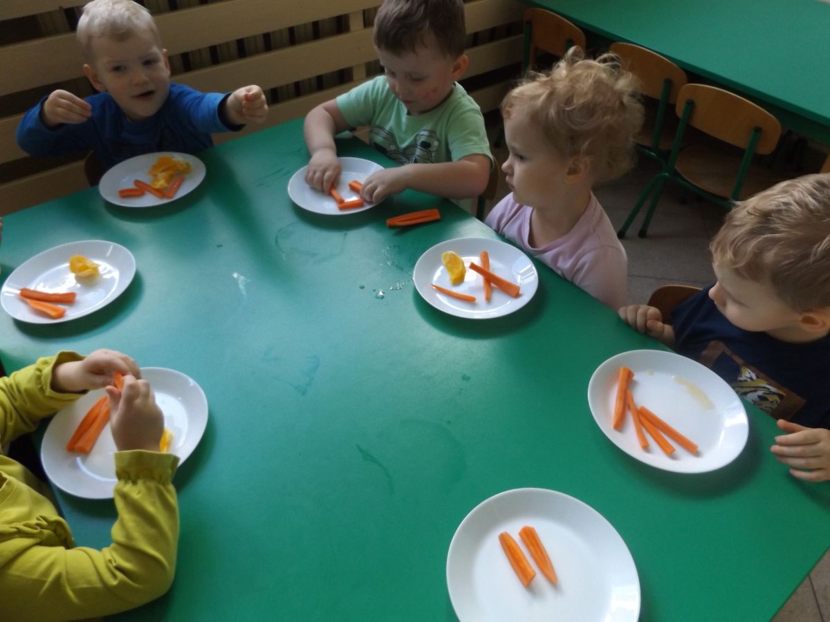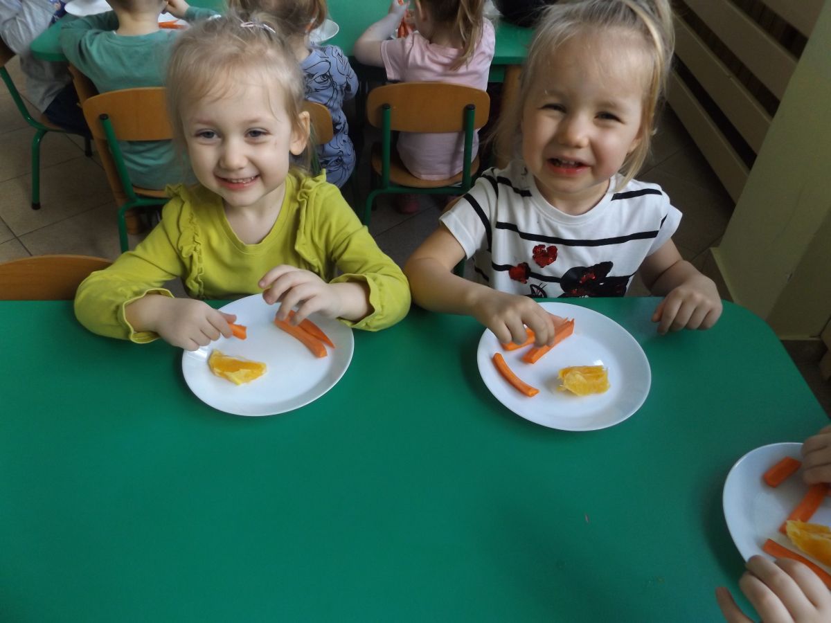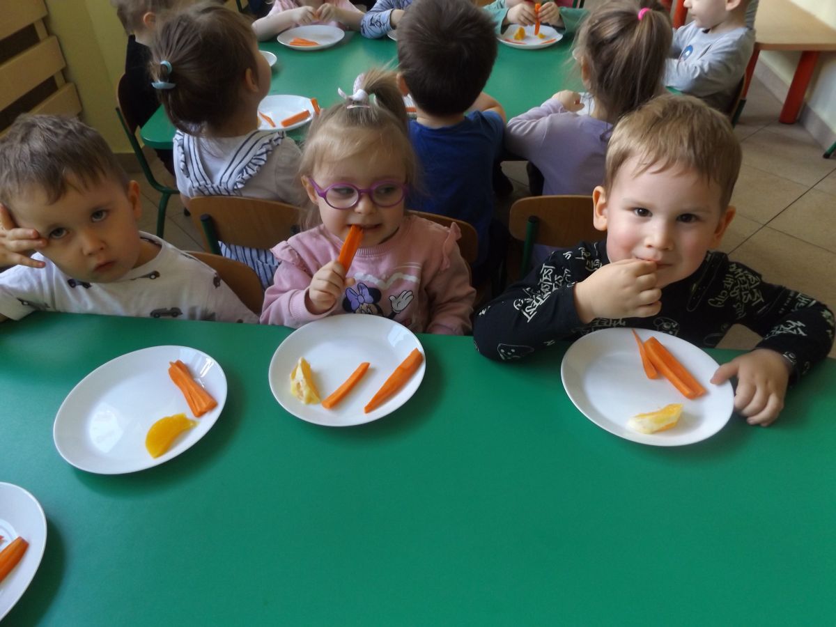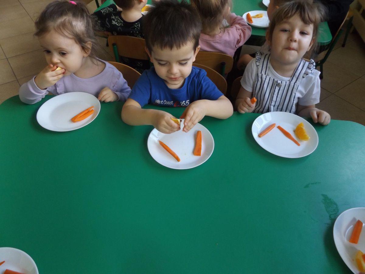 Podczas Międzynarodowego Dnia Marchewki dzieciaki pomalowały farbami swoje marcheweczki starając się nie wyjeżdżać za linię pędzlami, dowiedziały się o zdrowotnych właściwościach tego warzywa oraz schrupały je na drugie śniadanie w towarzystwie pomarańczy.