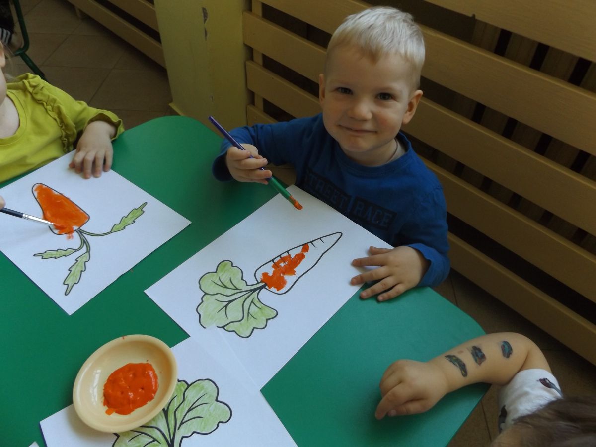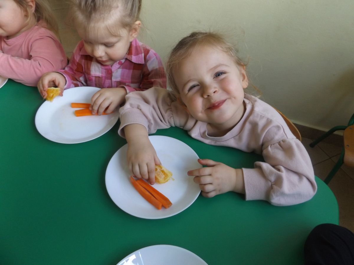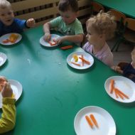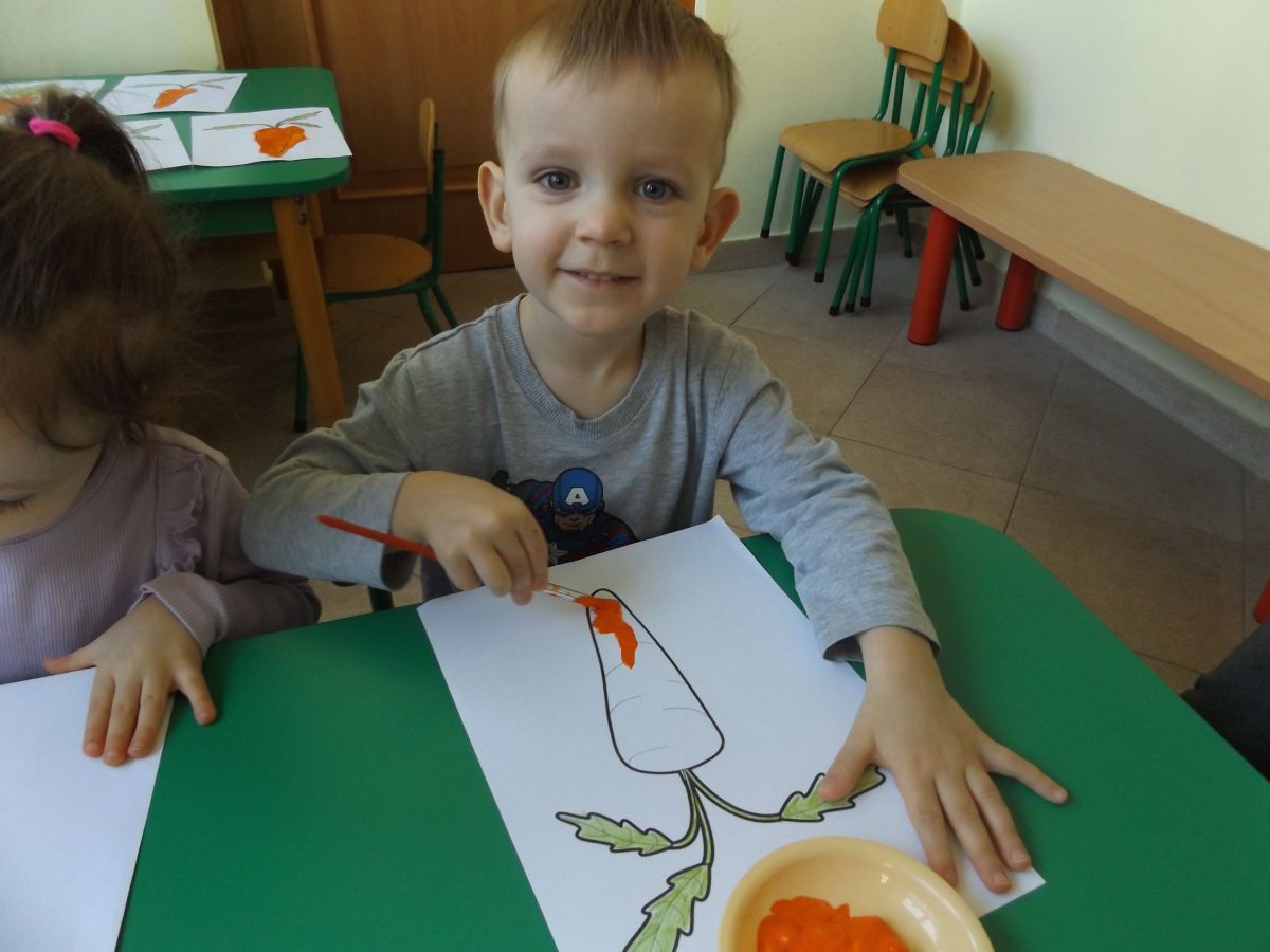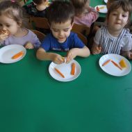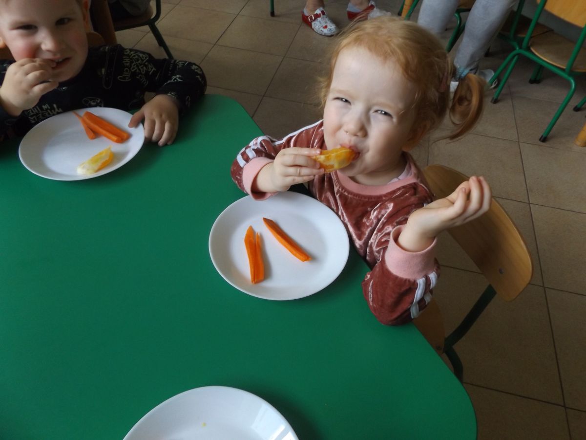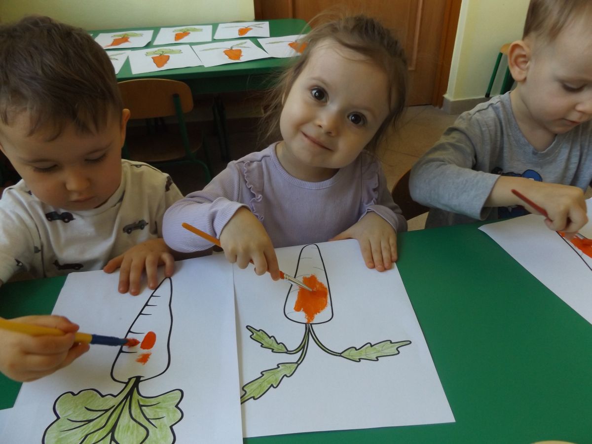 Podczas Międzynarodowego Dnia Marchewki dzieciaki pomalowały farbami swoje marcheweczki starając się nie wyjeżdżać za linię pędzlami, dowiedziały się o zdrowotnych właściwościach tego warzywa oraz schrupały je na drugie śniadanie w towarzystwie pomarańczy.