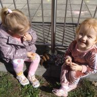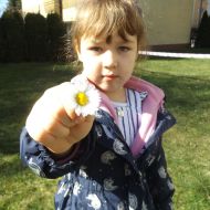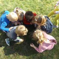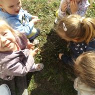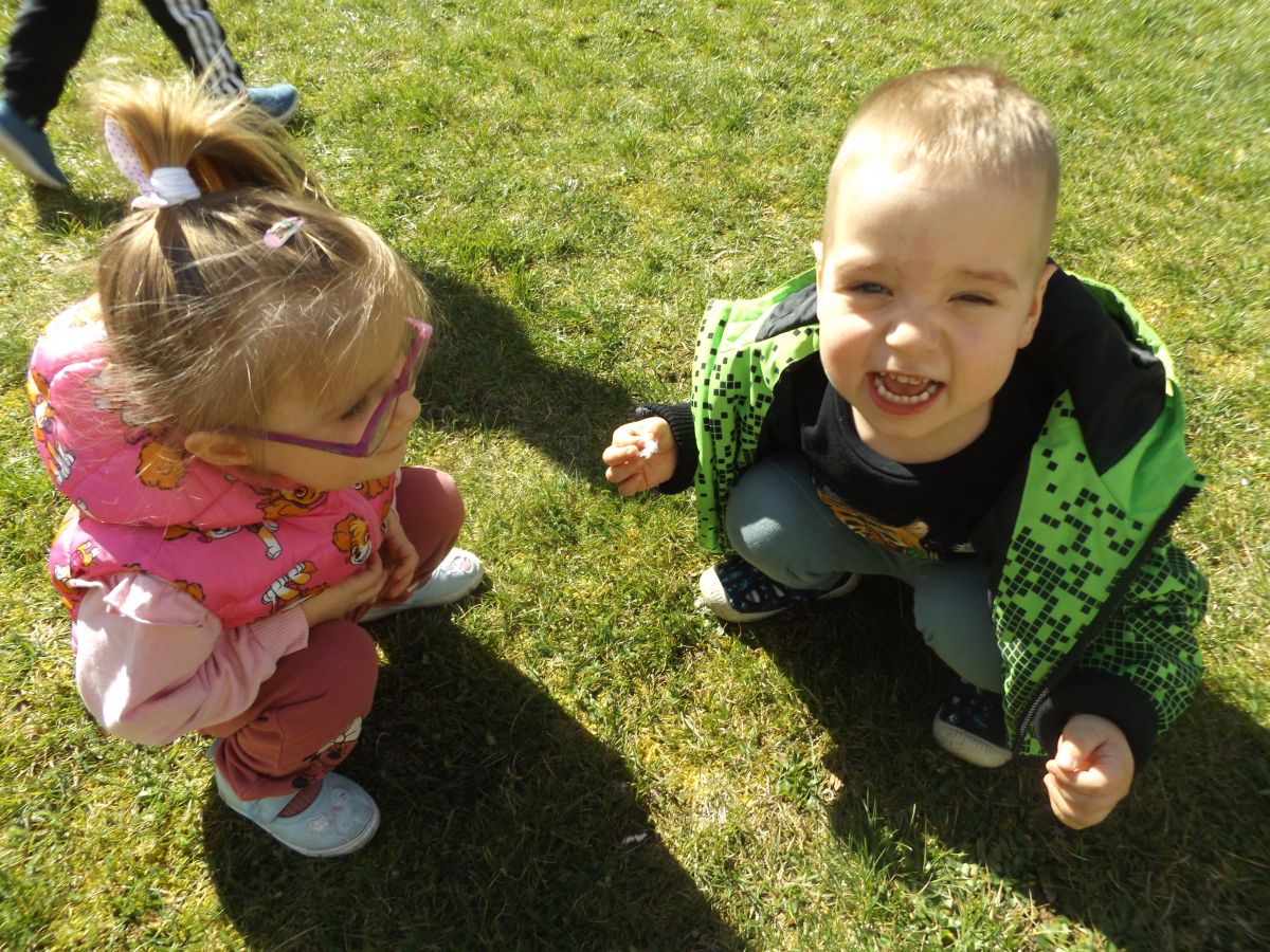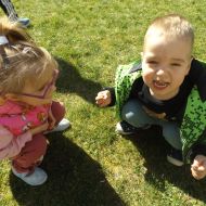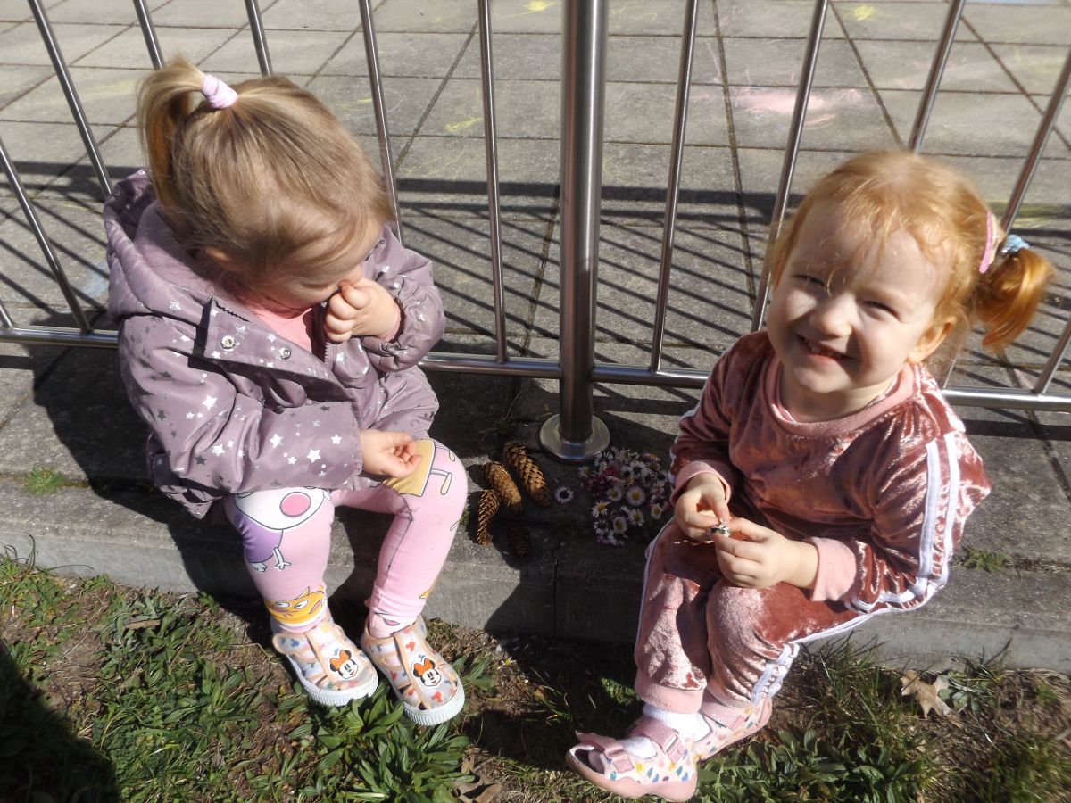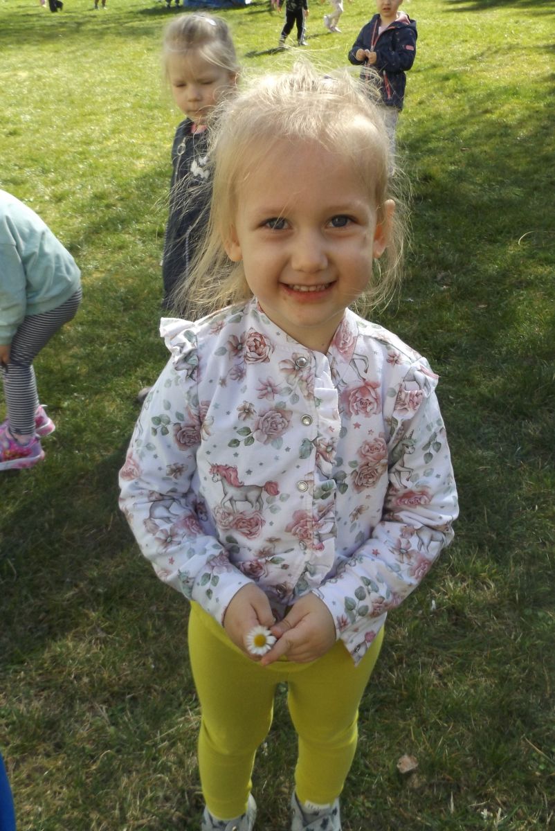 Po pełnym witamin posiłku uwalniały swoją energię podczas harców na świeżym powietrzu. Chłopcom bardzo spodobało się zbieranie dla cioci stokrotek a dziewczynki robiły tort z trawy i szyszek, ozdabiały go pięknymi kwiatuszkami :)