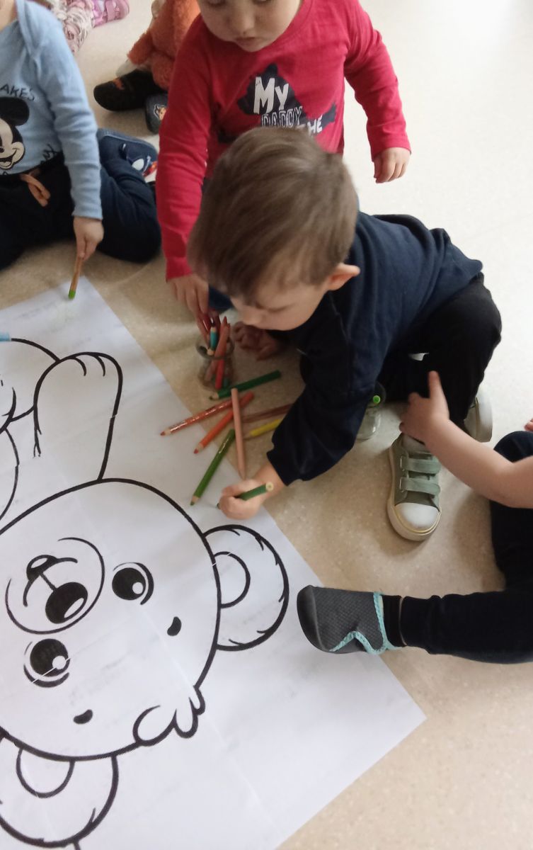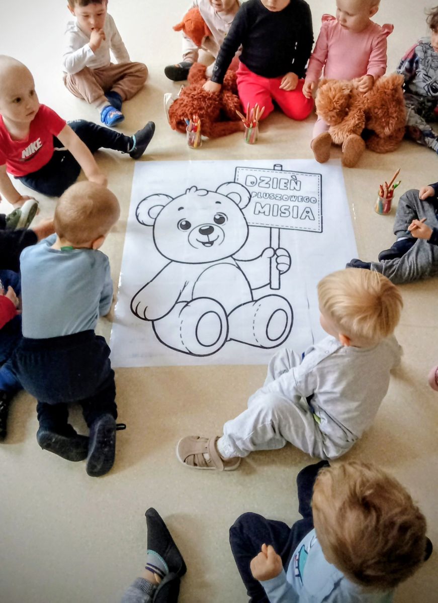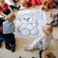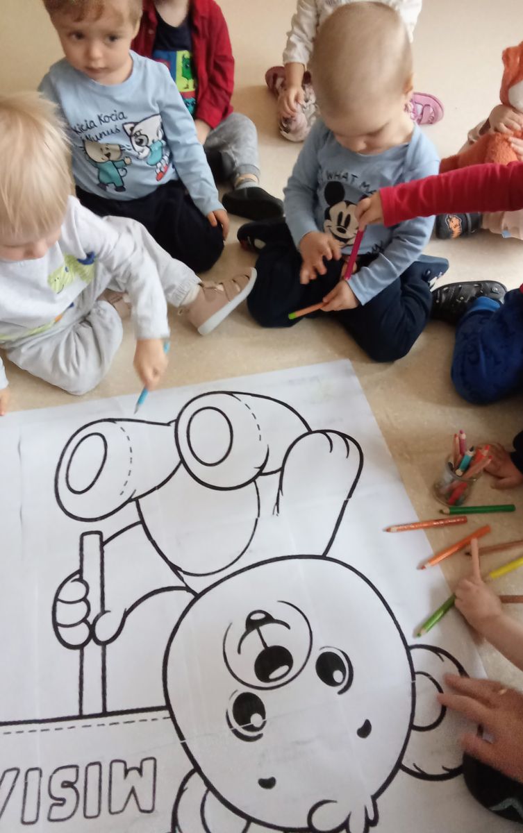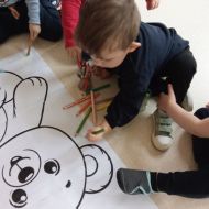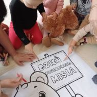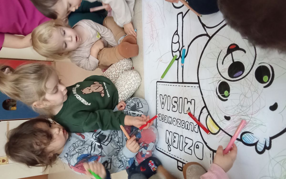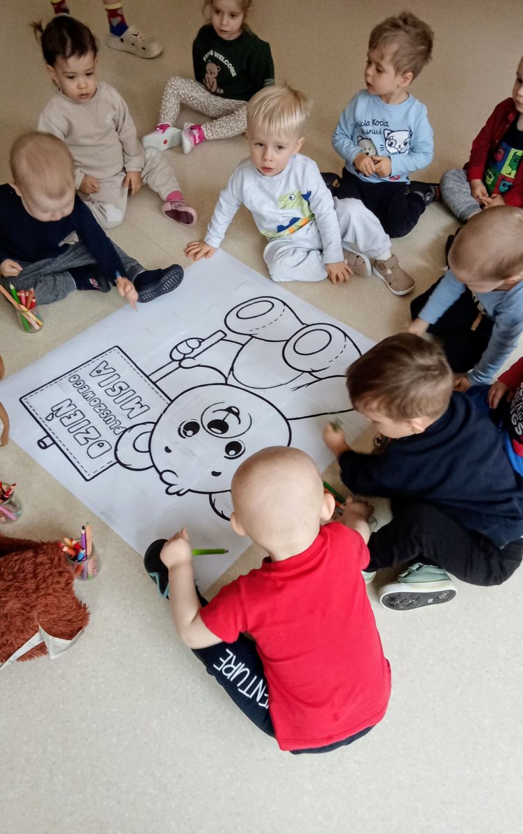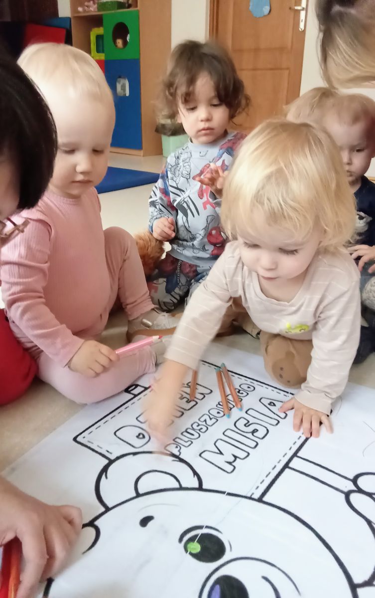 Dzieci przyniosły swoje ulubione pluszaki, które z dumą prezentowały. Następnie, Średniaczki kolorowały dużego misia, tworząc piękną, kolorową pracę plastyczną. Nie zabrakło również tańców z misiami, które wprowadziły wszystkich w świetny nastrój. Na zakończenie misiowych zabaw, maskotki zostały utulone do snu, przy kołysance "Pluszowe niedźwiadki".