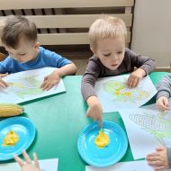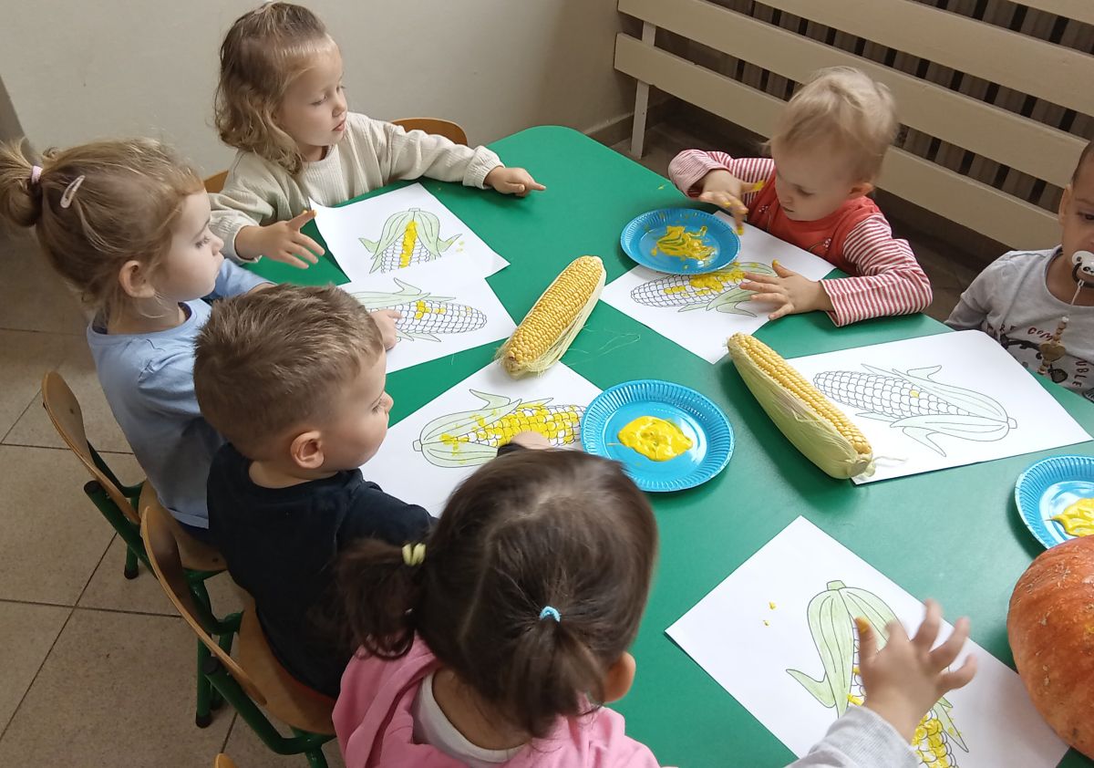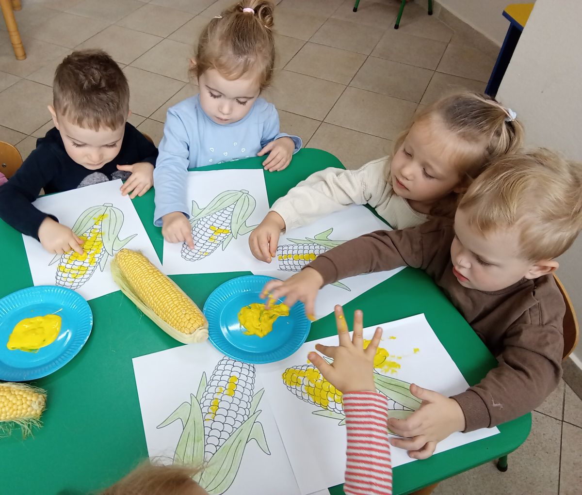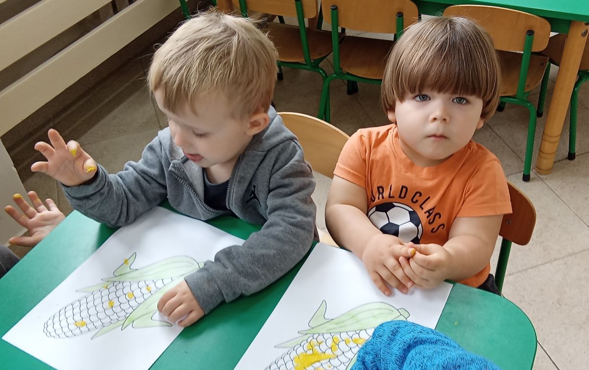 Opublikowano: wt., 10/07/2025 - 13:18 Dziś dzieci poznały kukurydzę - dotykały, wąchały oraz wykonały paluszkami zamoczonymi w farbie piękne prace plastyczne.Takie zajęcia to nie tylko świetna zabawa, ale też doskonałe ćwiczenie małych rączek.