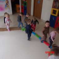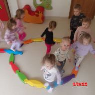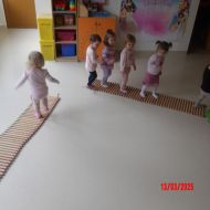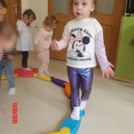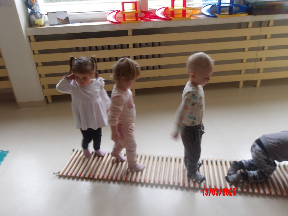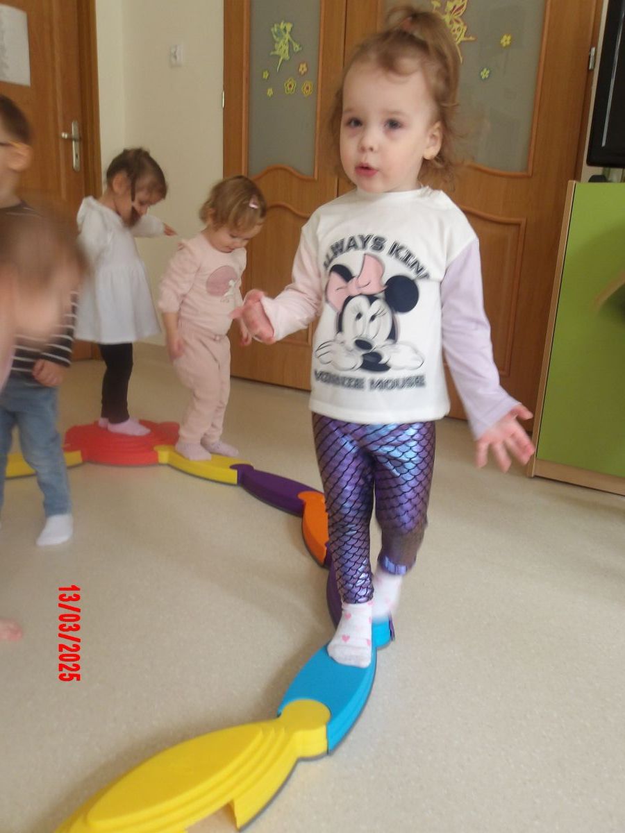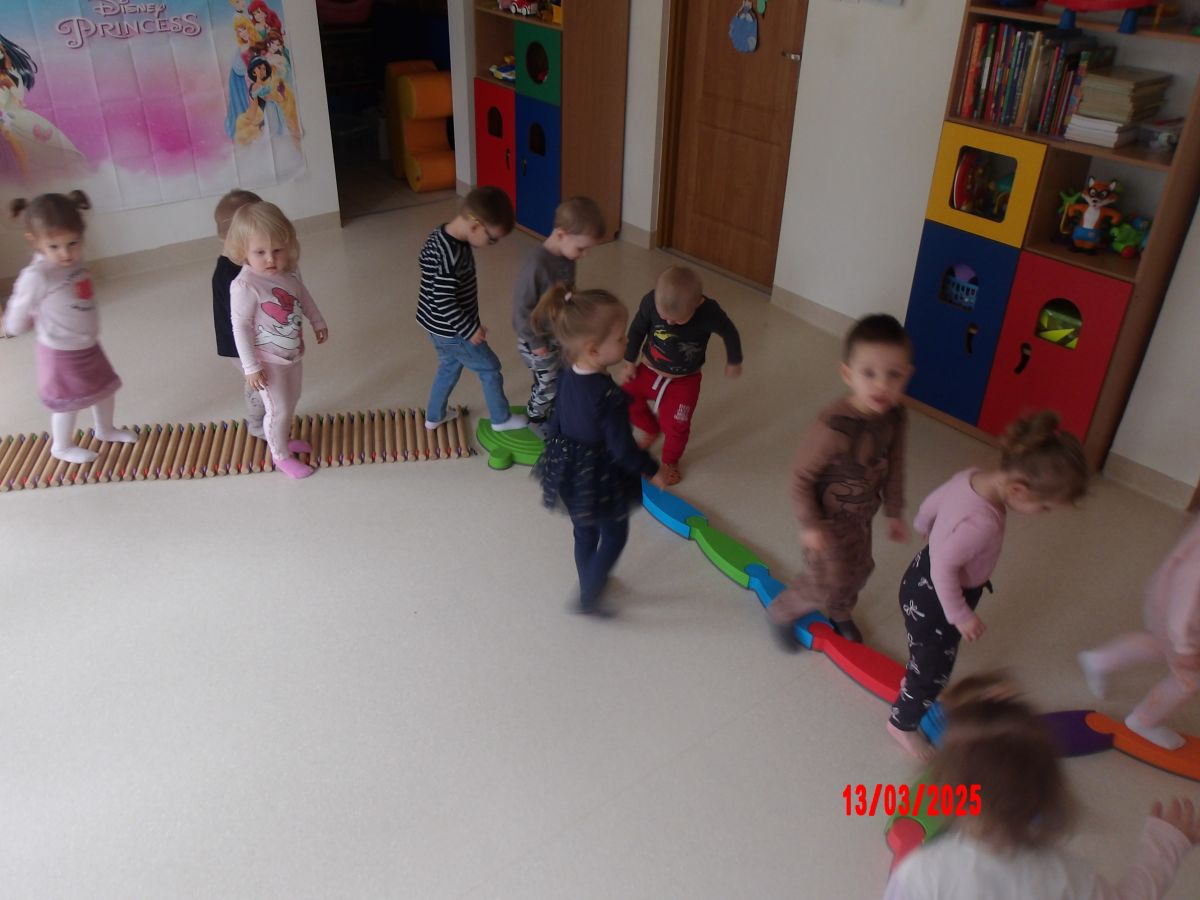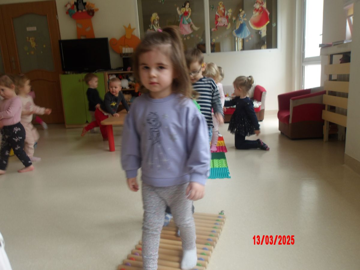 Do zajęć wykorzystano: ścieżkę równoważną - "Rzeka", maty sensoryczne, ścieżki z drewnianych wałeczków oraz ławkę do ćwiczeń.