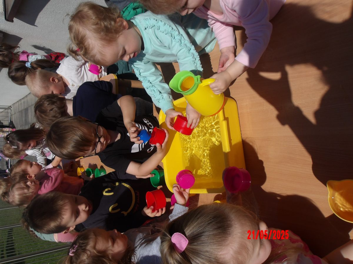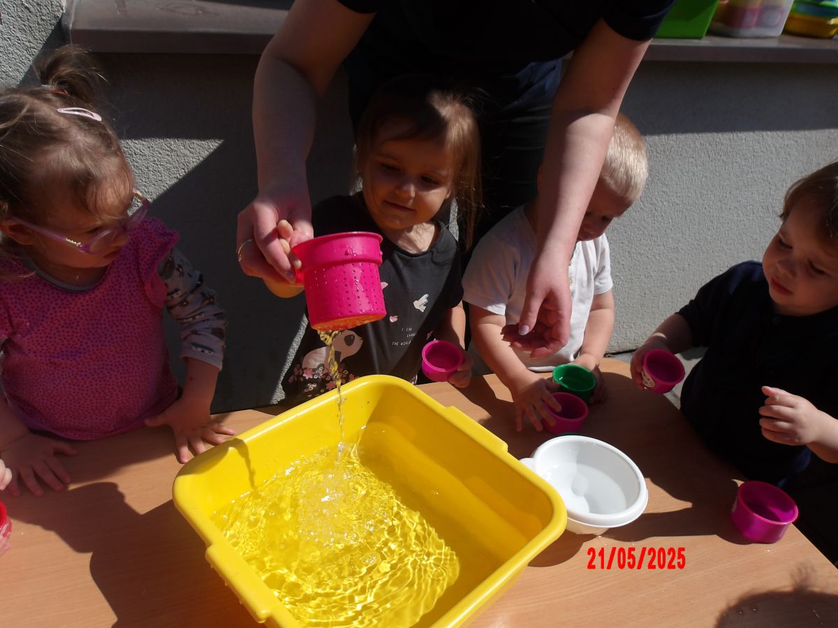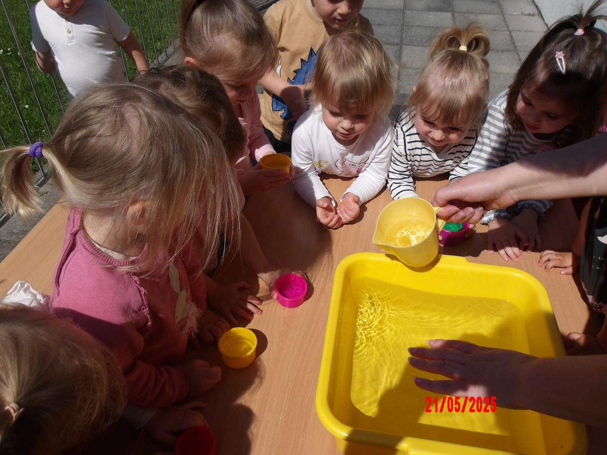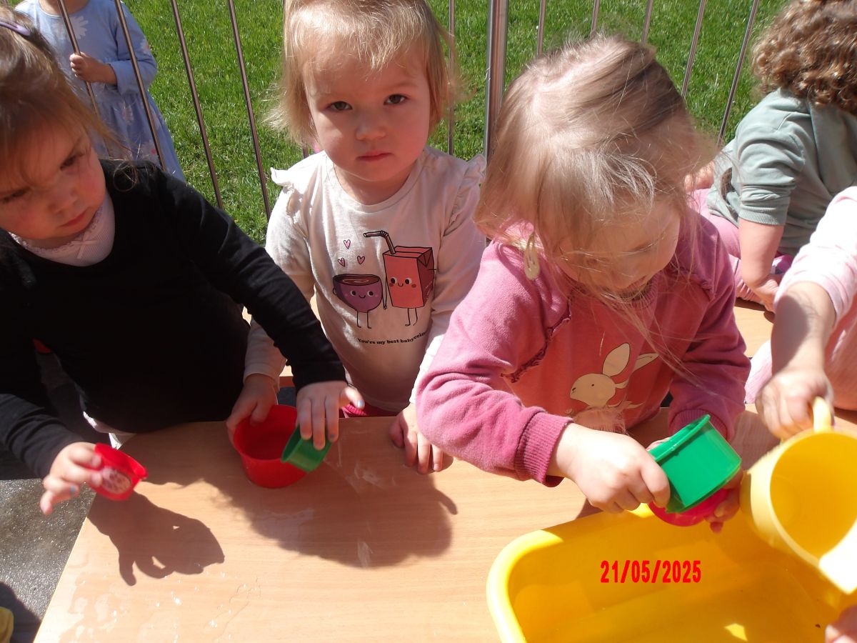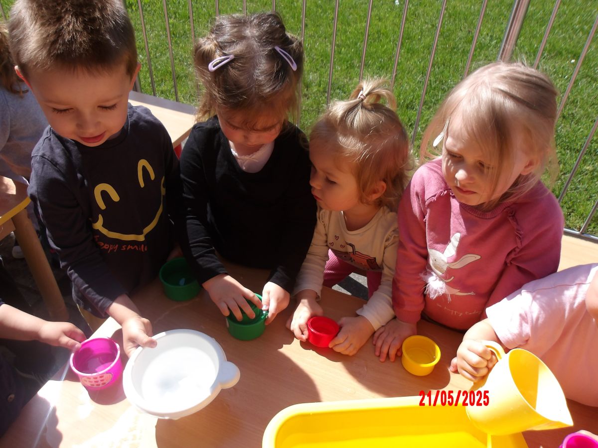 Z dużą ciekawością odkrywały właściwości cieczy. Przelewały, wylewały, a
