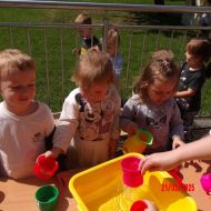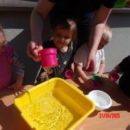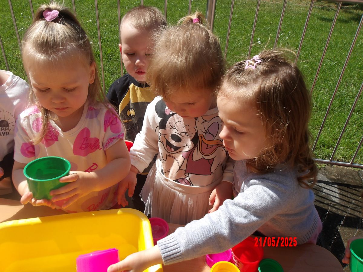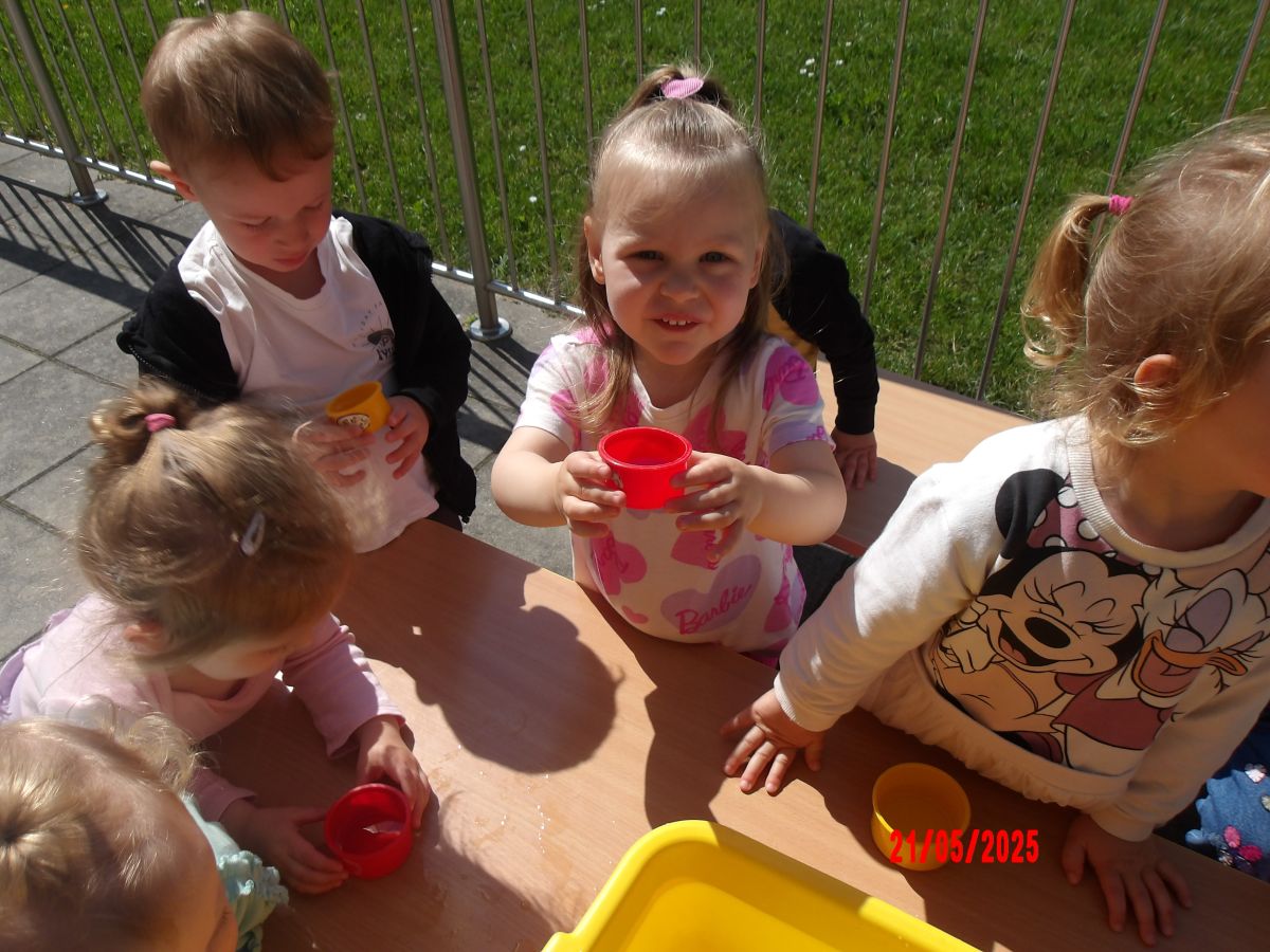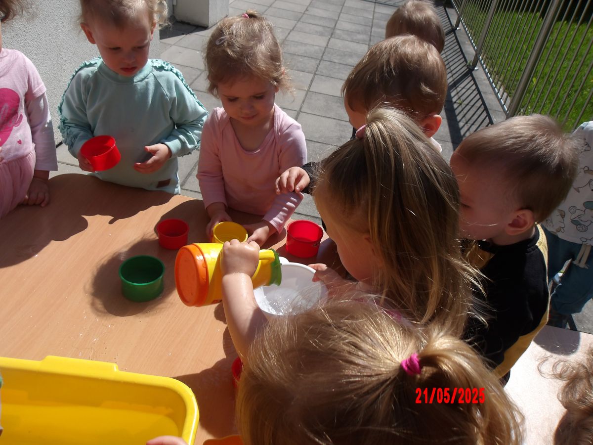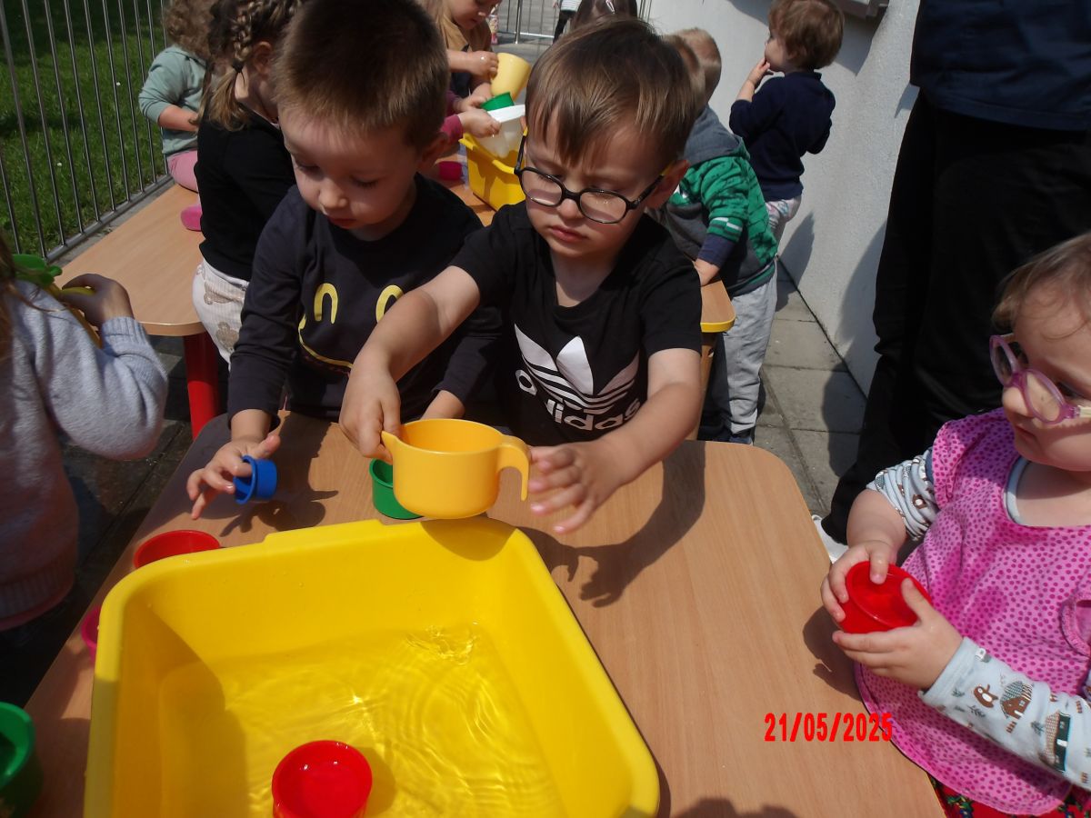 Z dużą ciekawością odkrywały właściwości cieczy. Przelewały, wylewały, a