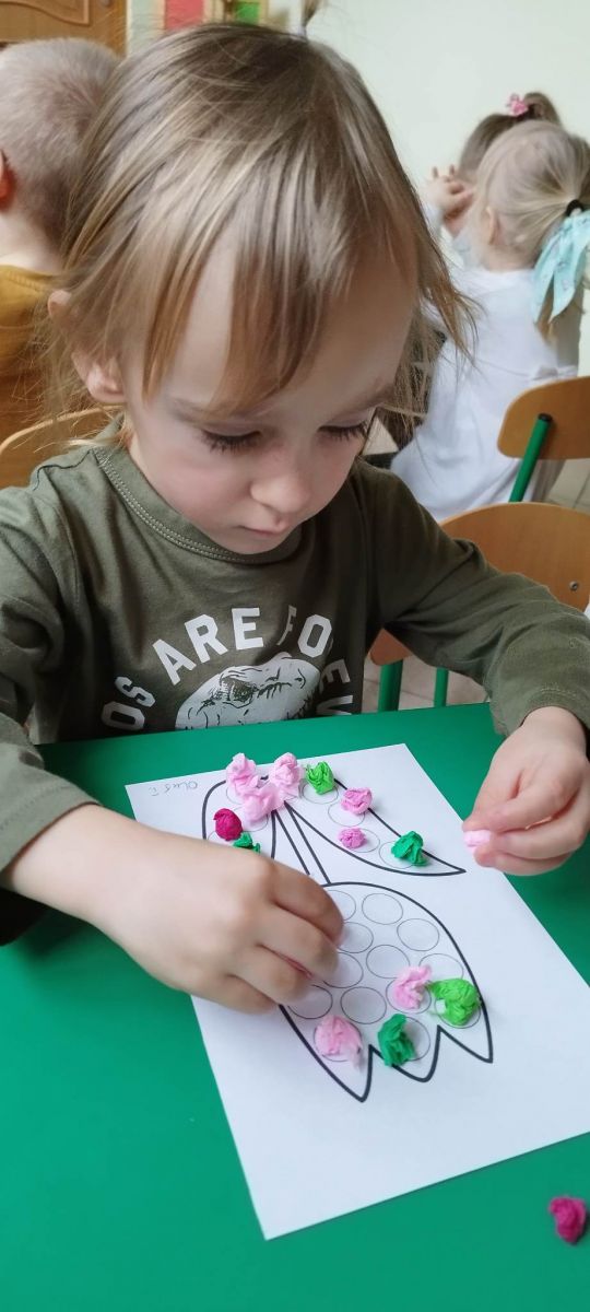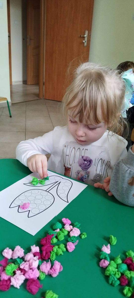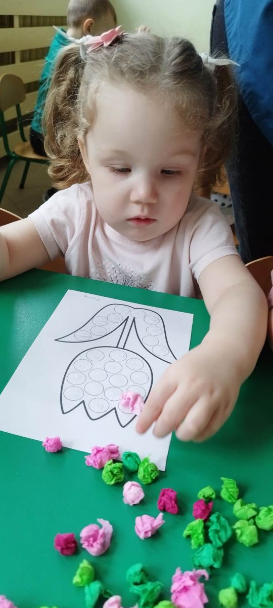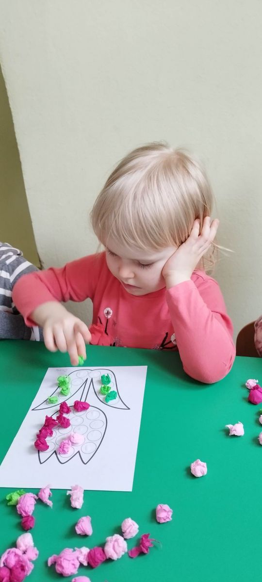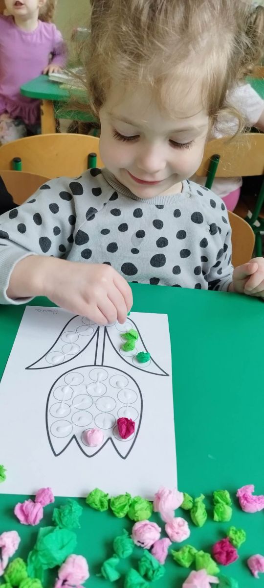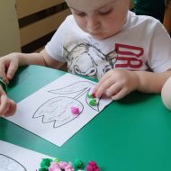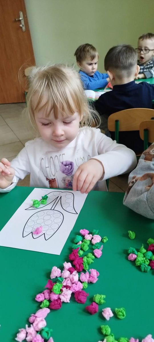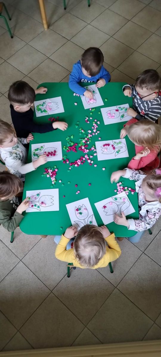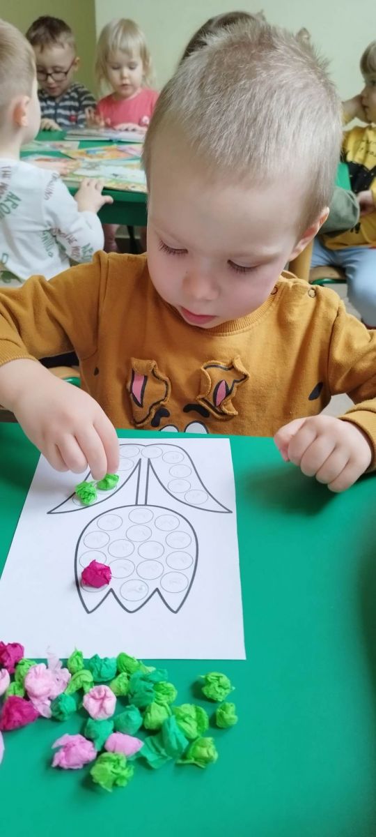 Z okazji pierwszego dnia wiosny dzieci wykonywały również pracę plastyczną. Wyklejały kolorowymi kulkami z bibuły wiosennego tulipana. To zabawa, która rozwija motorykę małą oraz pobudza wyobraźnię dzieci.