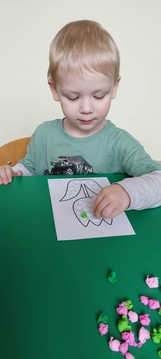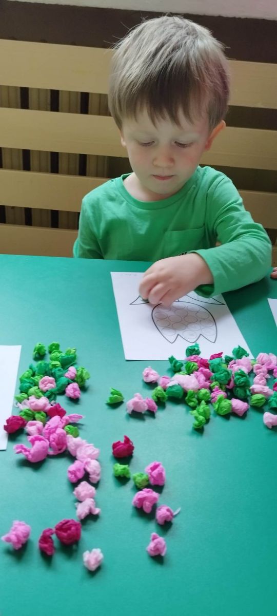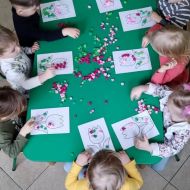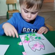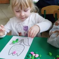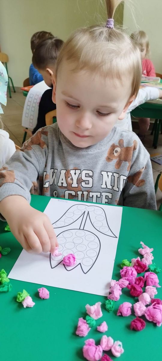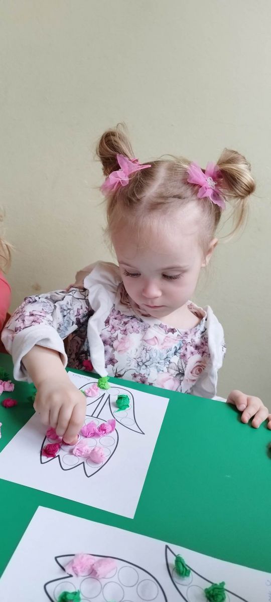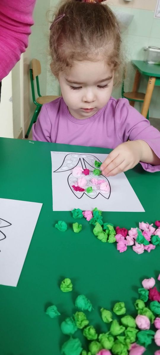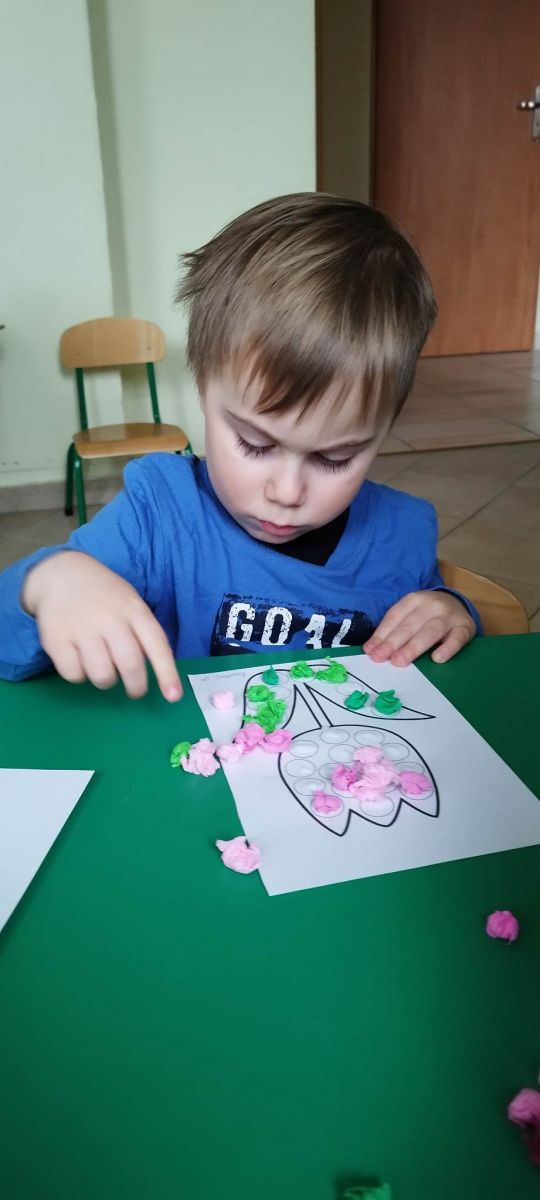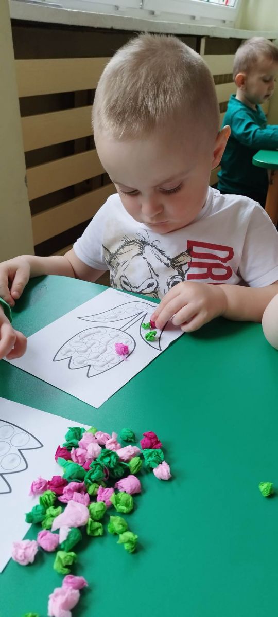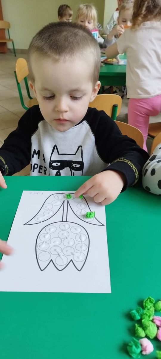 Z okazji pierwszego dnia wiosny dzieci wykonywały również pracę plastyczną. Wyklejały kolorowymi kulkami z bibuły wiosennego tulipana. To zabawa, która rozwija motorykę małą oraz pobudza wyobraźnię dzieci.