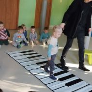 Podczas poniedziałkowych zajęć z rytmiki dzieci zapoznały się z pięciolinią i znakami graficznymi nut. Starszaczki zagrały również na instrumentach w rytm piosenki " Nutki filutki". Zatańczyły w parach do piosenki " Biegną małe nutki" . Największą radość sprawił im taniec walczyk.