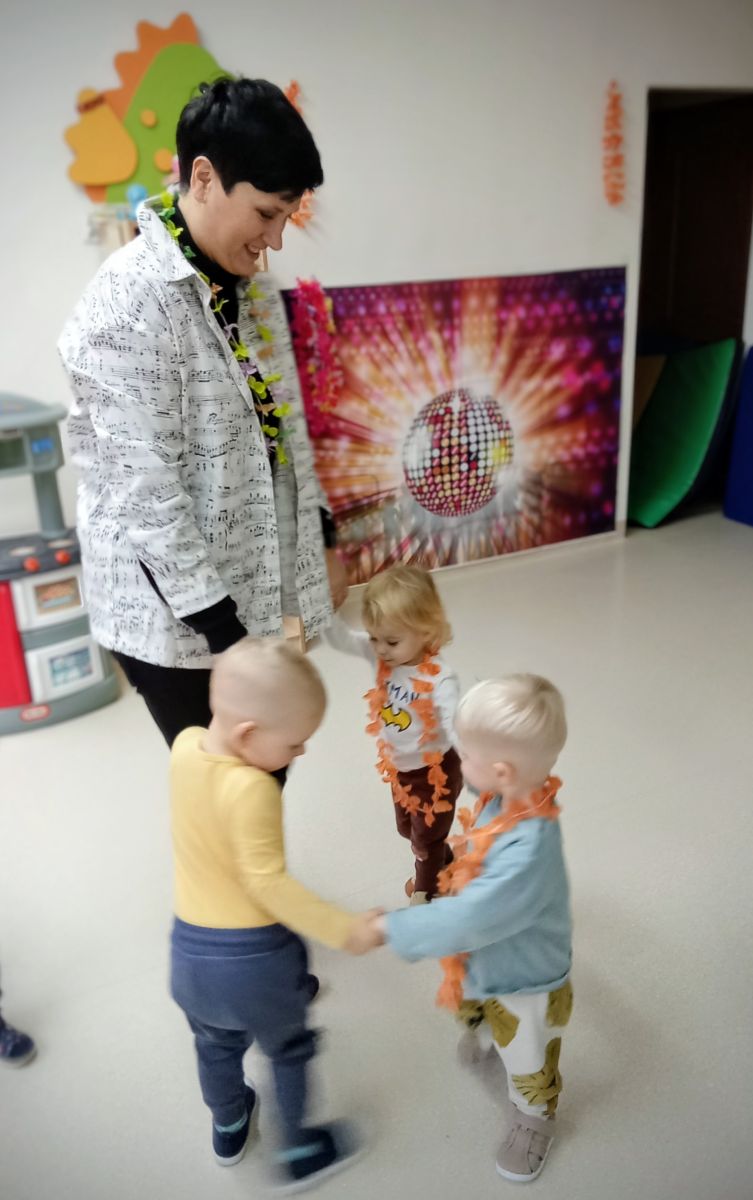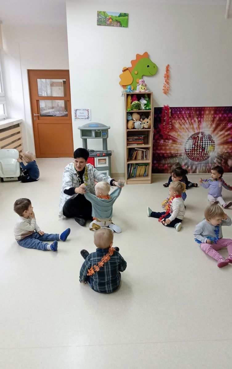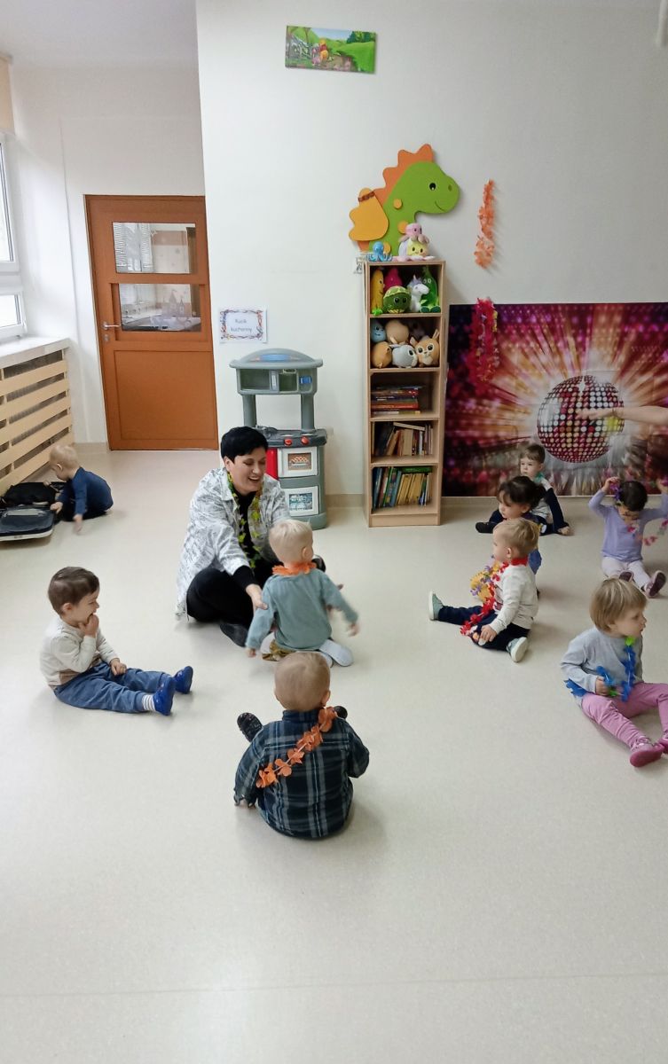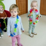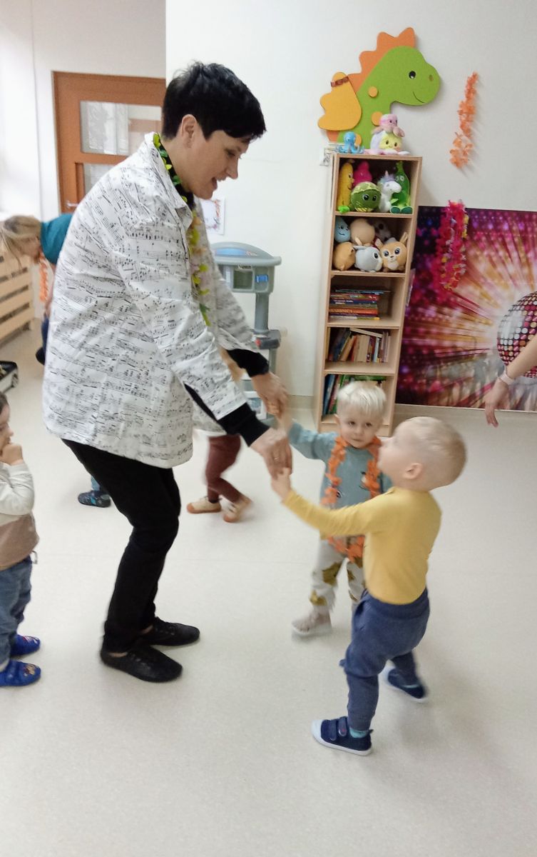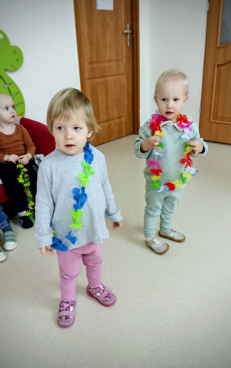 W andrzejkową rytmikę dzieci bawiły się w rytmie skocznych, wesołych piosenek. Na początek wszyscy ruszyli w taniec hawajski - machając łańcuchami z kolorowych kwiatów.