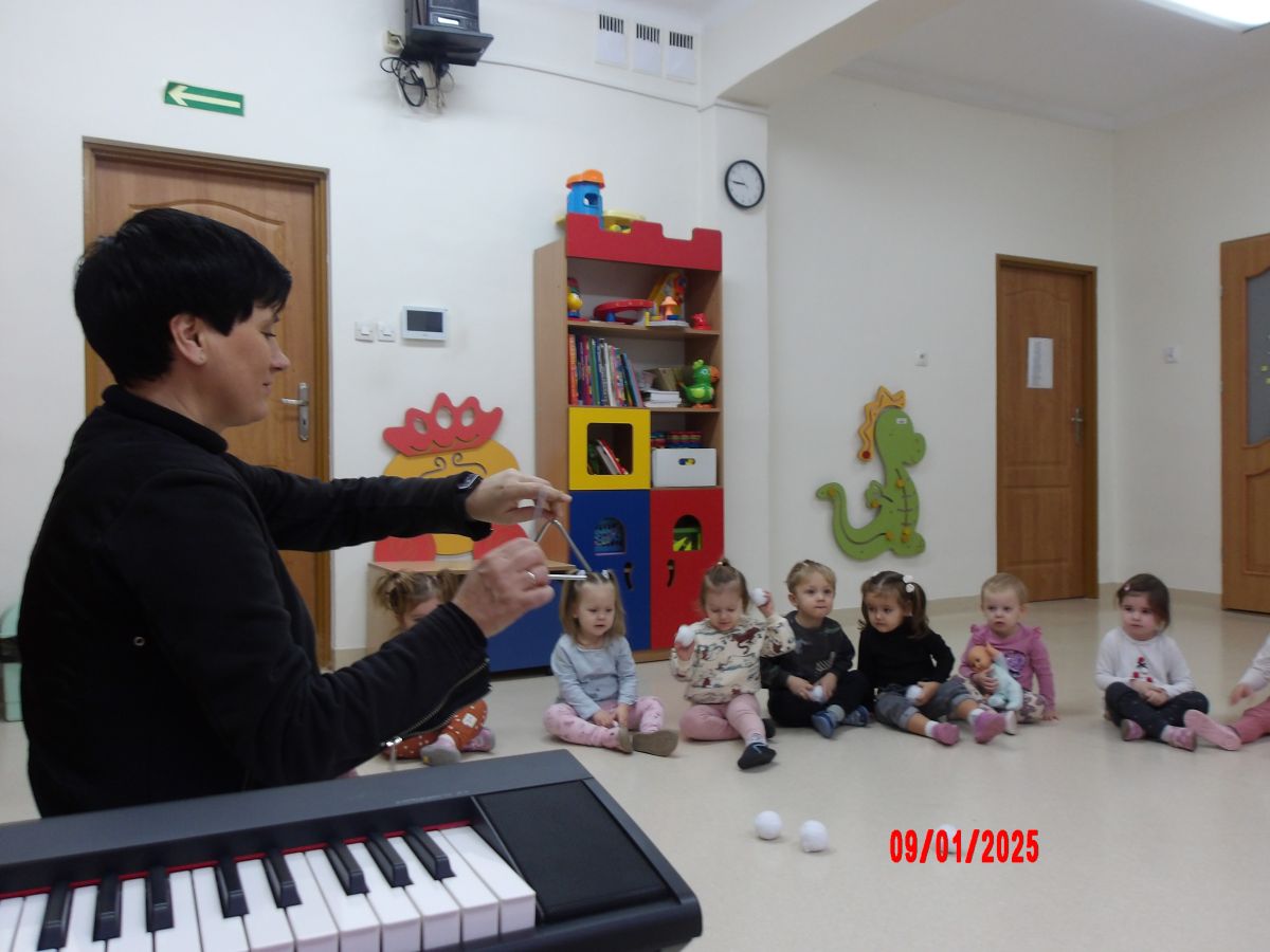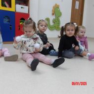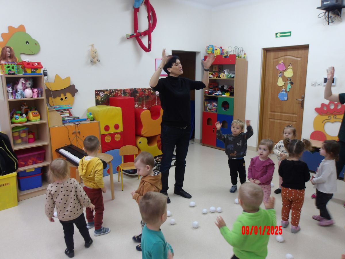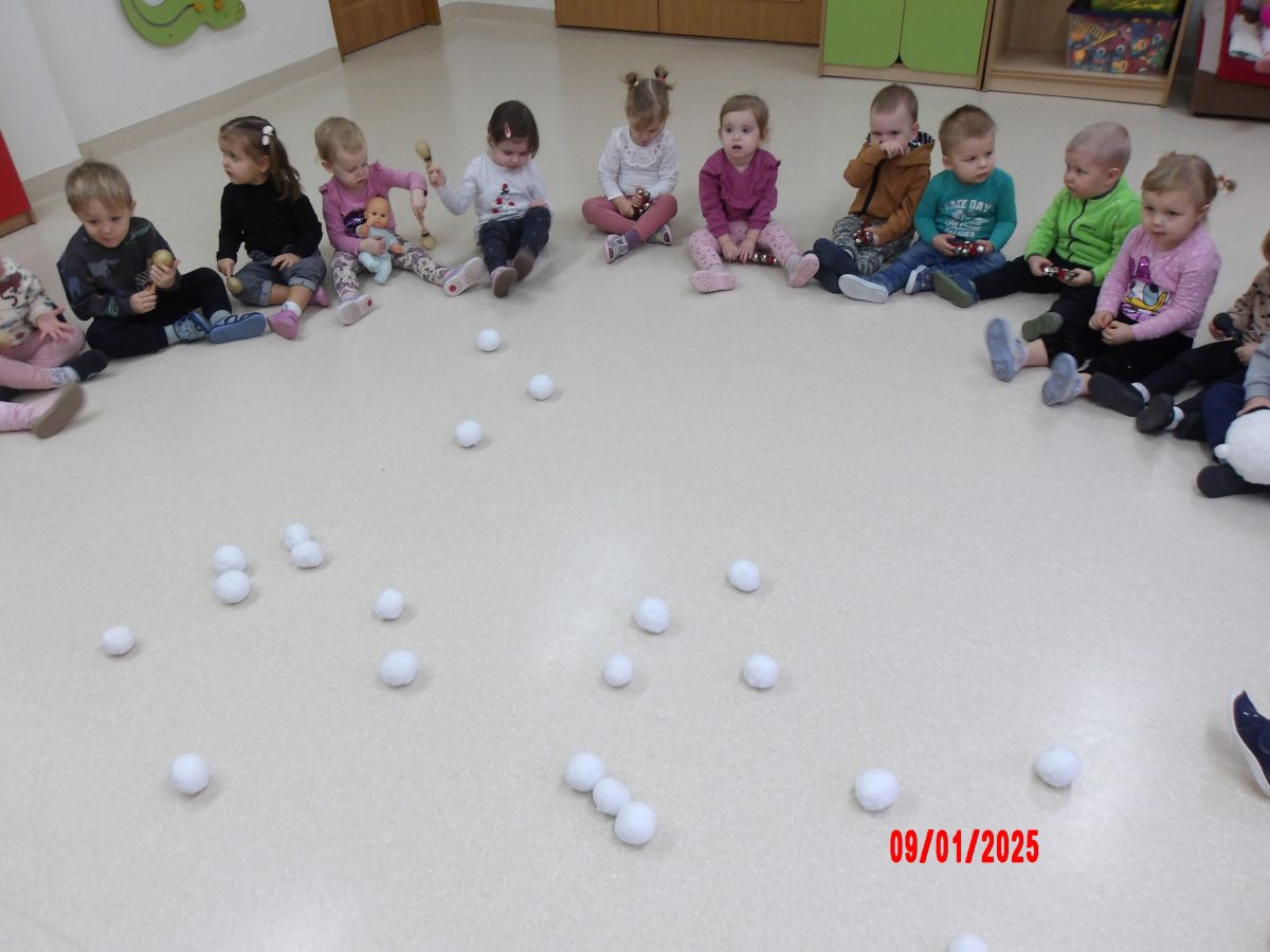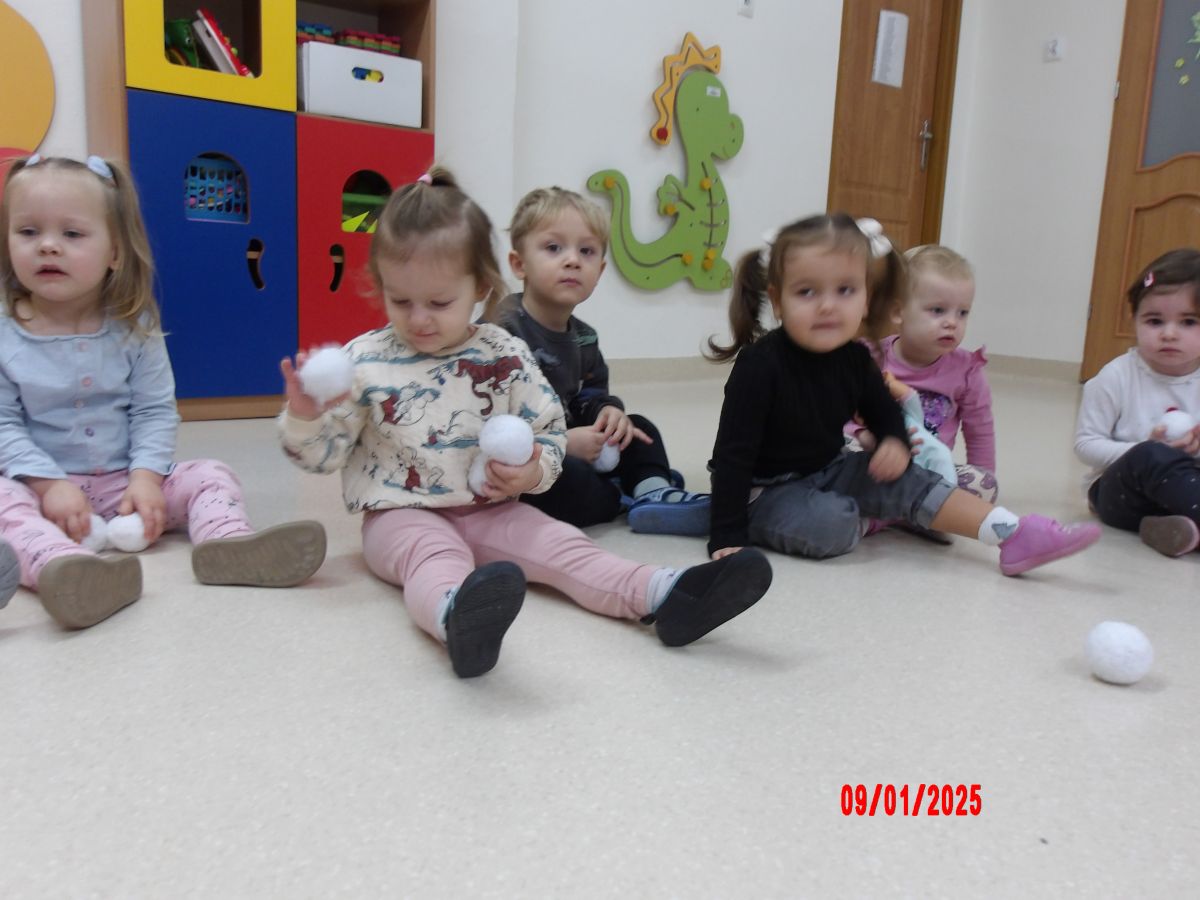 Na zajęciach rytmiki, dzieci w oczekiwaniu na zimę, bawiły się śnieżkami do piosenki "Przyszła zima biała". Muzyczną orkiestrę Średniaczki stworzyły do utworów "Tupu Tup" oraz "Śnieżek prószy".