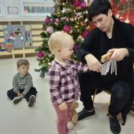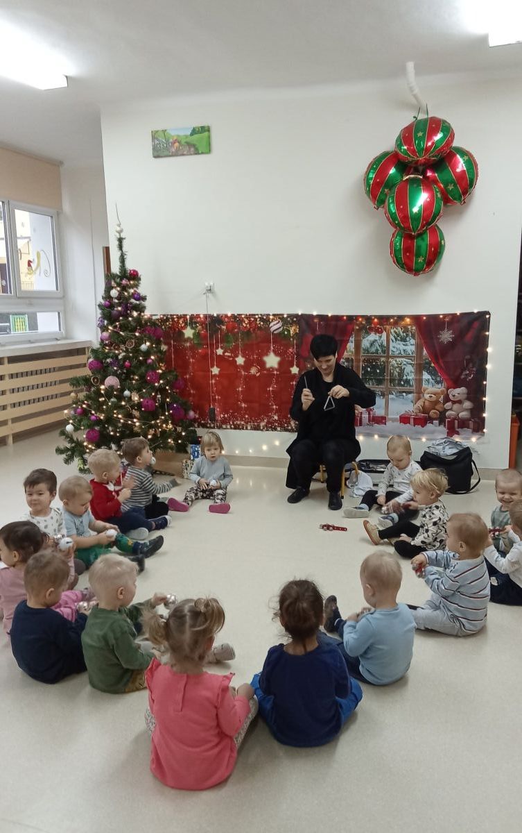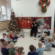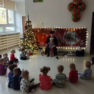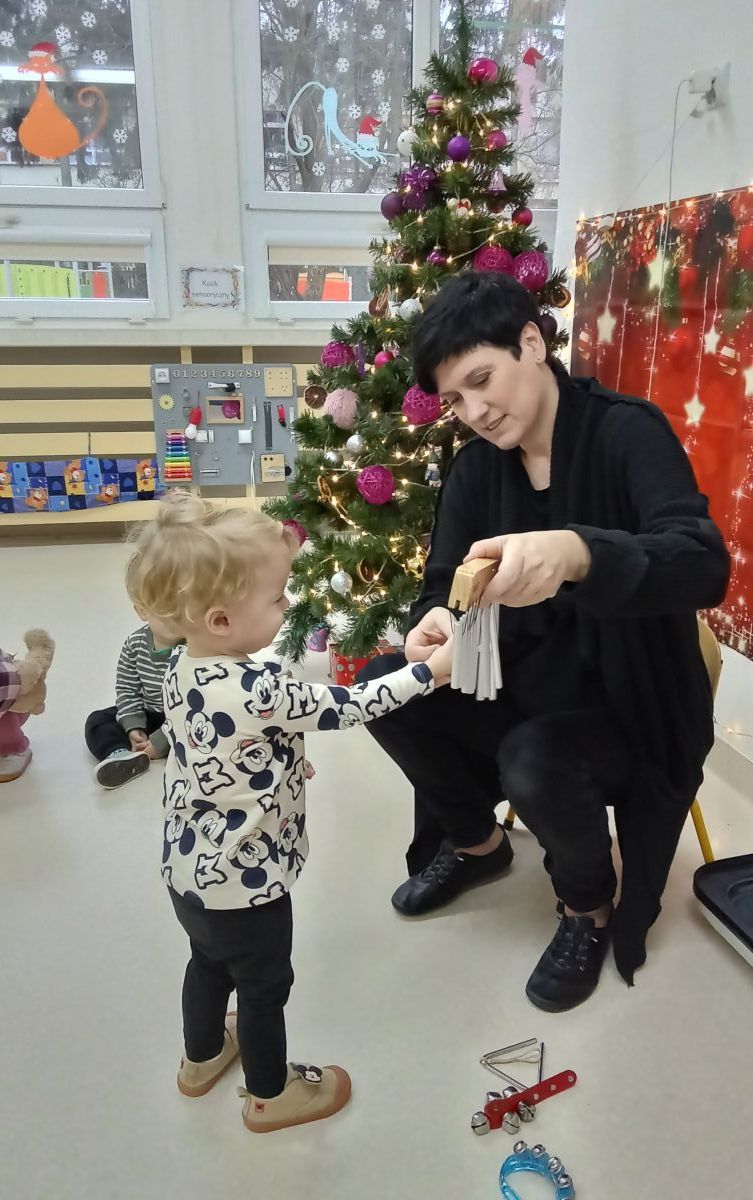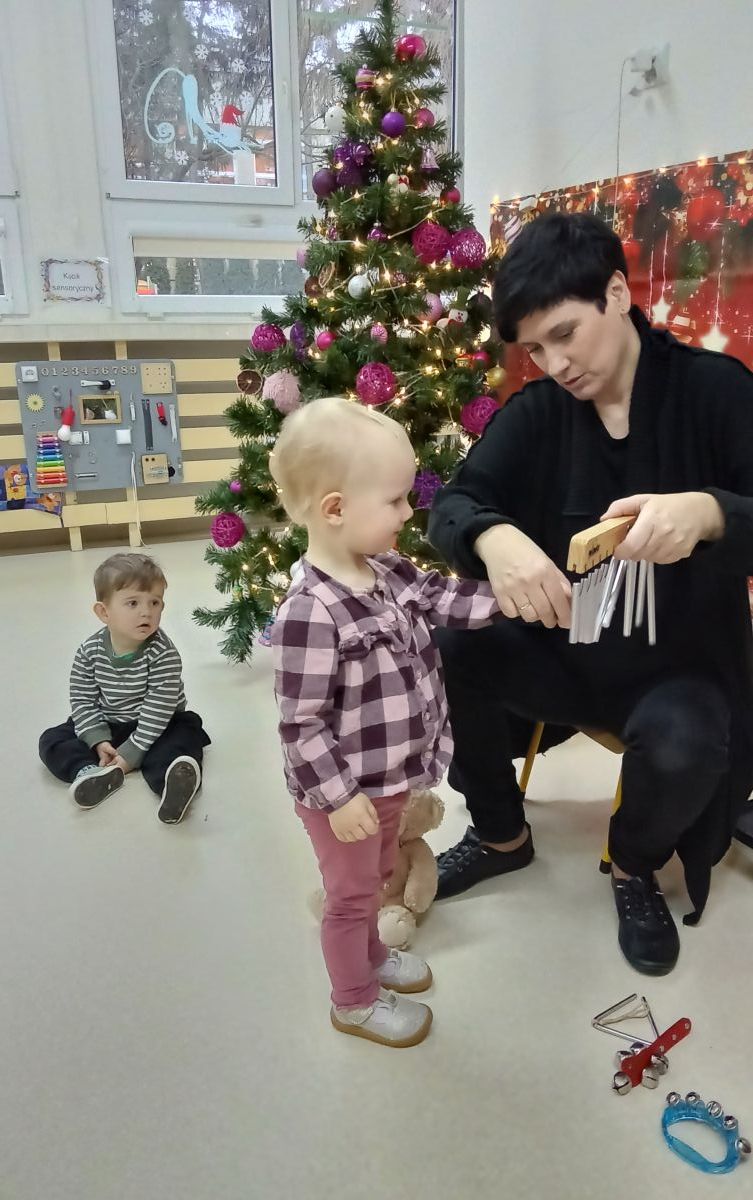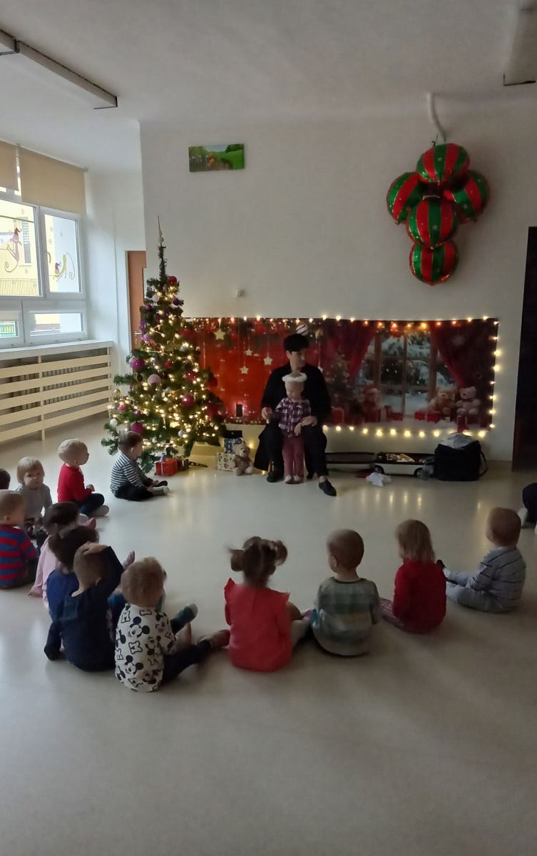 Dzieci wysłuchały bajki pt.: "Po co komu jest potrzebne Boże Narodzenie", a następnie przy choince z dzwoneczkami i aureolkami, uczestniczyły w muzycznych zabawach.
