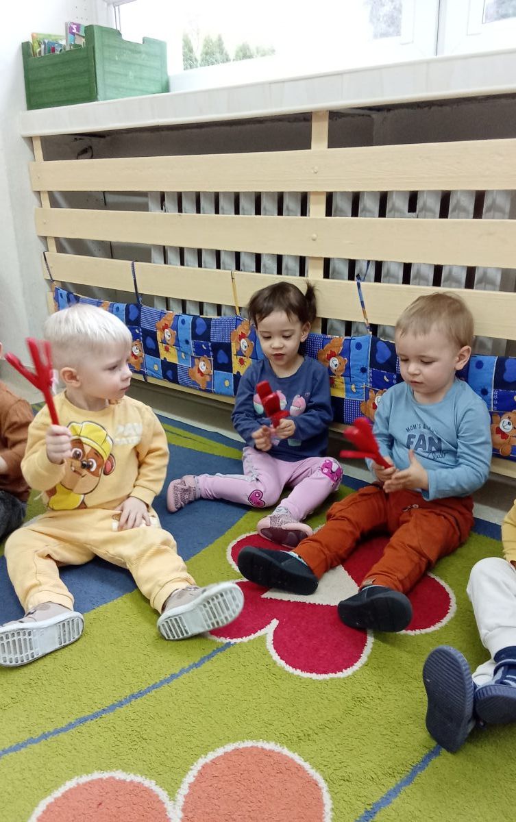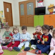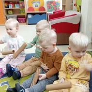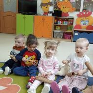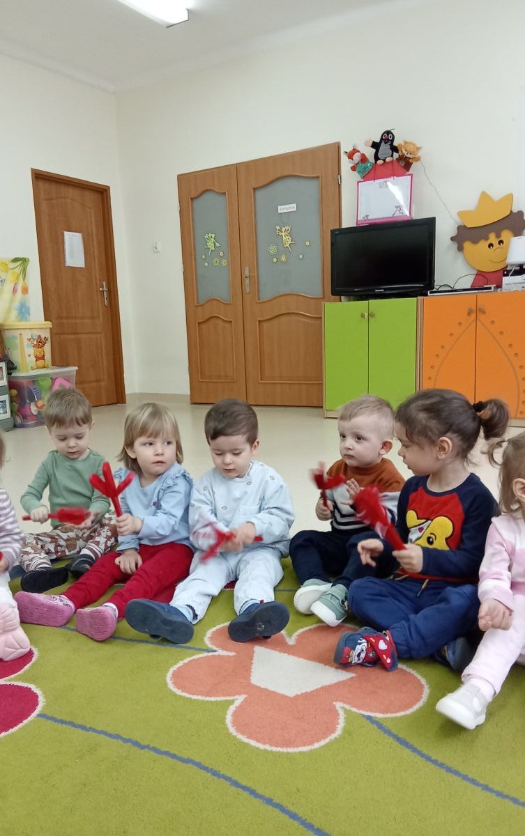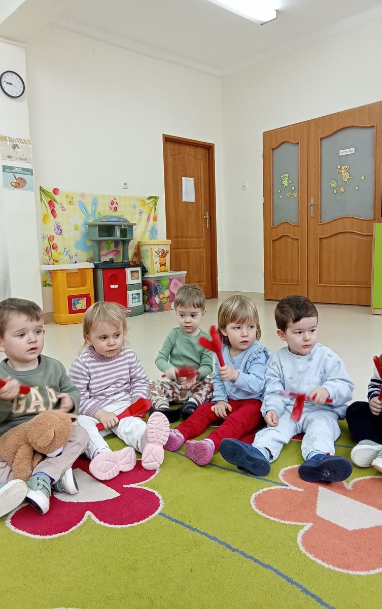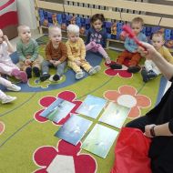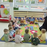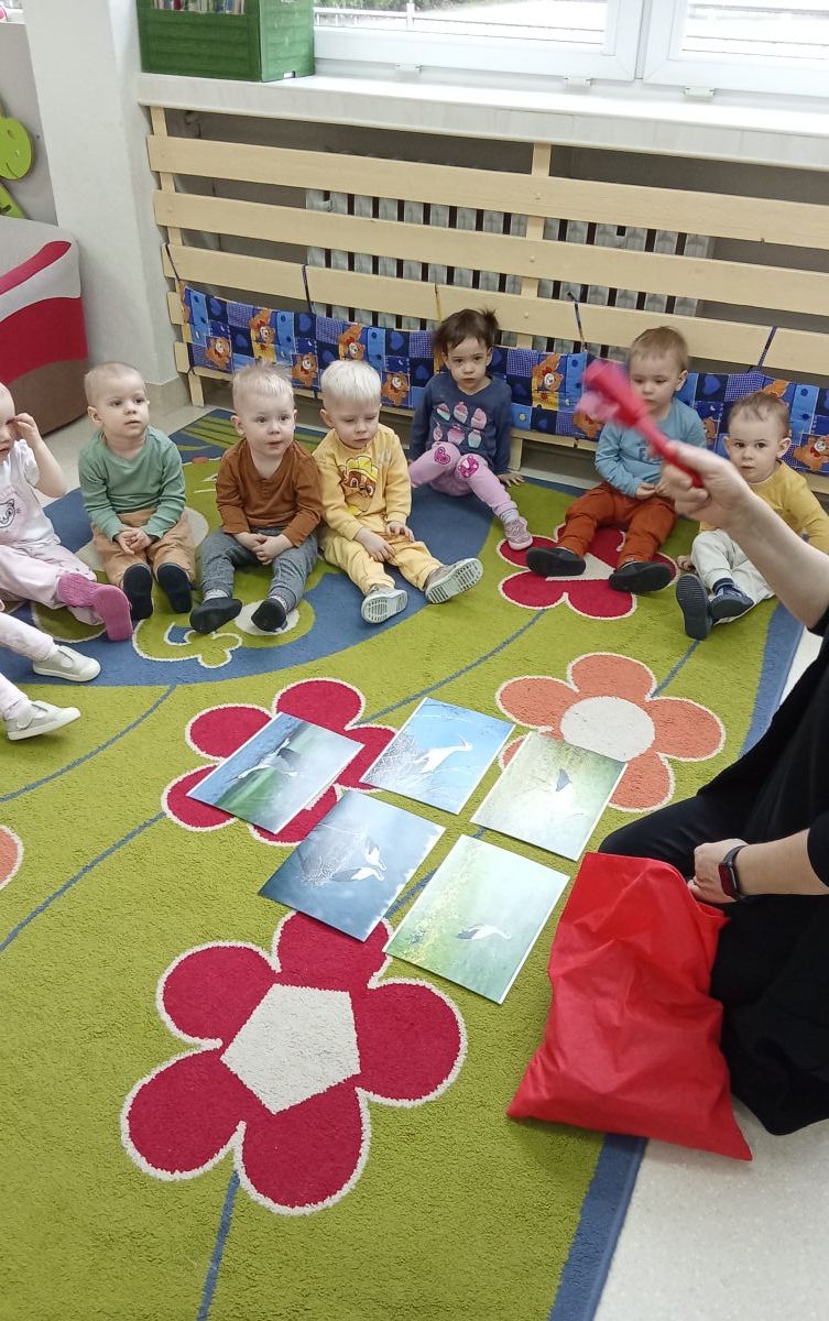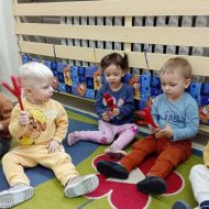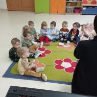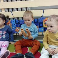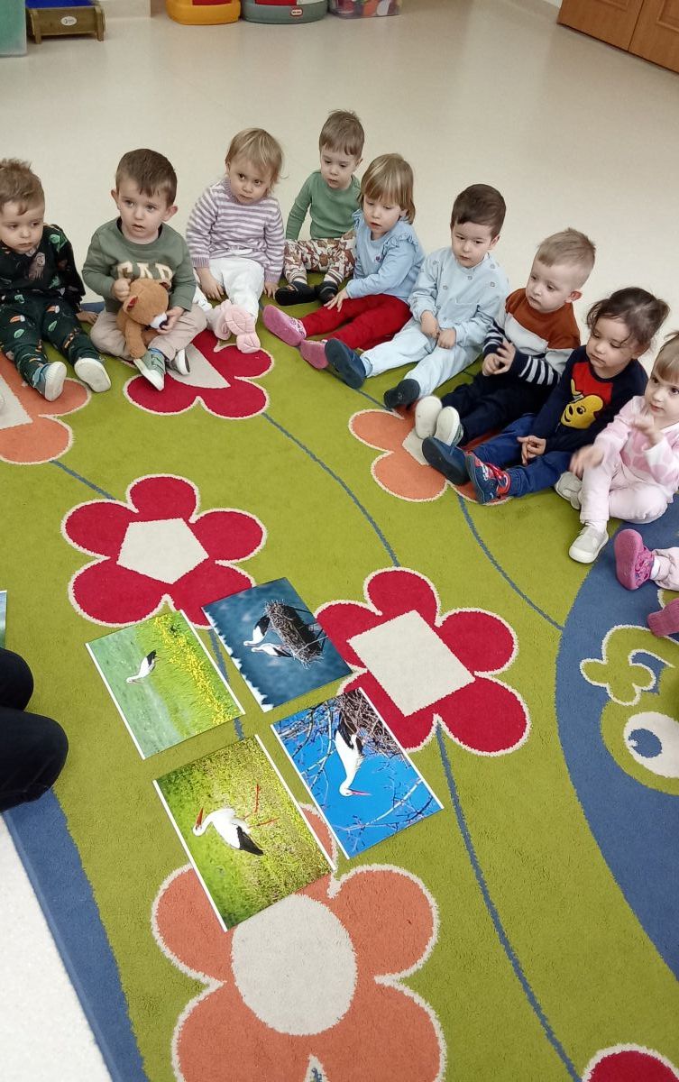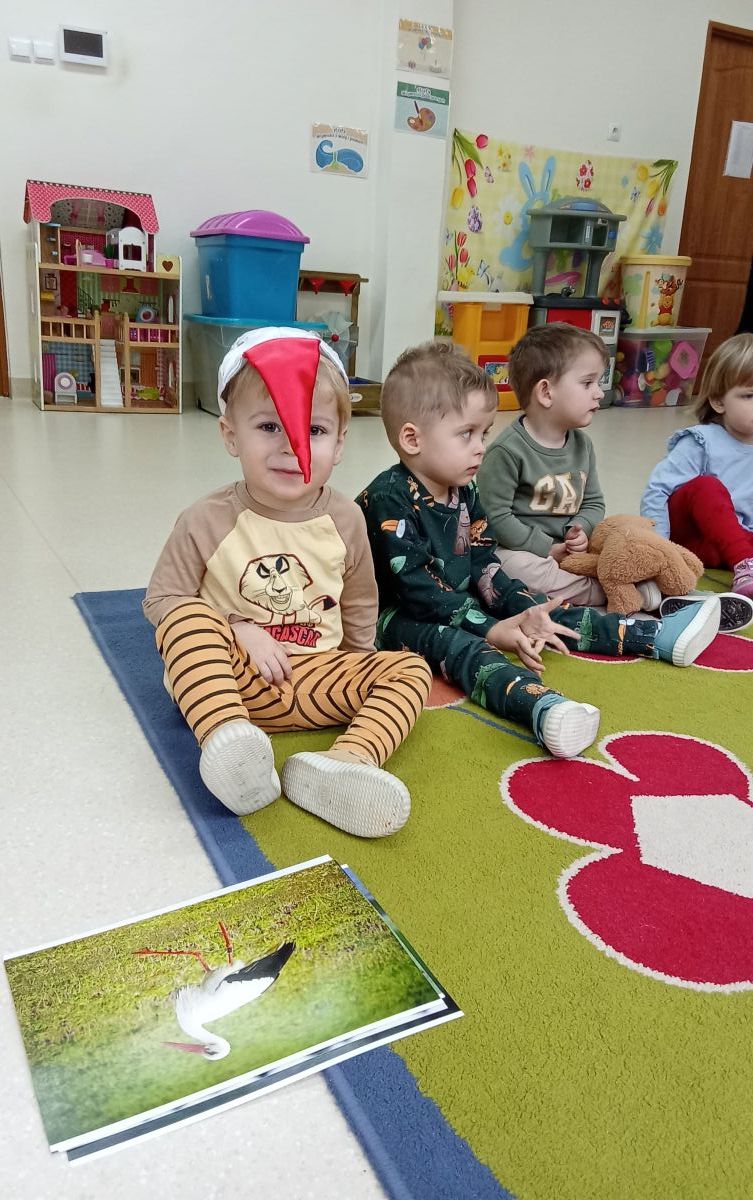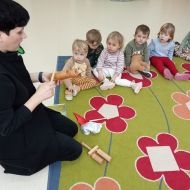 Zabawy z rytmiki przebiegały w wiosennym klimacie. A jak wiosna... to nie mogło zabraknąć ani boćka, ani żabek.