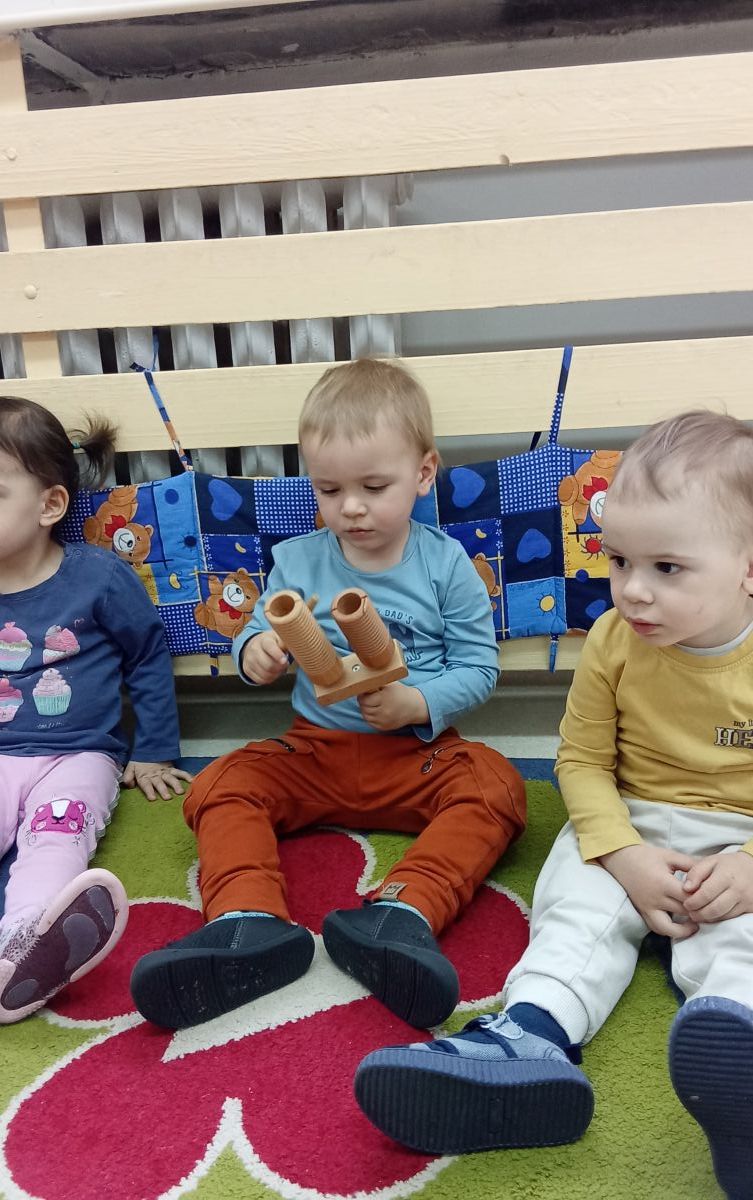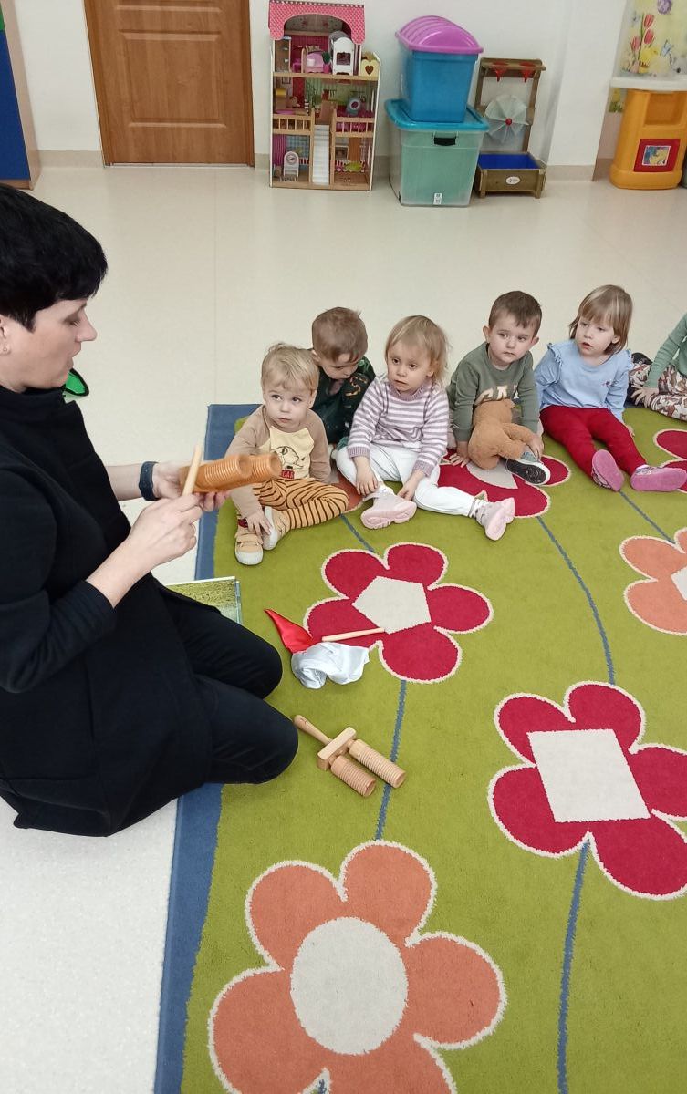 Dzieci poznały instrument, który imitował klekot bociana oraz taki, który wskazywał na żabkę.