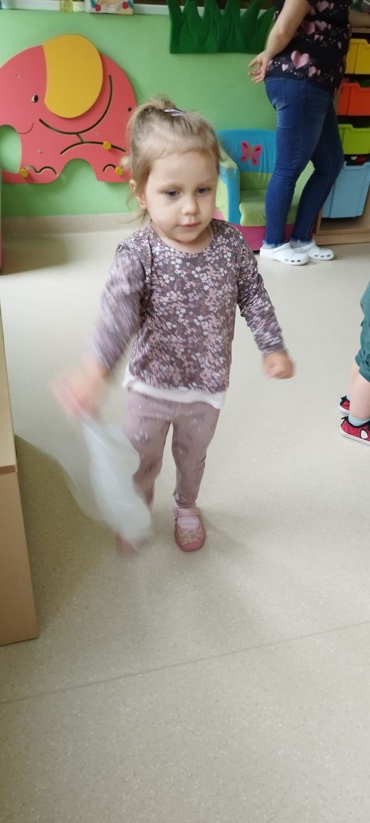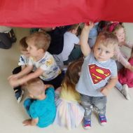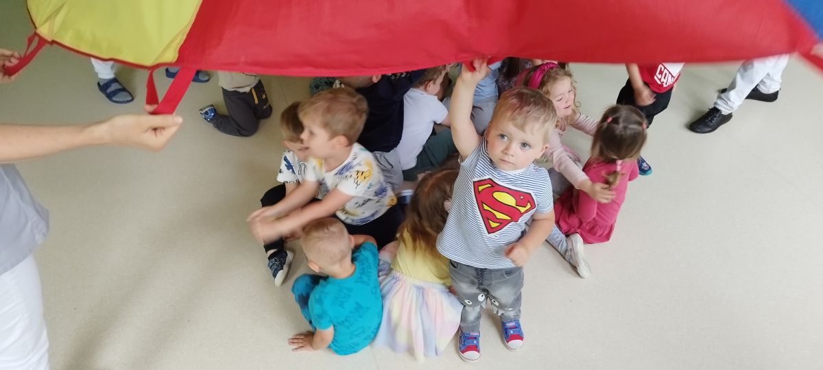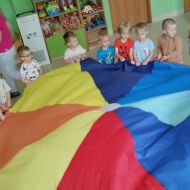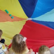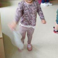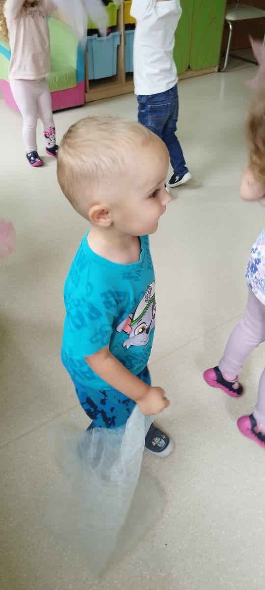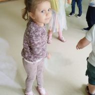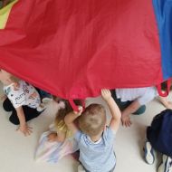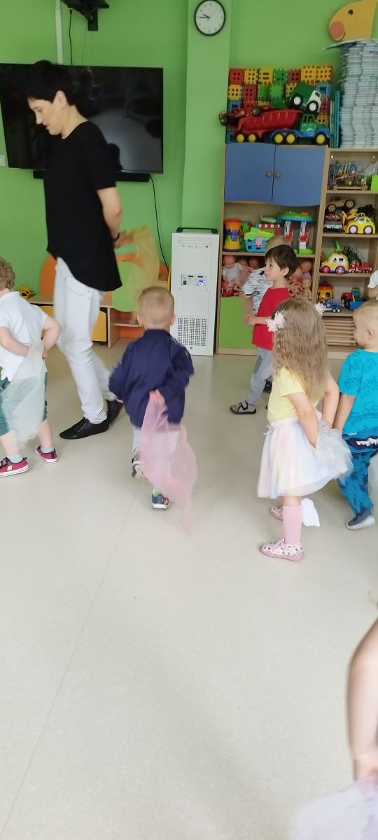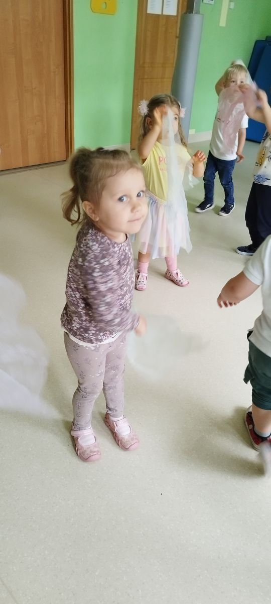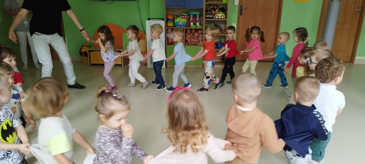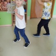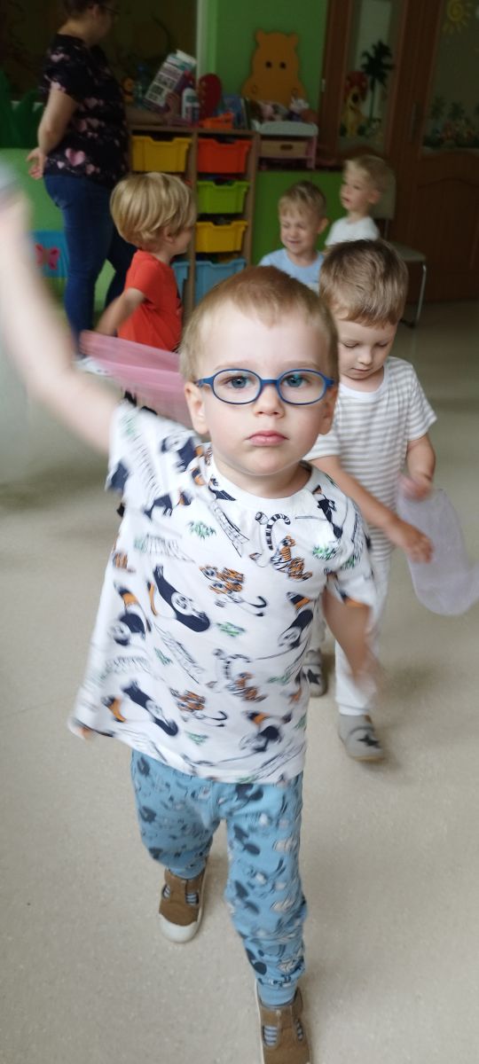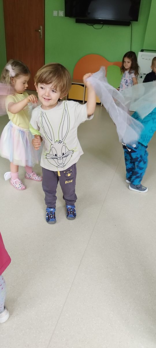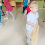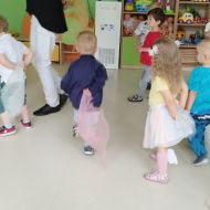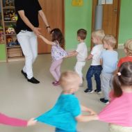 Opublikowano: pon., 06/03/2024 - 14:41 Poniedziałkowe zajęcia z rytmiki upłynęły w temacie Dnia Dziecka. Dzieci tańczyły z kolorowymi chusteczkami, brały udział w zabawach z chustą Klanza, jechały w pociągu. Nie zabrakło również tańców w parach.