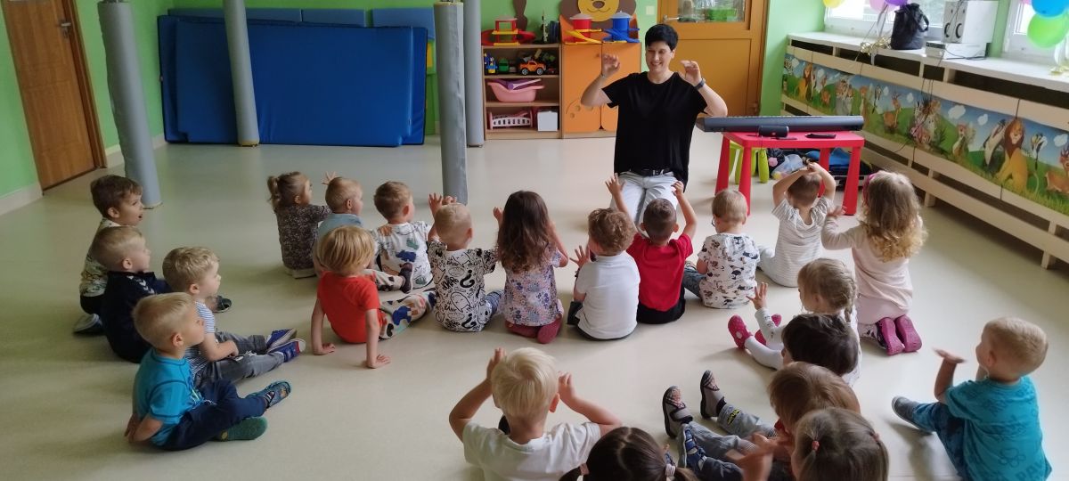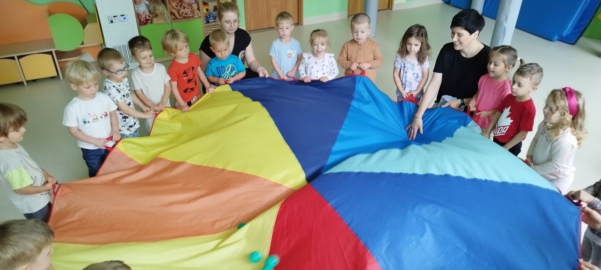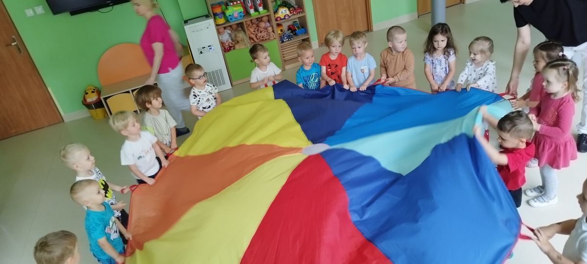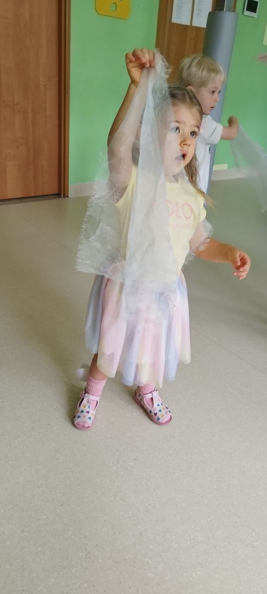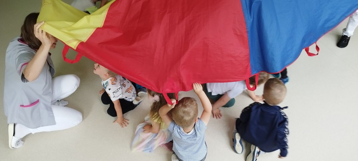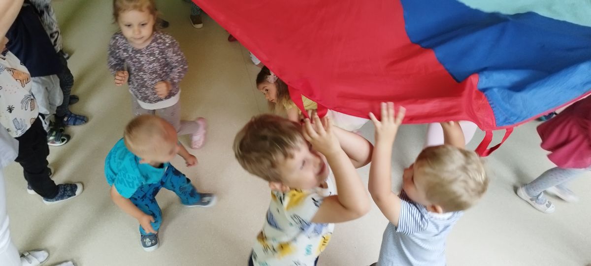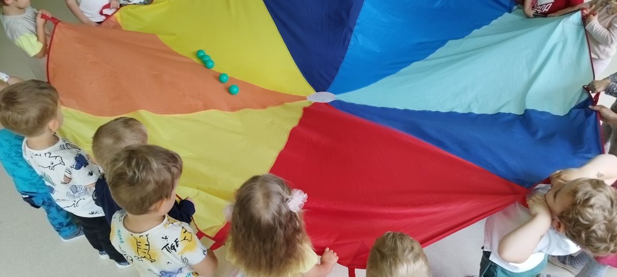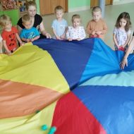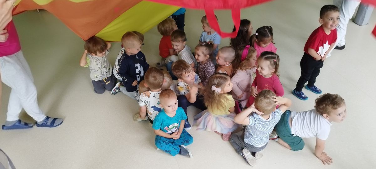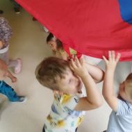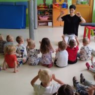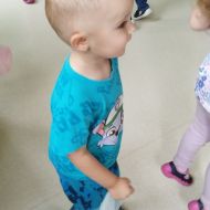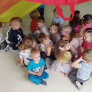 Opublikowano: pon., 06/03/2024 - 14:41 Poniedziałkowe zajęcia z rytmiki upłynęły w temacie Dnia Dziecka. Dzieci tańczyły z kolorowymi chusteczkami, brały udział w zabawach z chustą Klanza, jechały w pociągu. Nie zabrakło również tańców w parach.