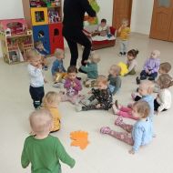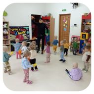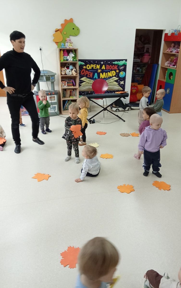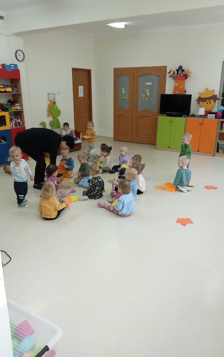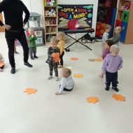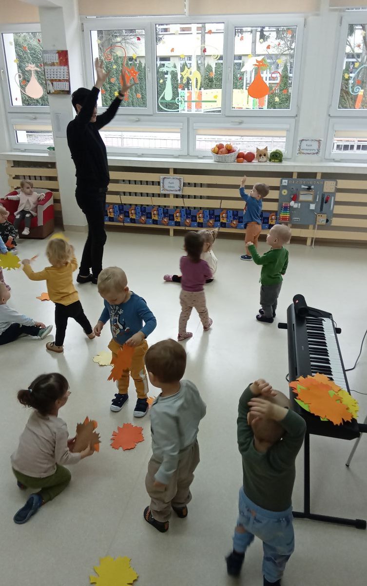 Opublikowano: czw., 11/20/2025 - 14:43 Średniaczki, zachęcone jesienną muzyką, wykonały taniec liści. Dzieci fruwały i wirowały razem z listkami.Do zajęć wykorzystano m.in. piosenki: "Opowieść jesiennych listków", "Jesienna polka", "Kolorowe listki" oraz "Idzie jeżyk".