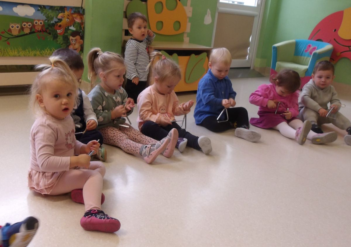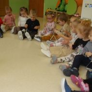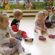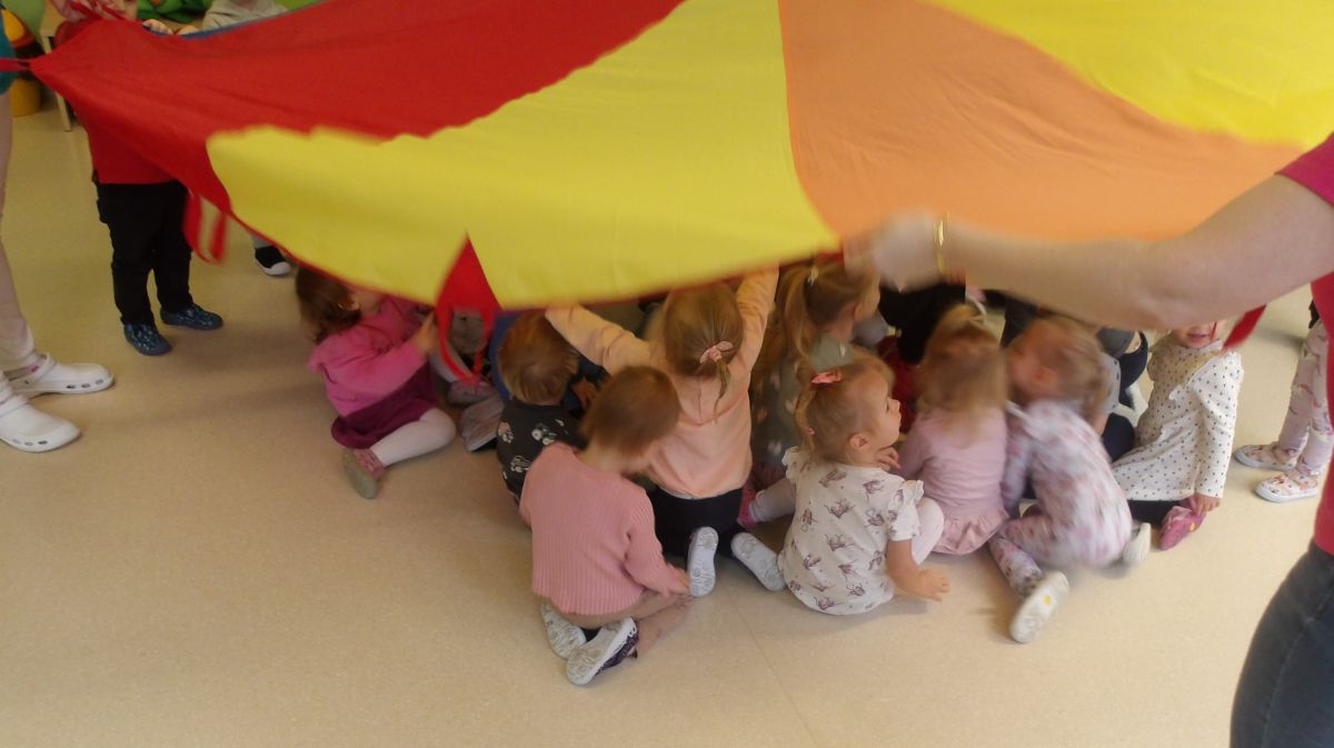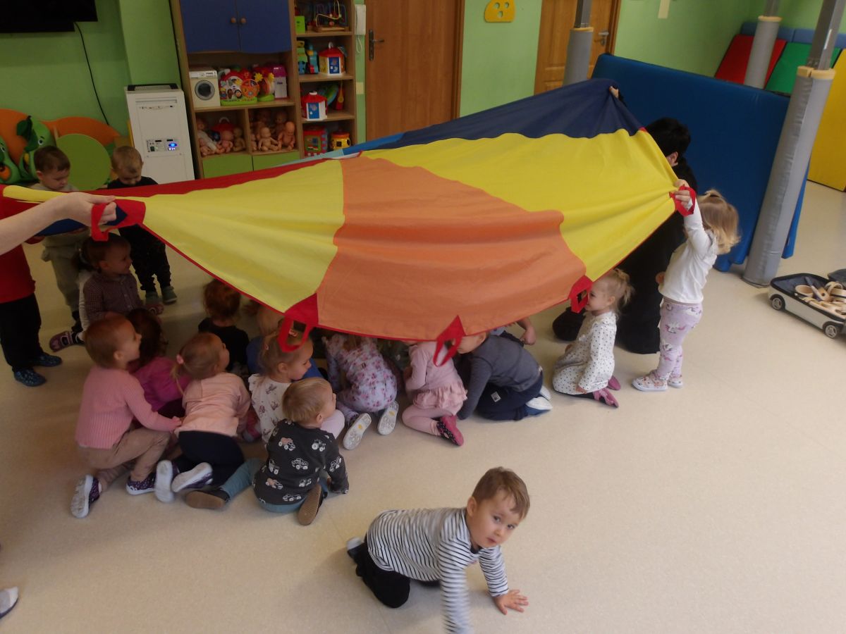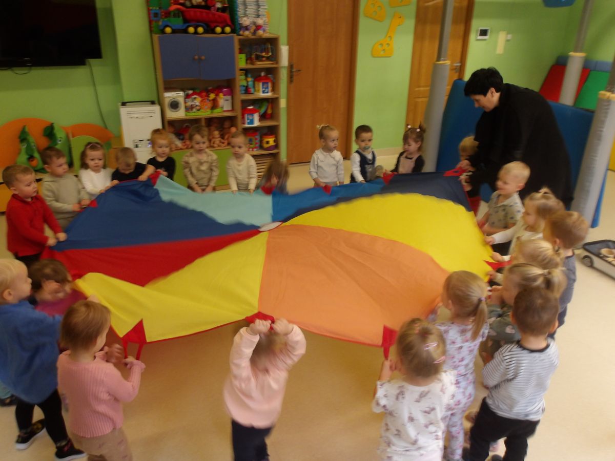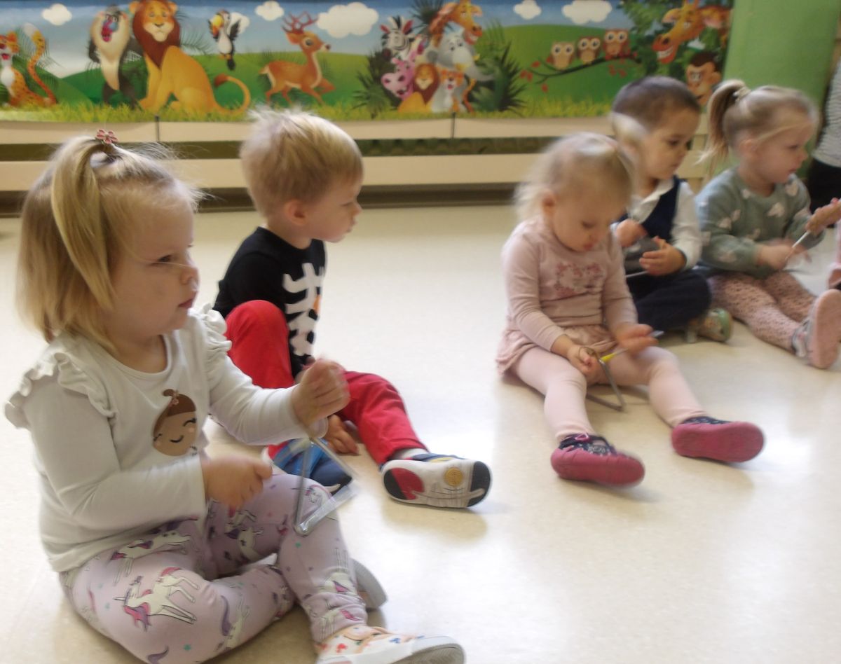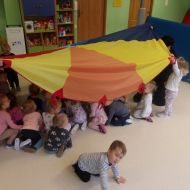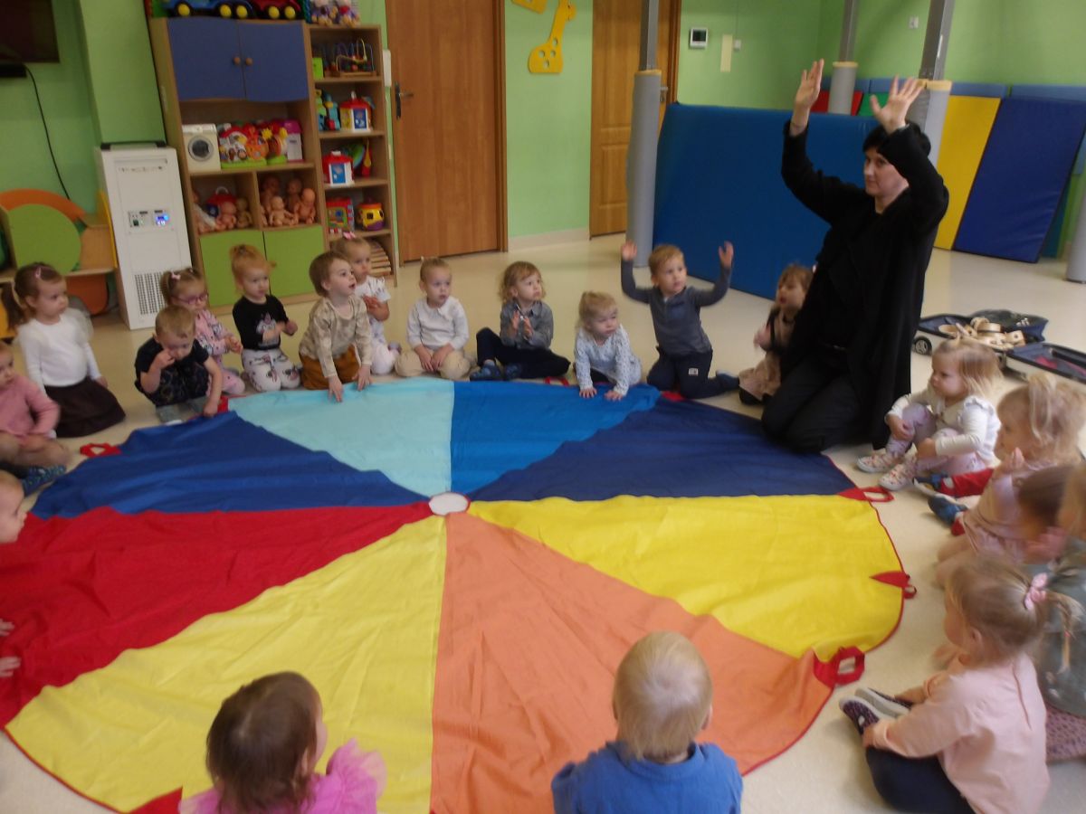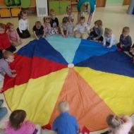 Opublikowano: pon., 11/18/2024 - 14:02 Podczas rytmiki dzieci chowały się przed deszczem pod chustą animacyjną, '' Listopadową piosenkę '' zagrały na trójkątach oraz spacerowały po kałużach do piosenki " Kałużowy deszczyk ".