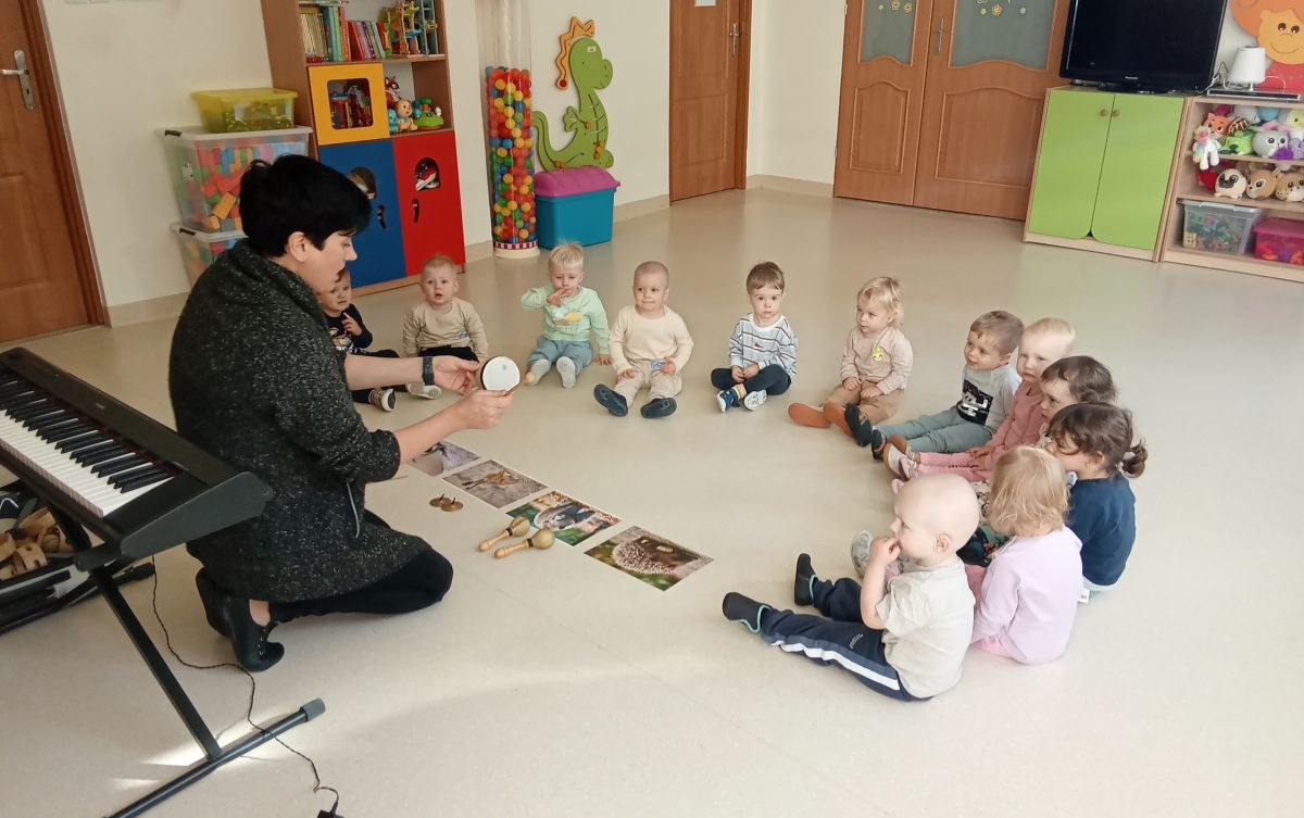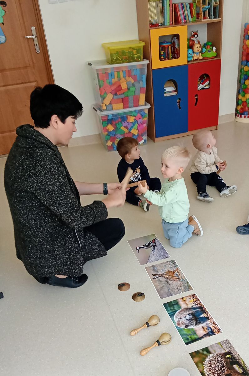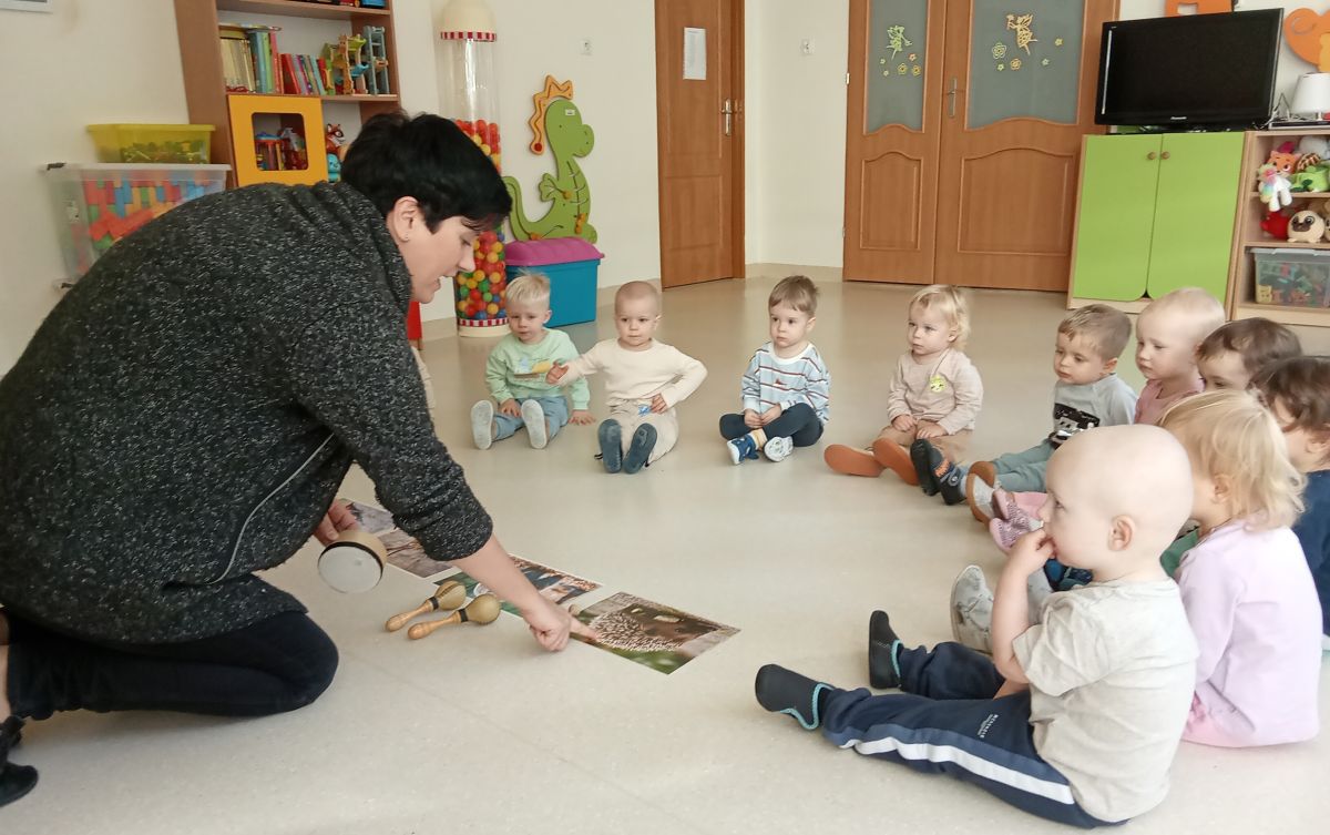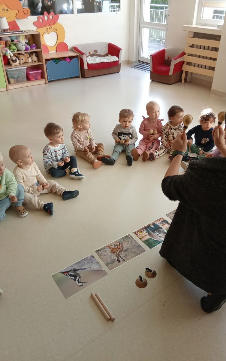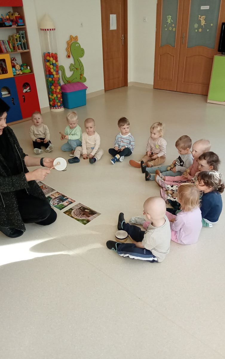 Opublikowano: czw., 11/06/2025 - 08:31 Jesienna rytmika przebiegała przy piosenkach: "Mały jeżyk" oraz "Panie Kasztanie Perkusisto!".Dzieci razem z jeżykiem grały na bębenku, z niedźwiadkiem na grzechotkach, z zajączkiem na talerzach, a z dzięciołem na klawesynie.