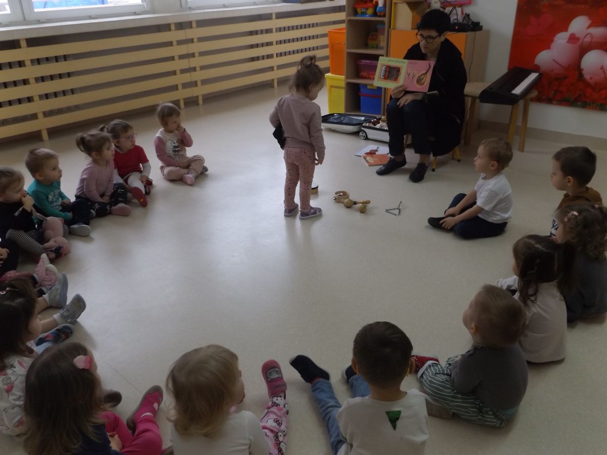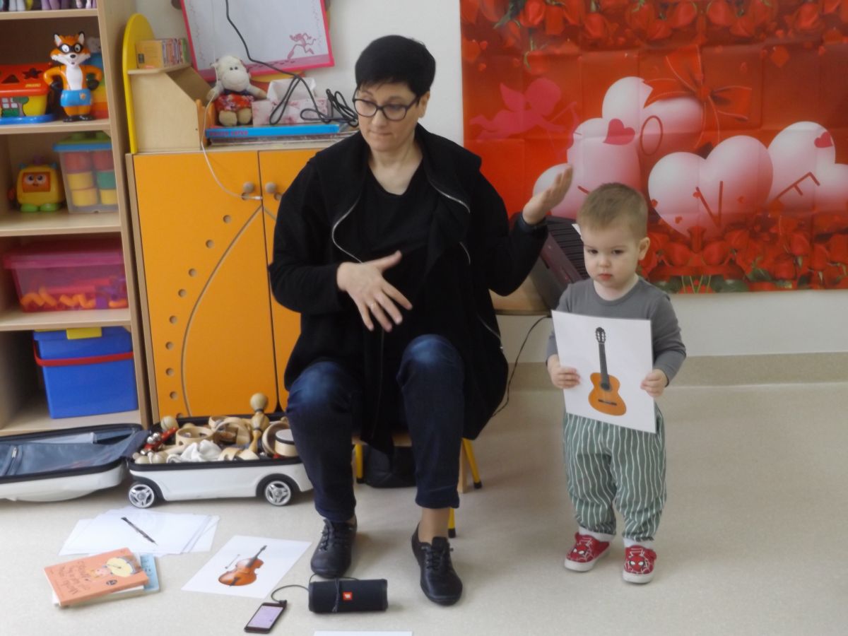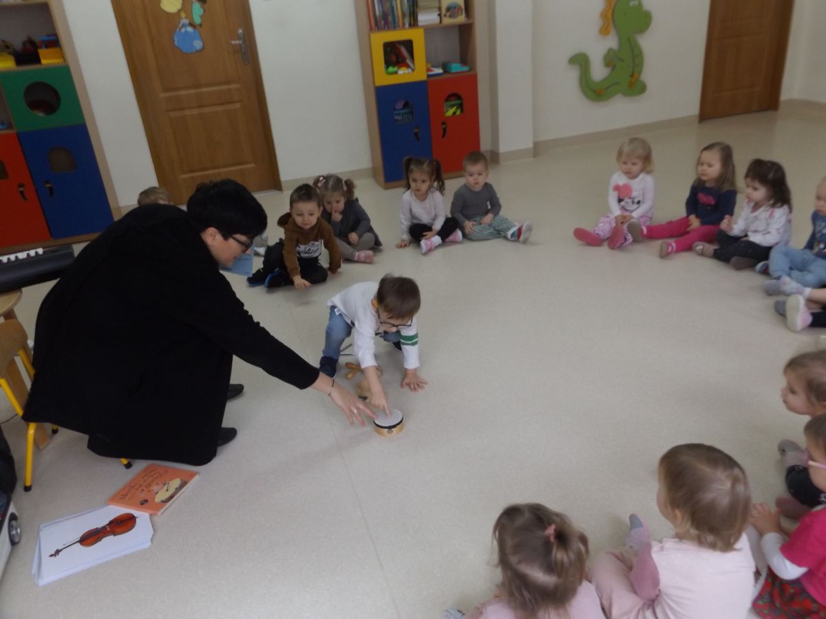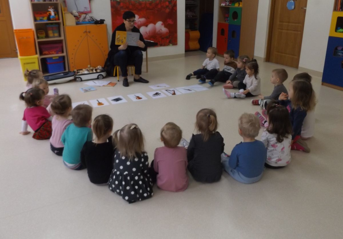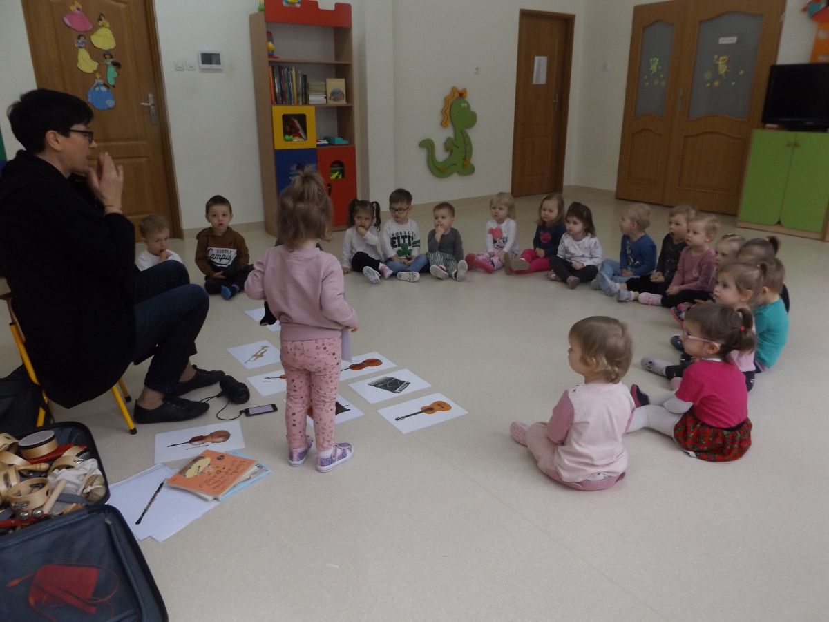 Dzieci oglądały książeczki z instrumentami, odgadywały nazwy instrumentów z usłyszanych dźwięków, słuchały instrumentów, a także ćwiczyły do słyszanych melodii.
