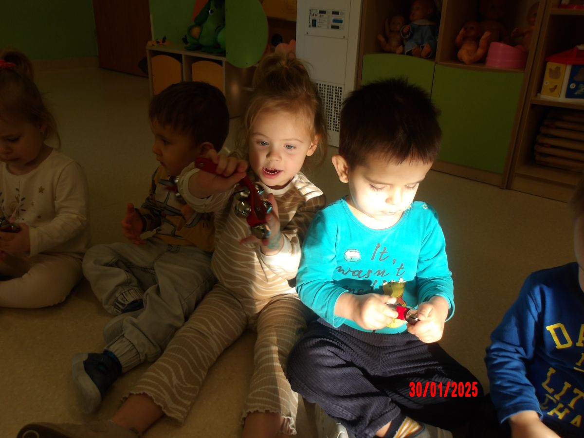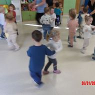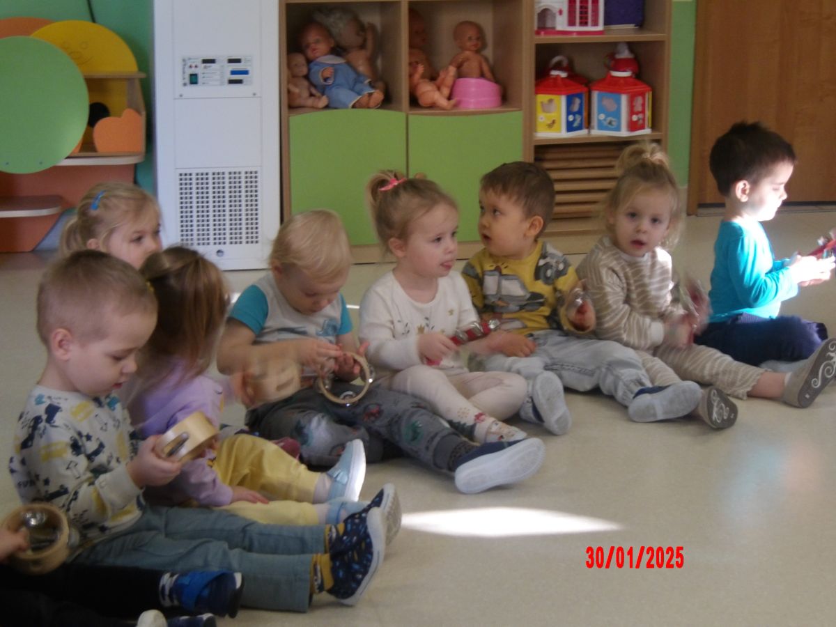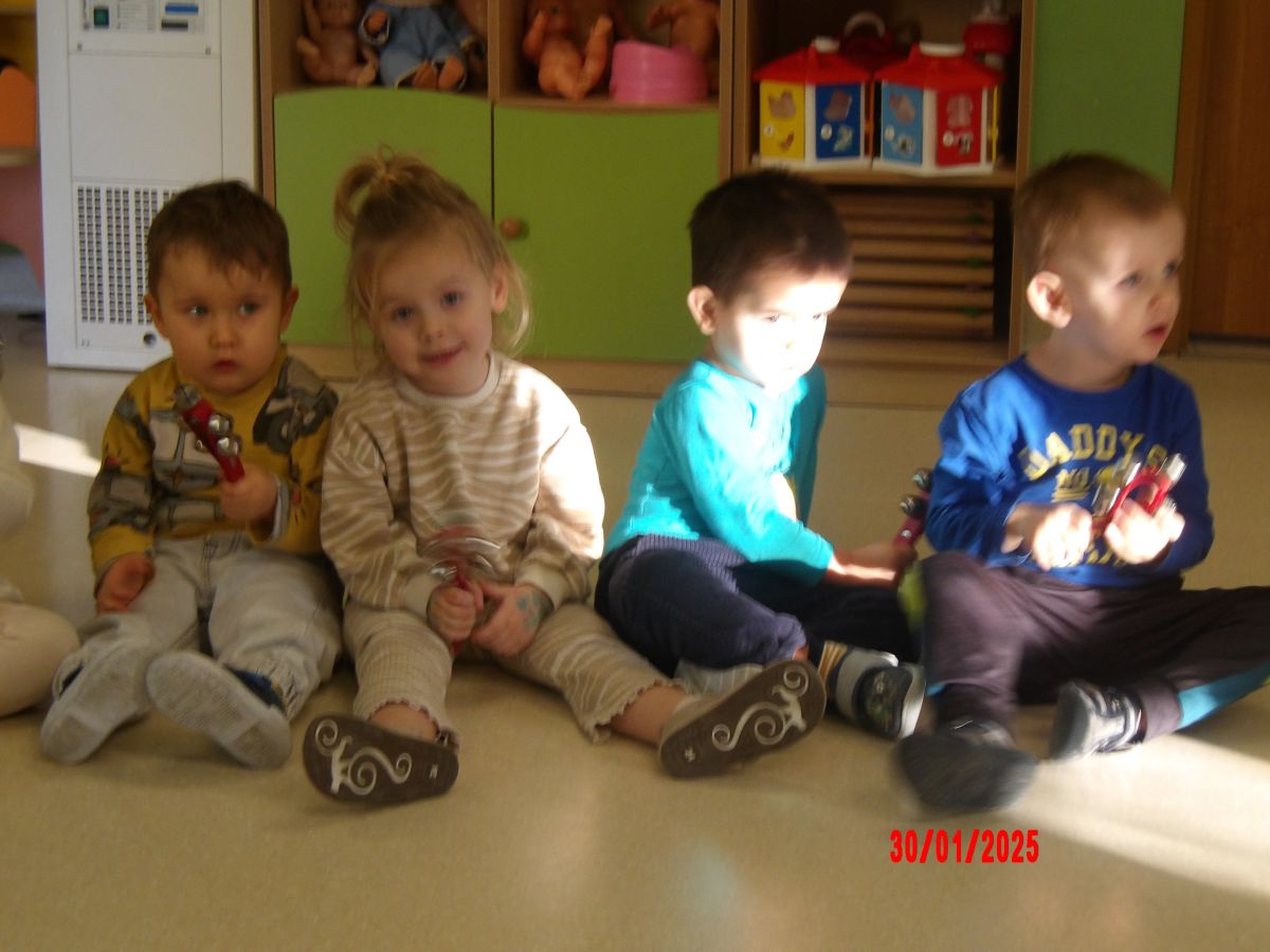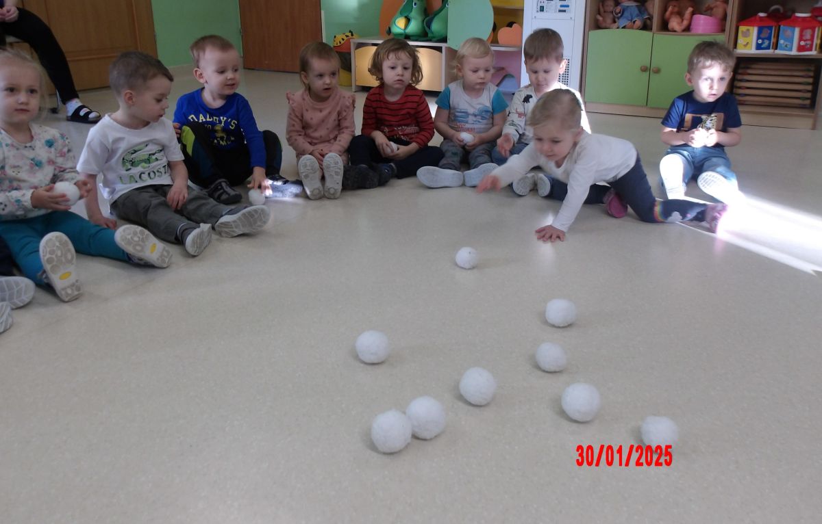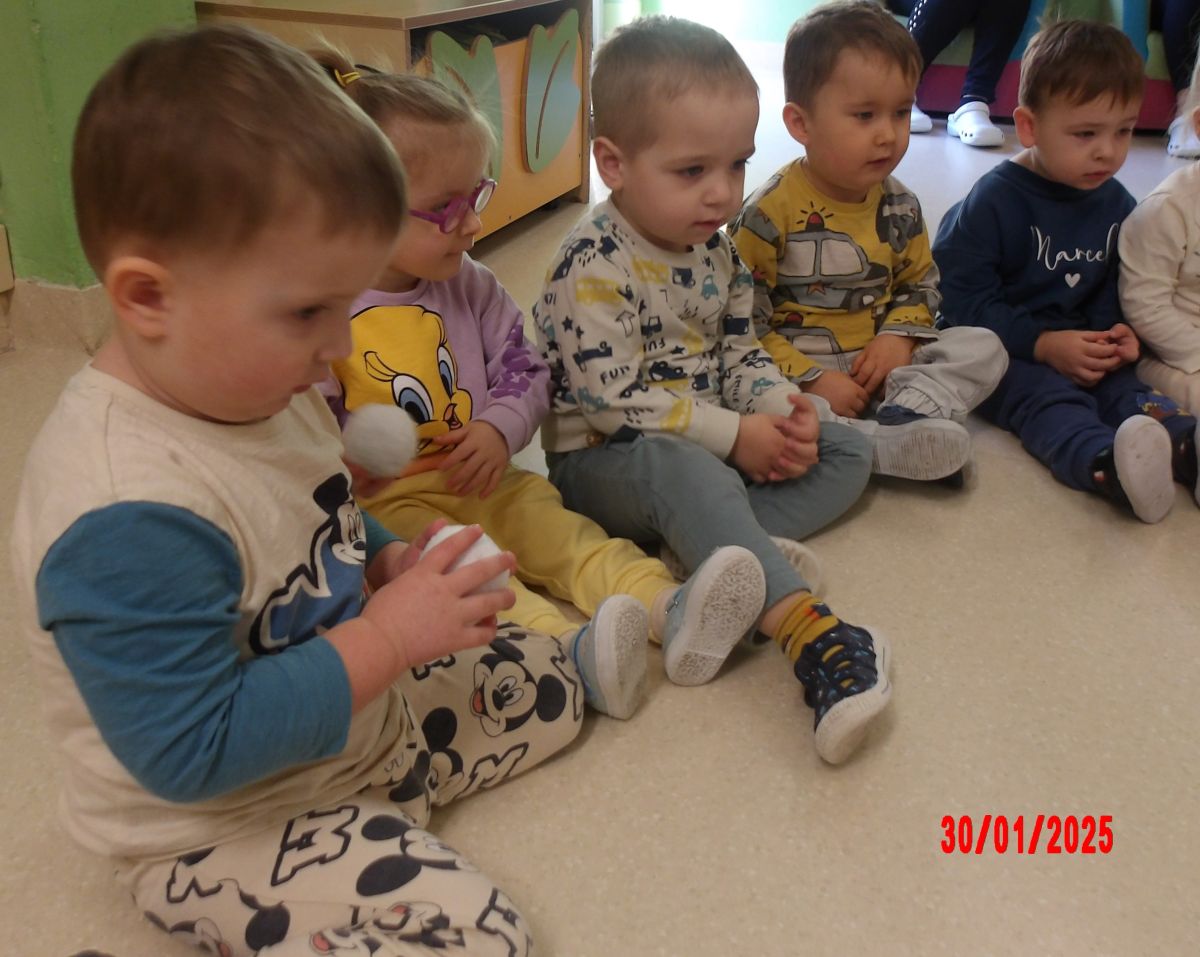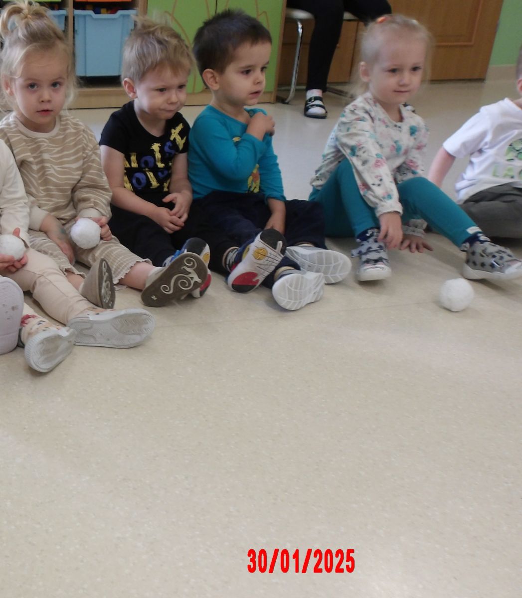 Rzucanie śnieżkami do utworu " Buch w śnieżny puch ", zabawa we wróbelki , taniec w parach oraz saneczki to atrakcje, które towarzyszyły dziś dzieciakom podczas rytmiki. Grały także na instrumentach do piosenek " Zima, zima, zima " i " Dzwonki sań ".