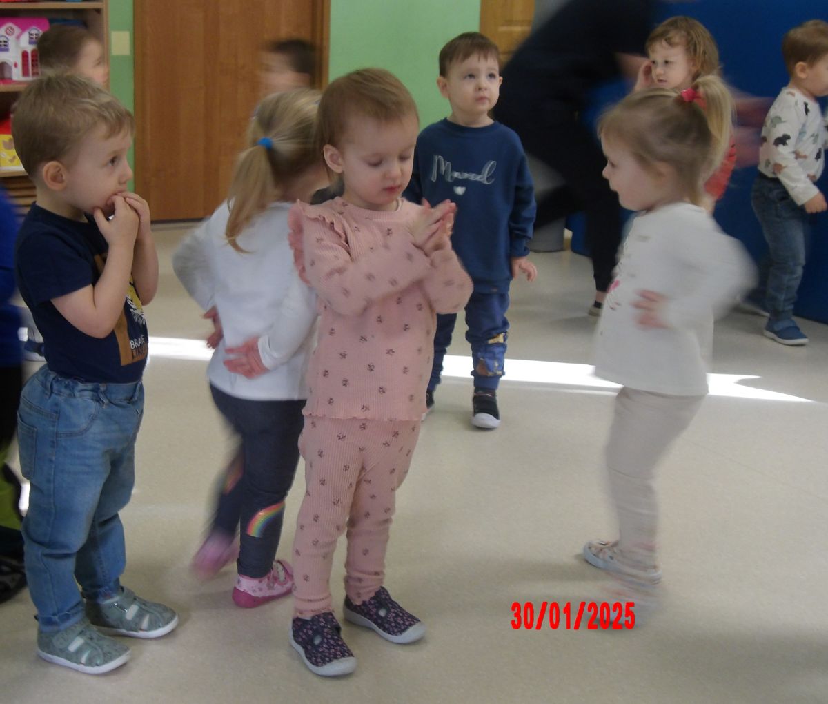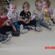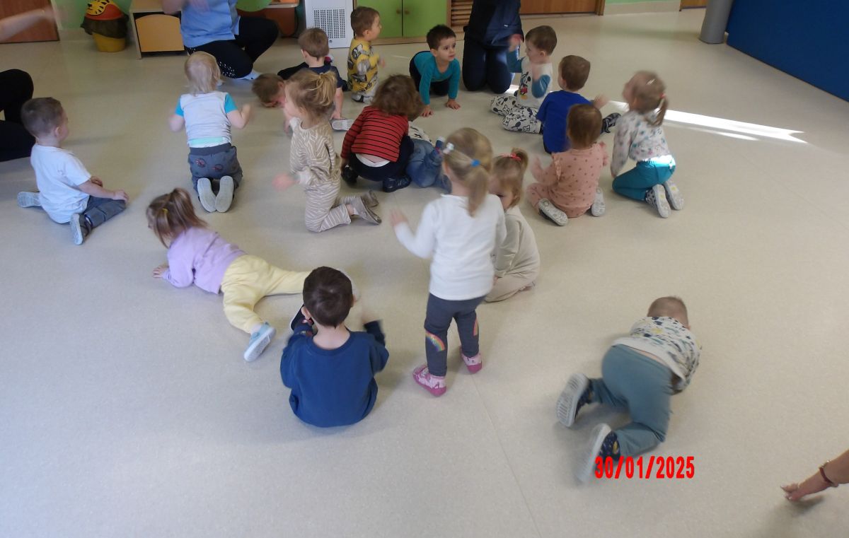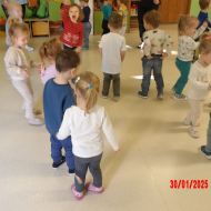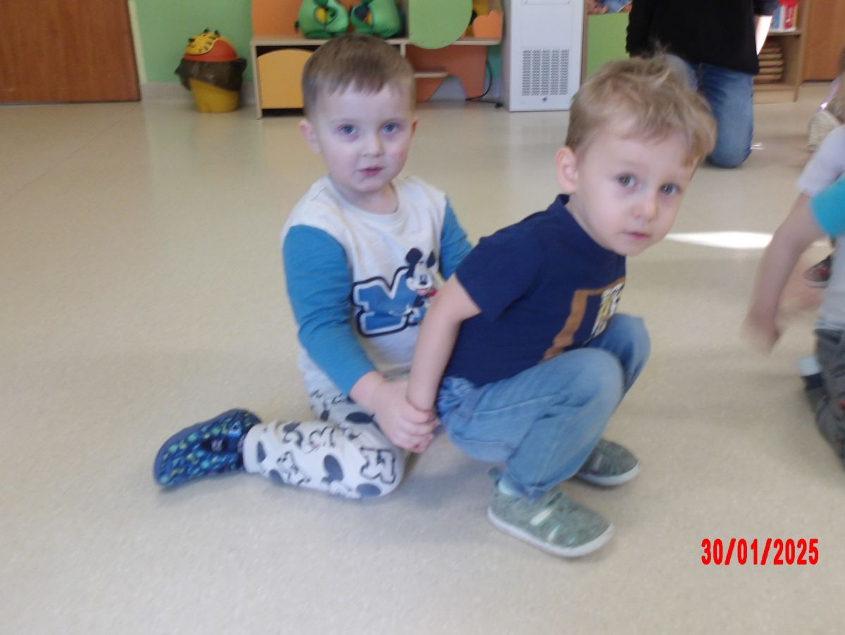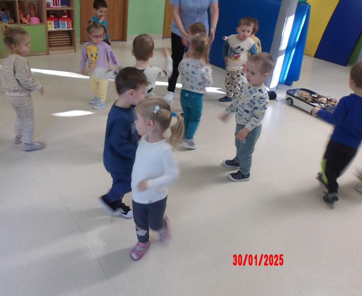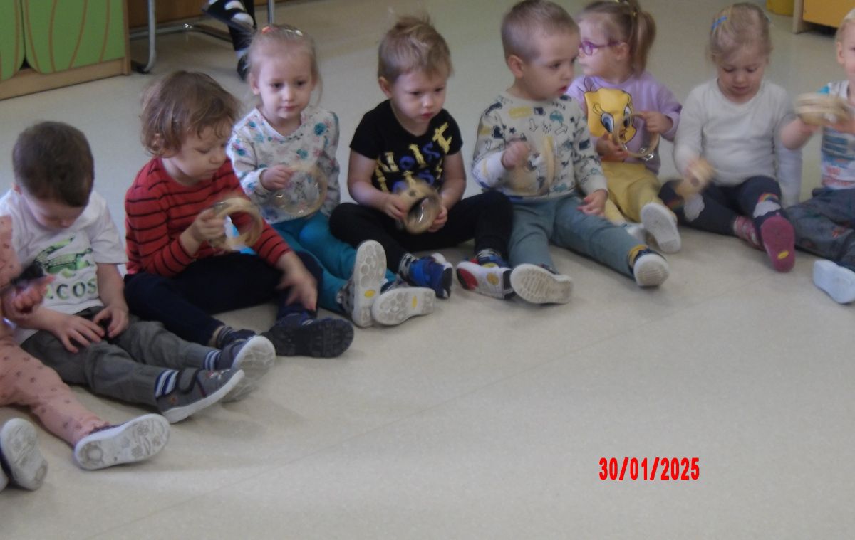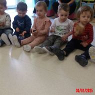 Rzucanie śnieżkami do utworu " Buch w śnieżny puch ", zabawa we wróbelki , taniec w parach oraz saneczki to atrakcje, które towarzyszyły dziś dzieciakom podczas rytmiki. Grały także na instrumentach do piosenek " Zima, zima, zima " i " Dzwonki sań ".