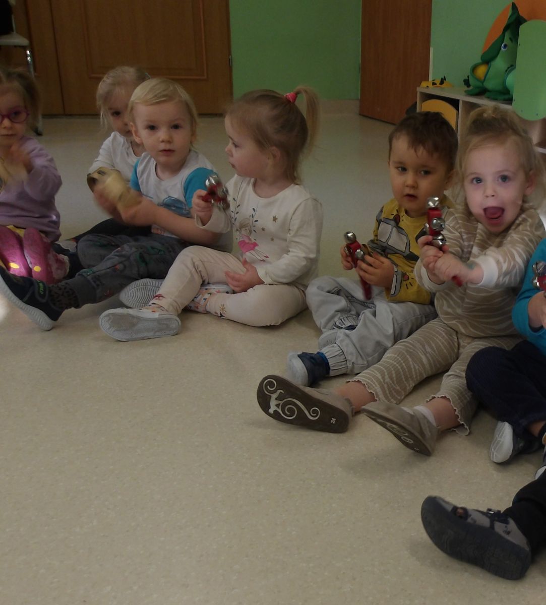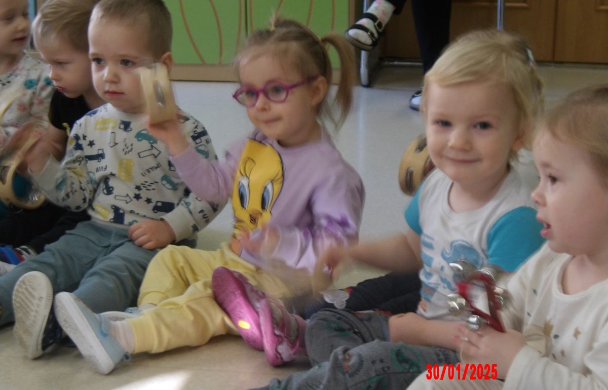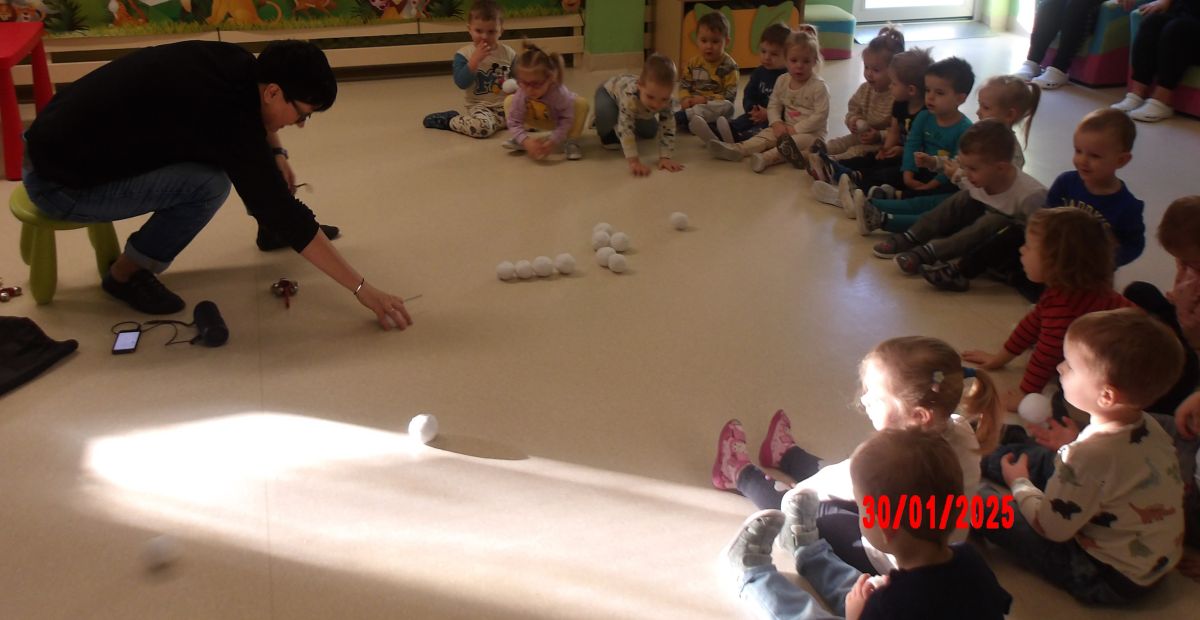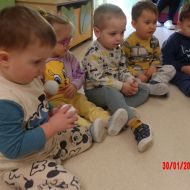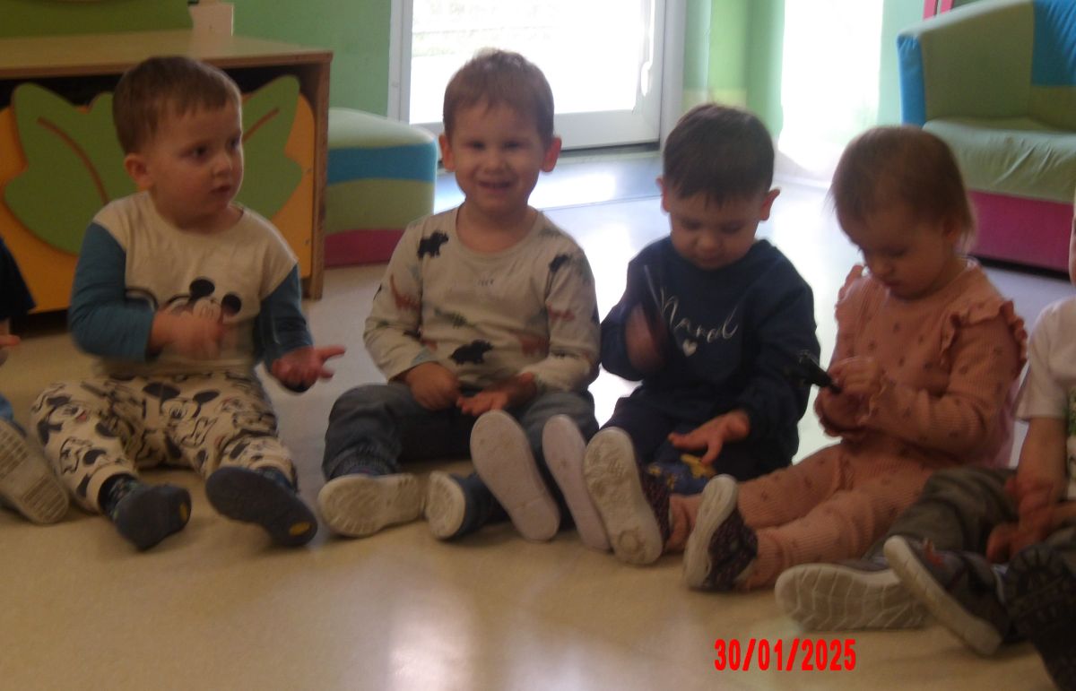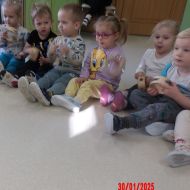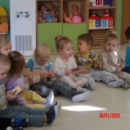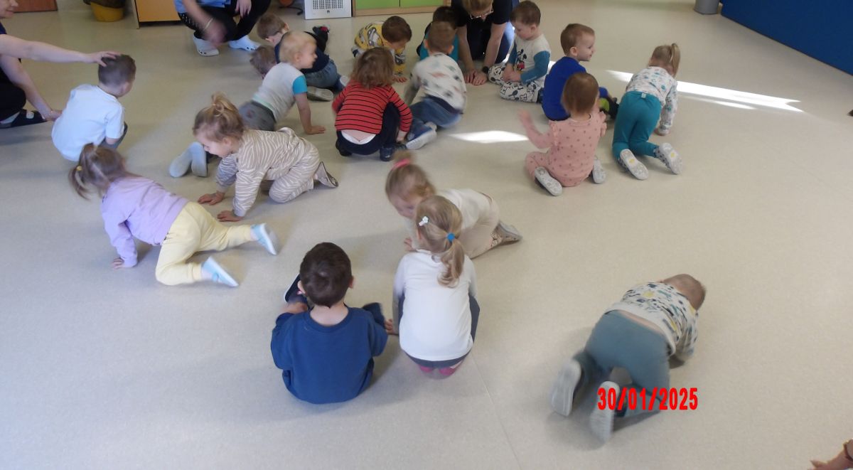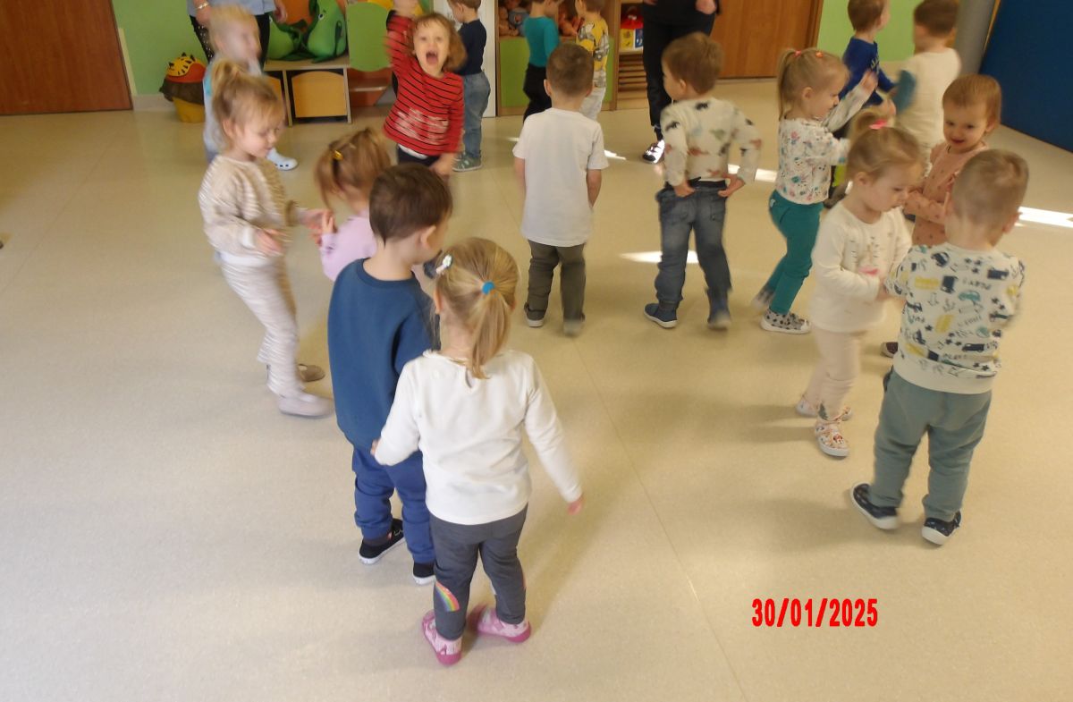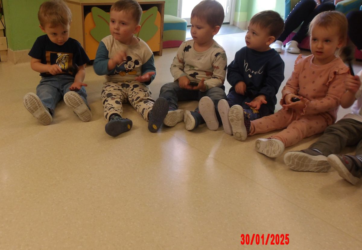 Rzucanie śnieżkami do utworu " Buch w śnieżny puch ", zabawa we wróbelki , taniec w parach oraz saneczki to atrakcje, które towarzyszyły dziś dzieciakom podczas rytmiki. Grały także na instrumentach do piosenek " Zima, zima, zima " i " Dzwonki sań ".