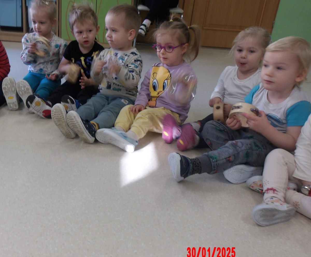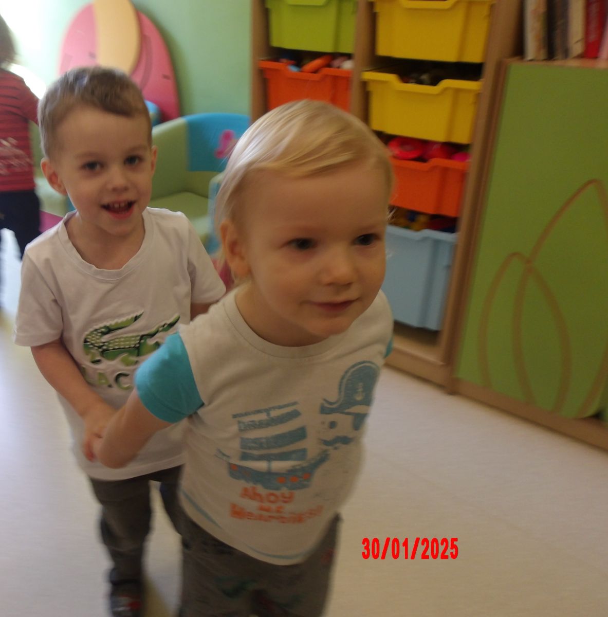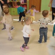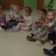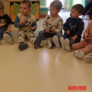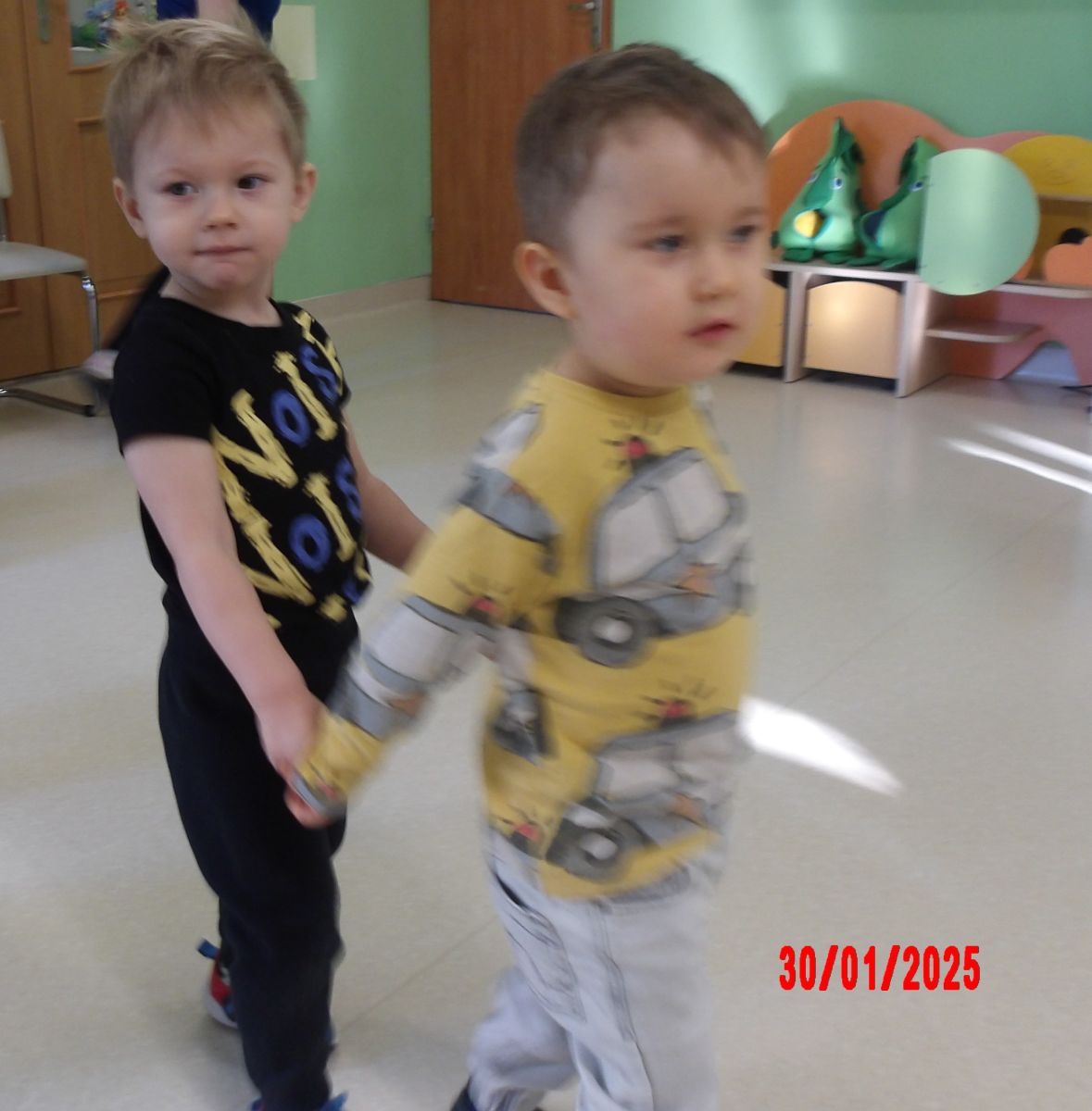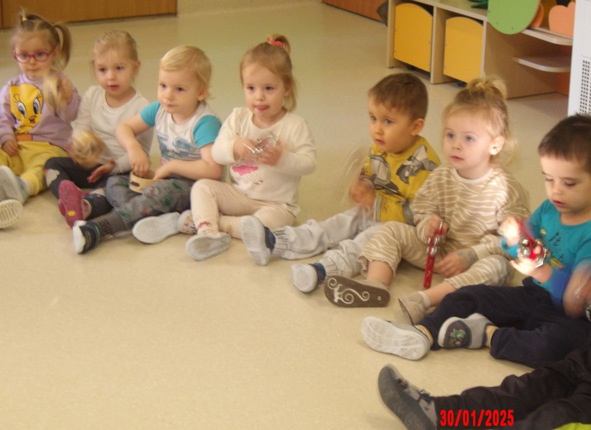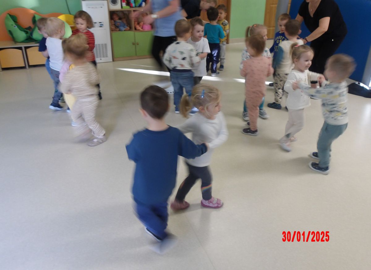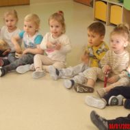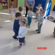 Rzucanie śnieżkami do utworu " Buch w śnieżny puch ", zabawa we wróbelki , taniec w parach oraz saneczki to atrakcje, które towarzyszyły dziś dzieciakom podczas rytmiki. Grały także na instrumentach do piosenek " Zima, zima, zima " i " Dzwonki sań ".