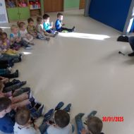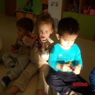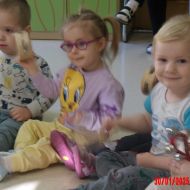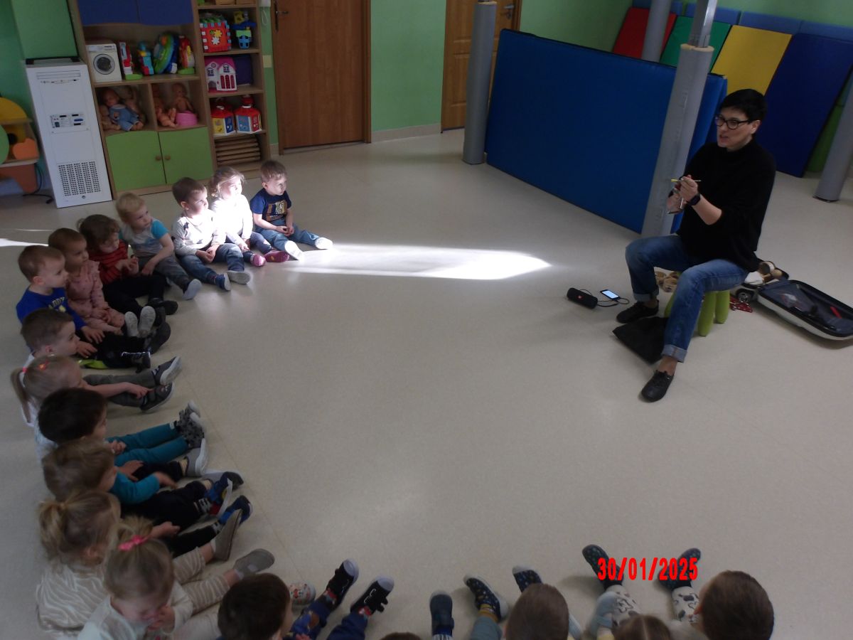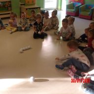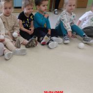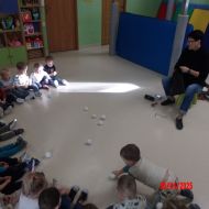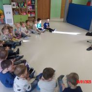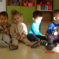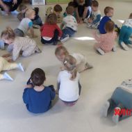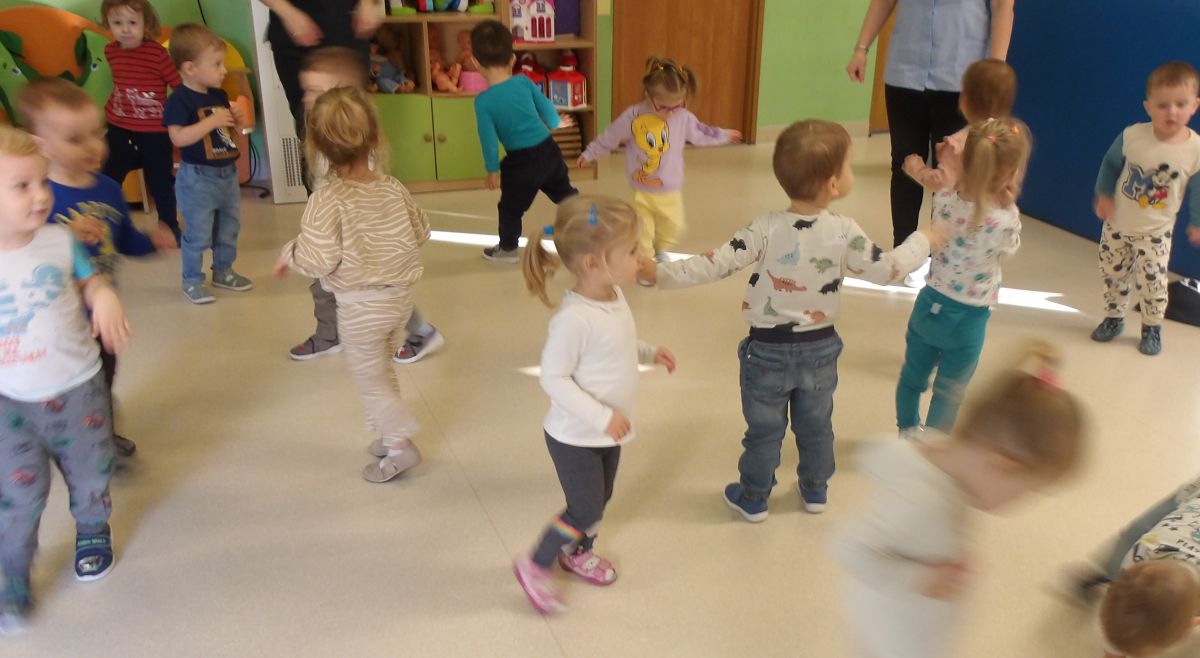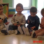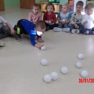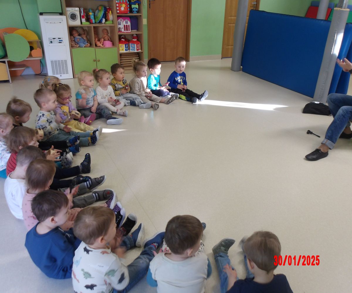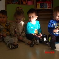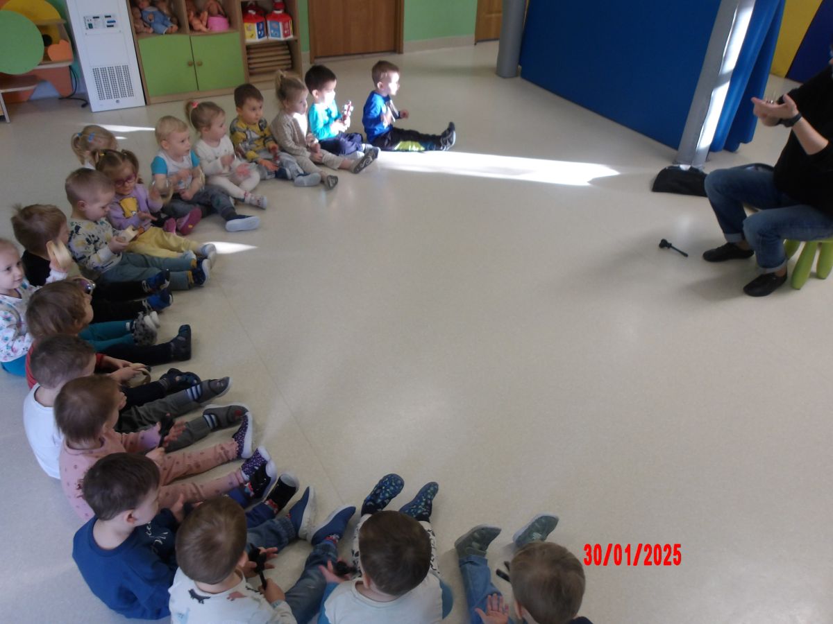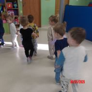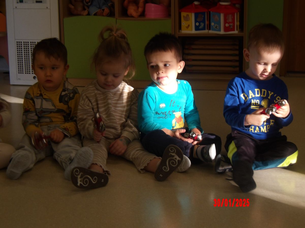 Rzucanie śnieżkami do utworu " Buch w śnieżny puch ", zabawa we wróbelki , taniec w parach oraz saneczki to atrakcje, które towarzyszyły dziś dzieciakom podczas rytmiki. Grały także na instrumentach do piosenek " Zima, zima, zima " i " Dzwonki sań ".