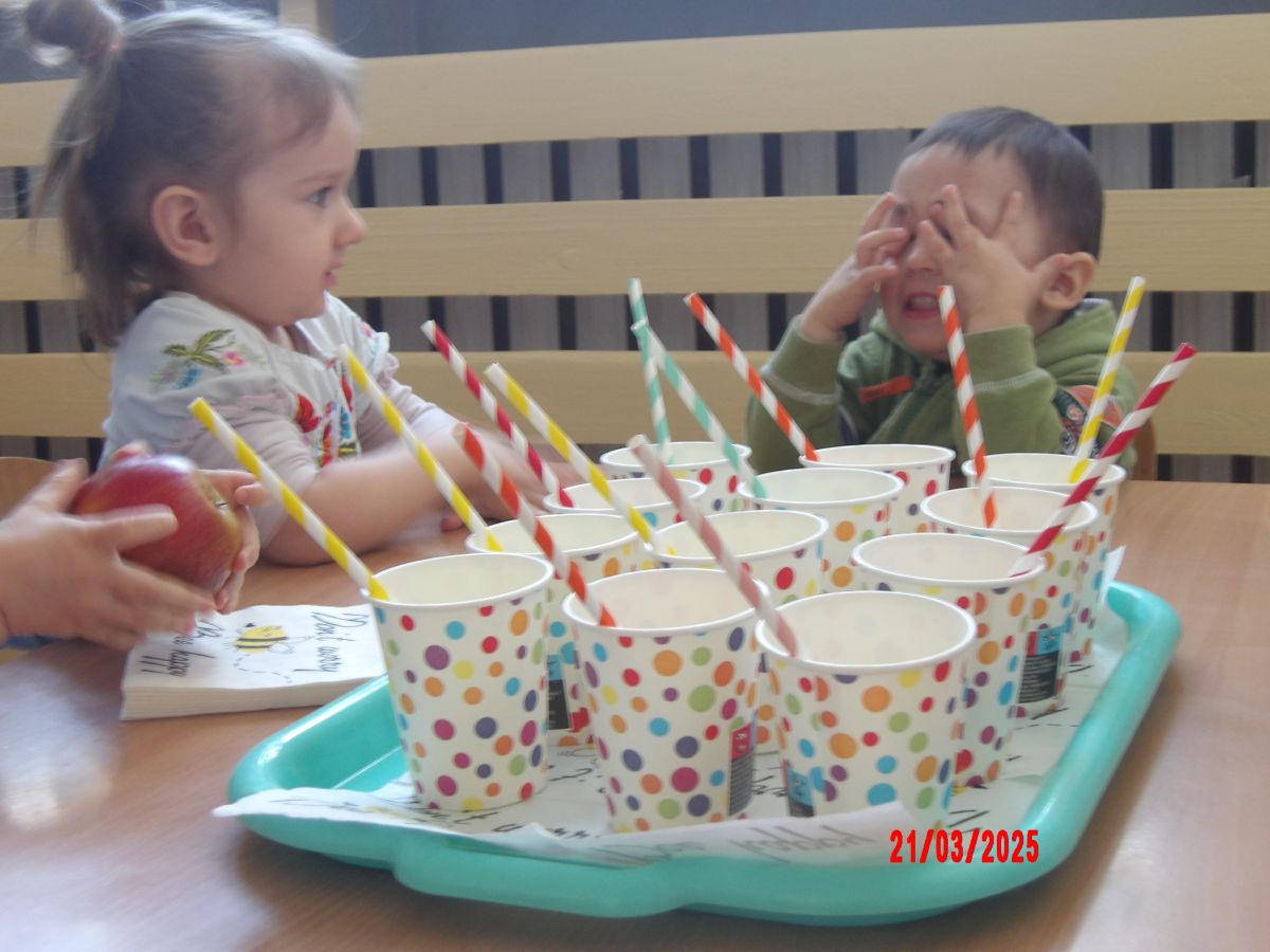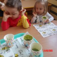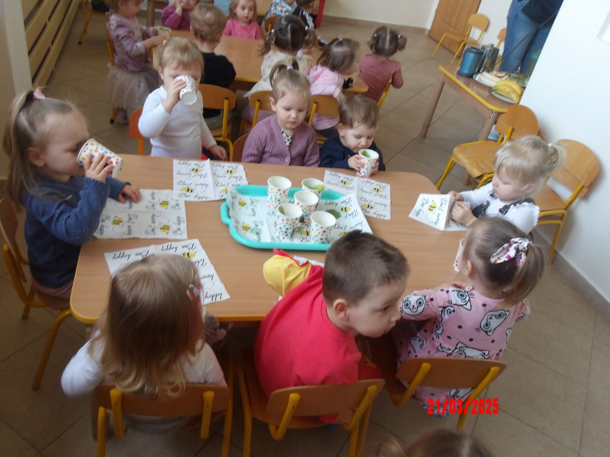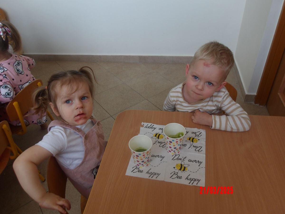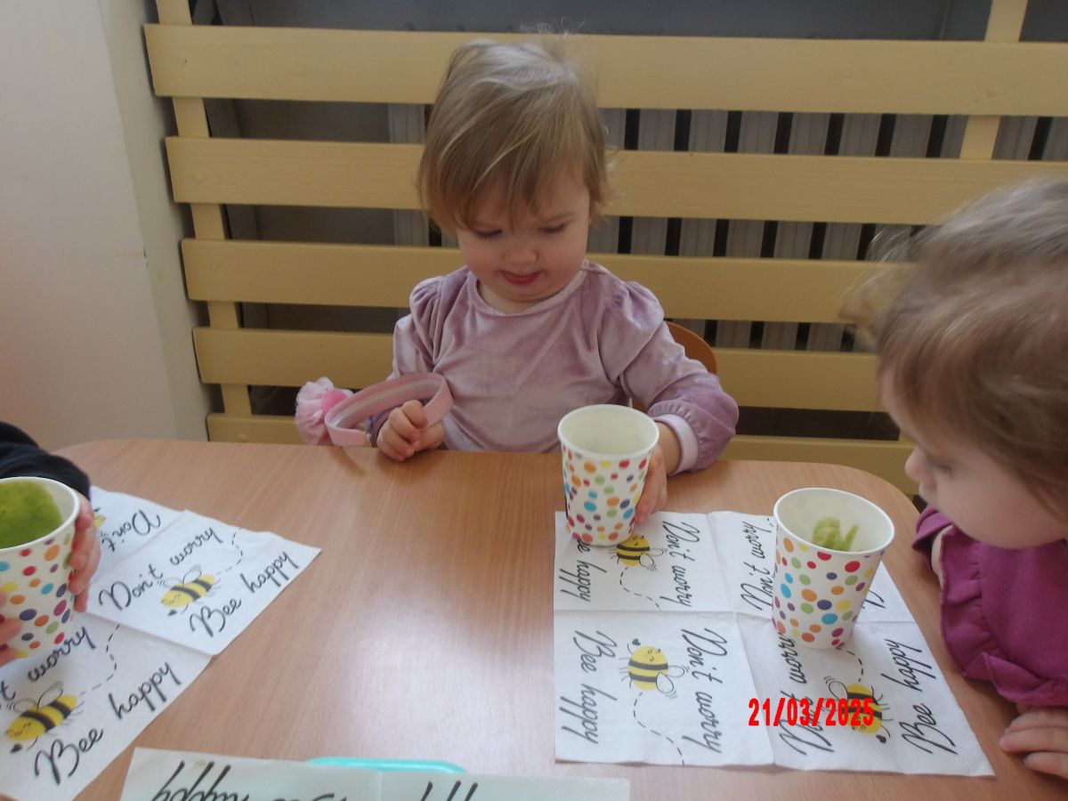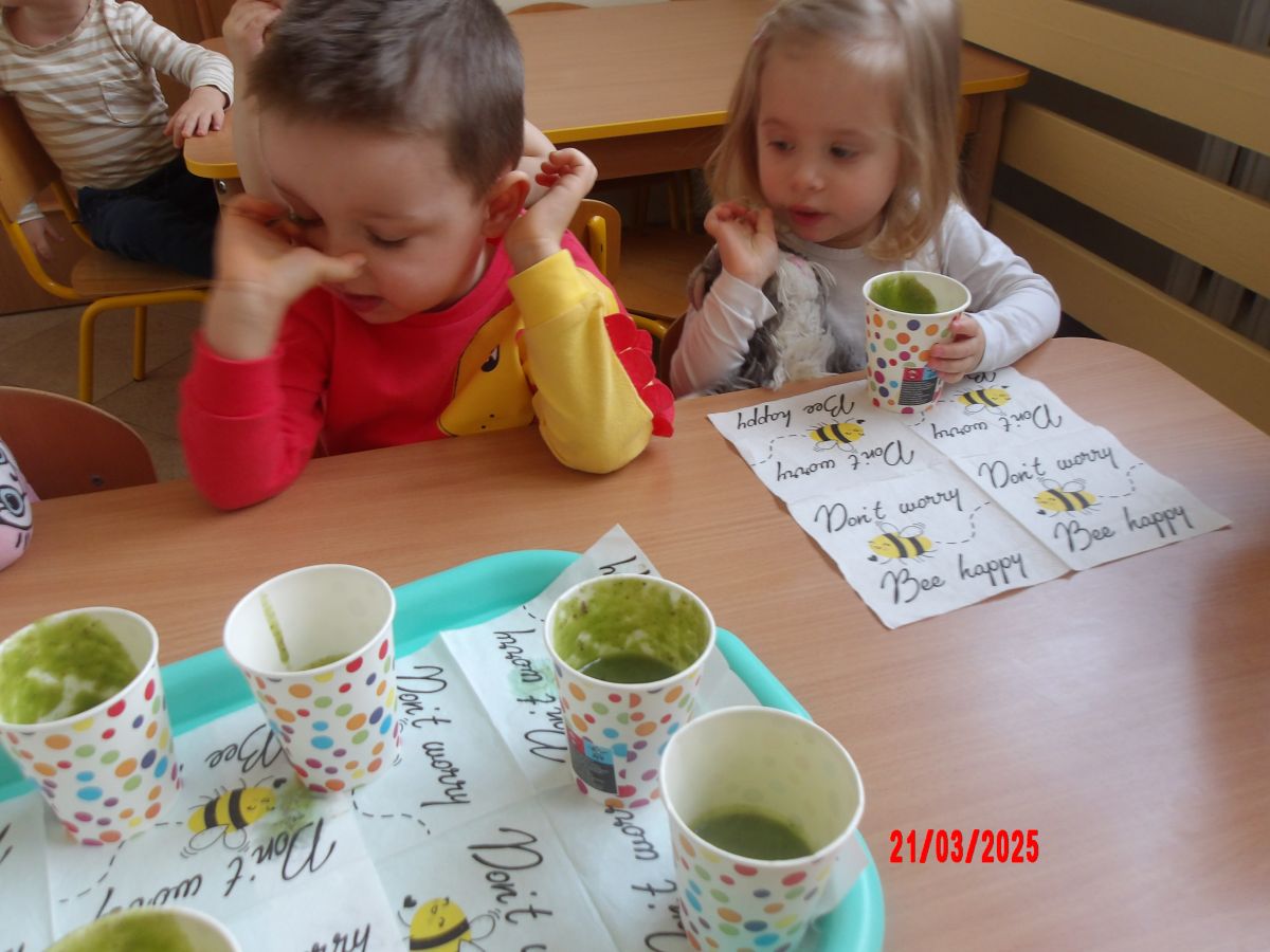 Dwulatki witając Wiosnę wzniosły toast "Zielonym Smoothie". Przygotowanie tego zielonego napoju rozbudziło ciekawość dwulatków, pomocników było co nie miara... Wśród składników pojawiły się: gruszki, jabłka, ananas, szpinak oraz kiwi.