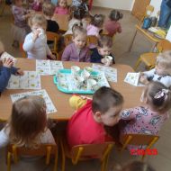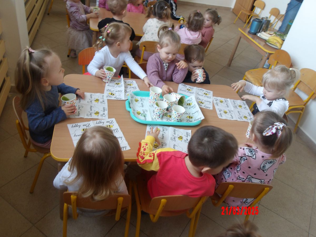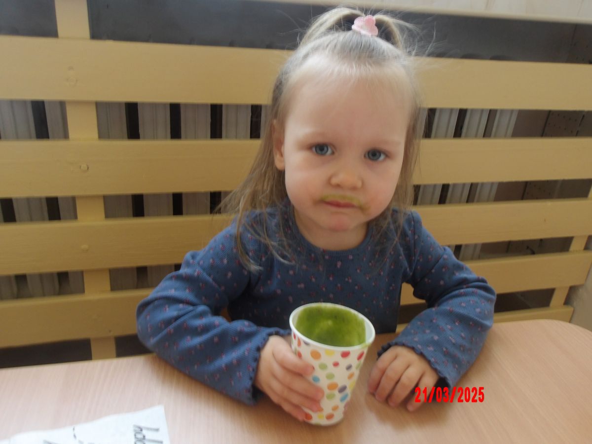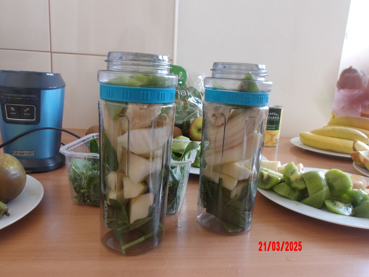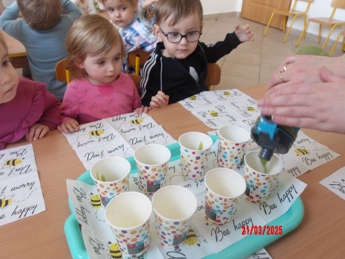 Dwulatki witając Wiosnę wzniosły toast "Zielonym Smoothie". Przygotowanie tego zielonego napoju rozbudziło ciekawość dwulatków, pomocników było co nie miara... Wśród składników pojawiły się: gruszki, jabłka, ananas, szpinak oraz kiwi.