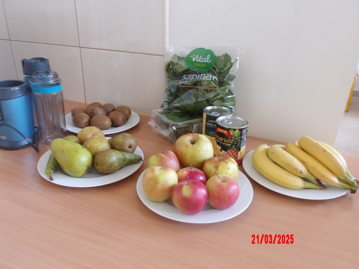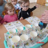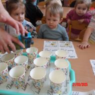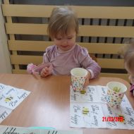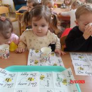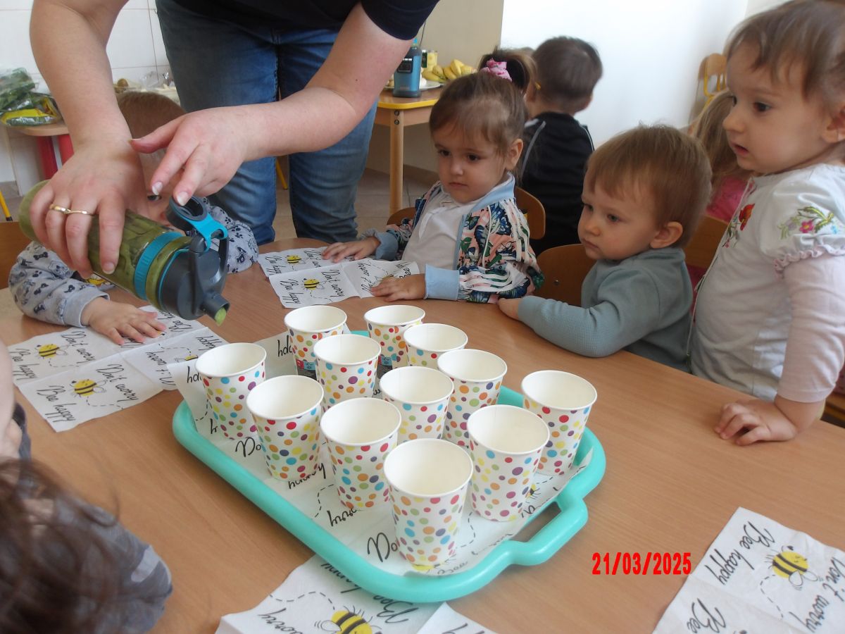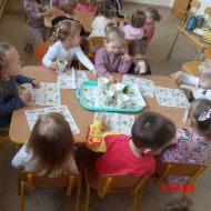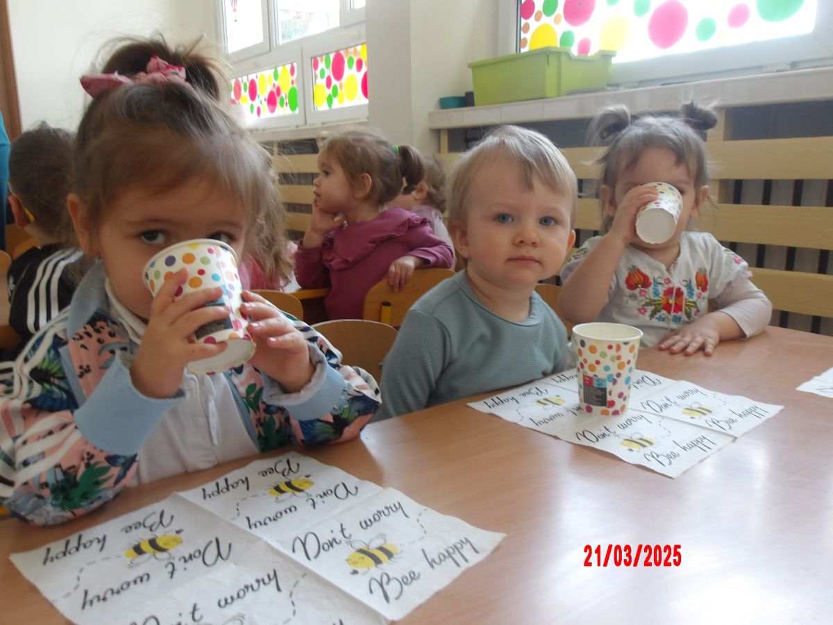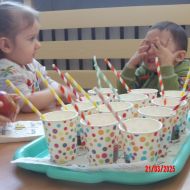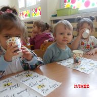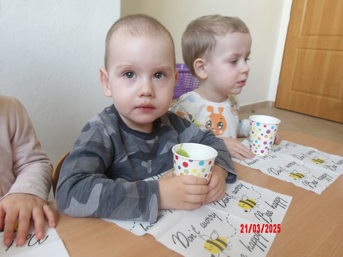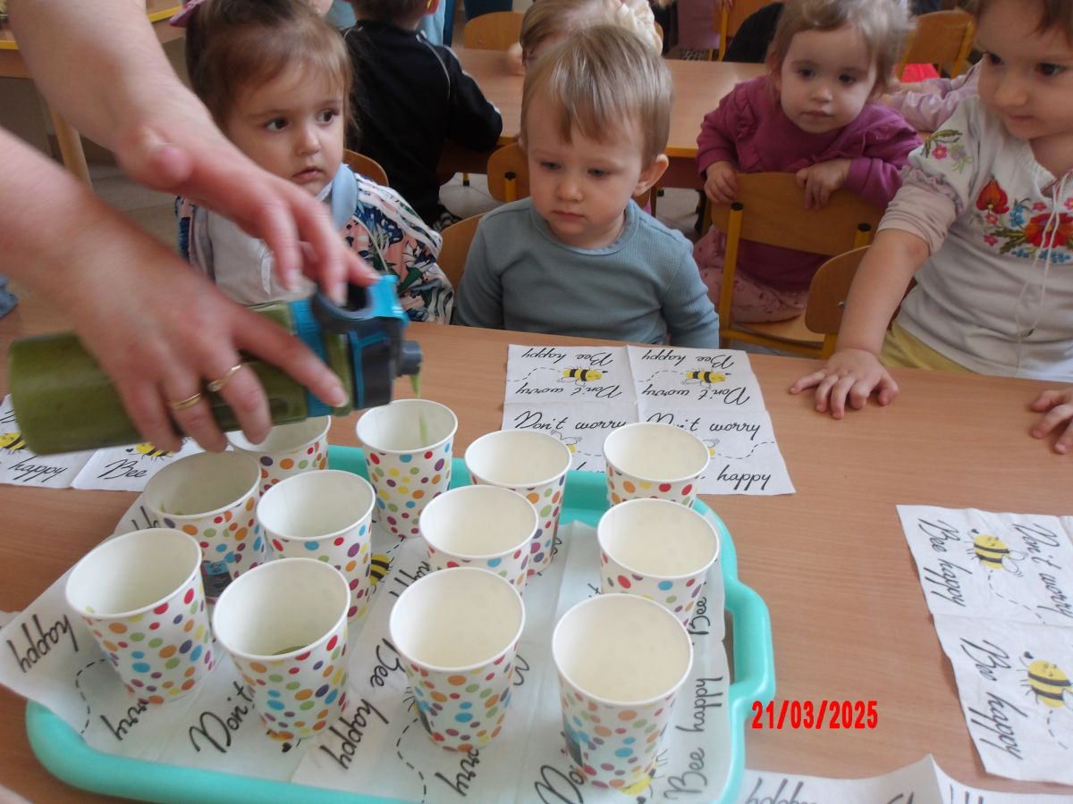 Dwulatki witając Wiosnę wzniosły toast "Zielonym Smoothie". Przygotowanie tego zielonego napoju rozbudziło ciekawość dwulatków, pomocników było co nie miara... Wśród składników pojawiły się: gruszki, jabłka, ananas, szpinak oraz kiwi.