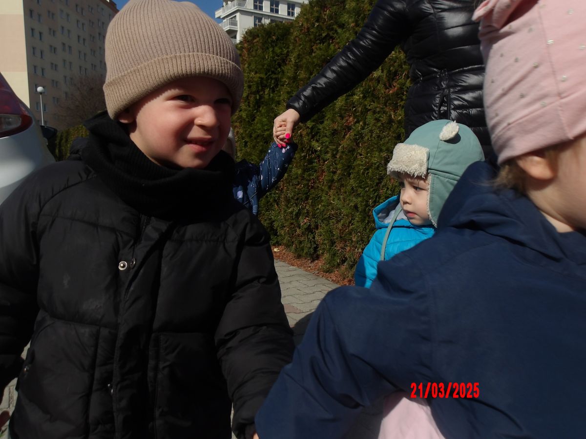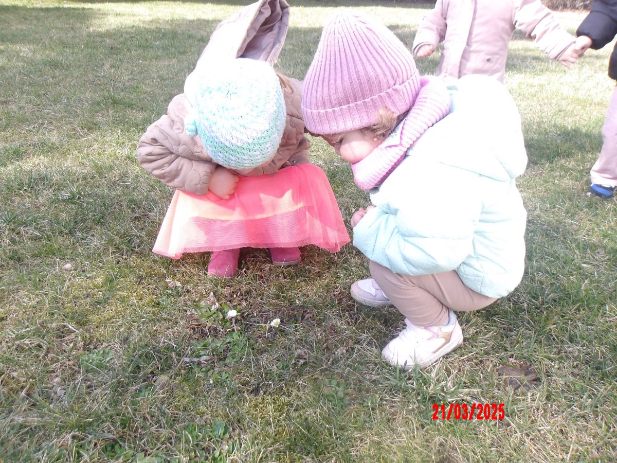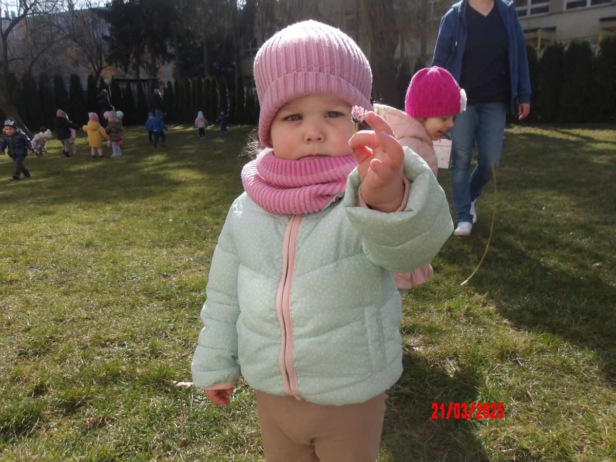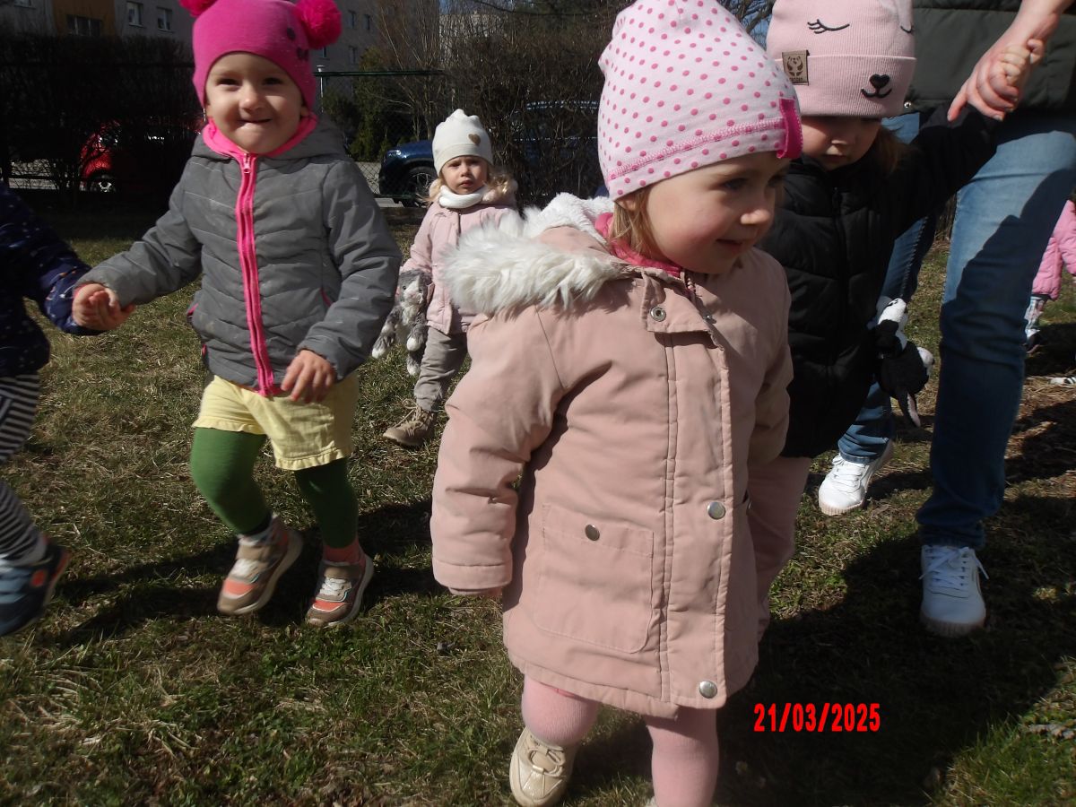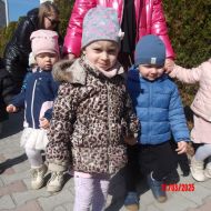 Kolejną atrakcją był spacer w poszukiwaniu oznak Wiosny. Dzieci radośnie reagowały na wesołe trele ptaków i ciepłe słoneczko. Ku radości wszystkich znaleźliśmy wiosenne fiołki i stokrotki. Witaj Wiosno!