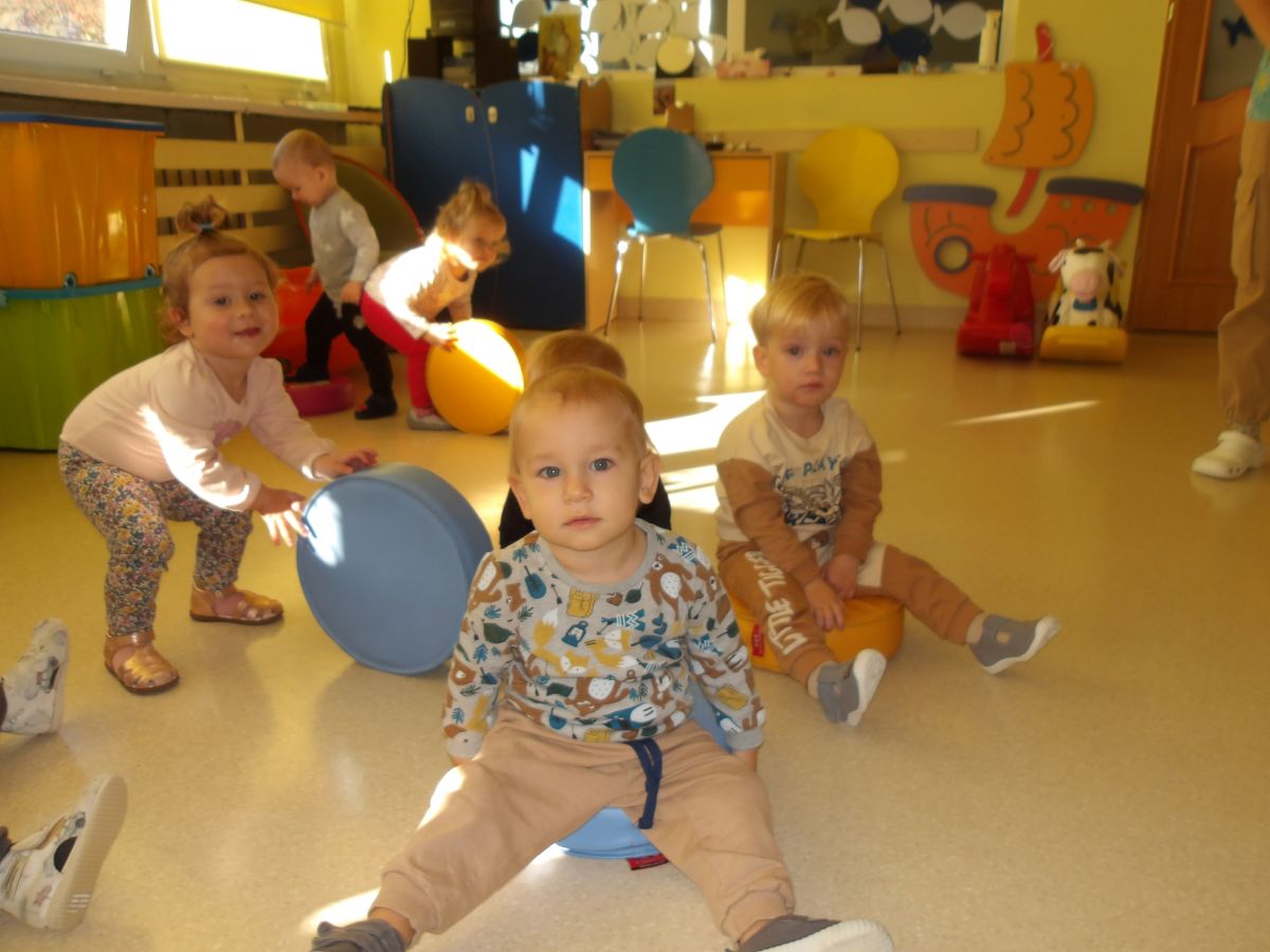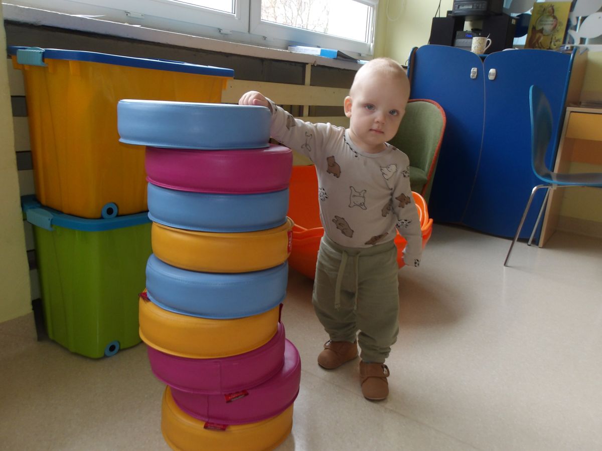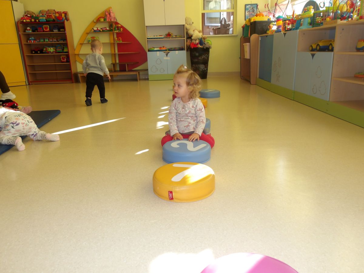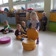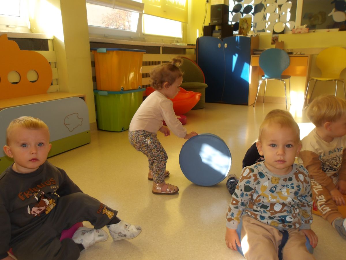 Opublikowano: czw., 10/31/2024 - 13:55 Nasze Maluszki chętnie bawią się kolorowymi krążkami: toczą je, układają jeden na drugim, wspinają się po nich a także siedzą słuchając opowiadania cioci.
