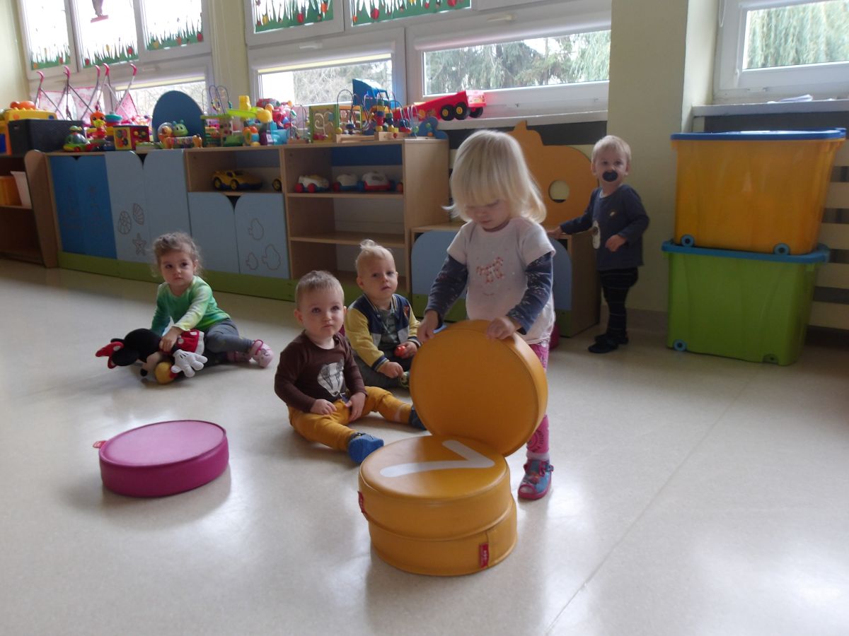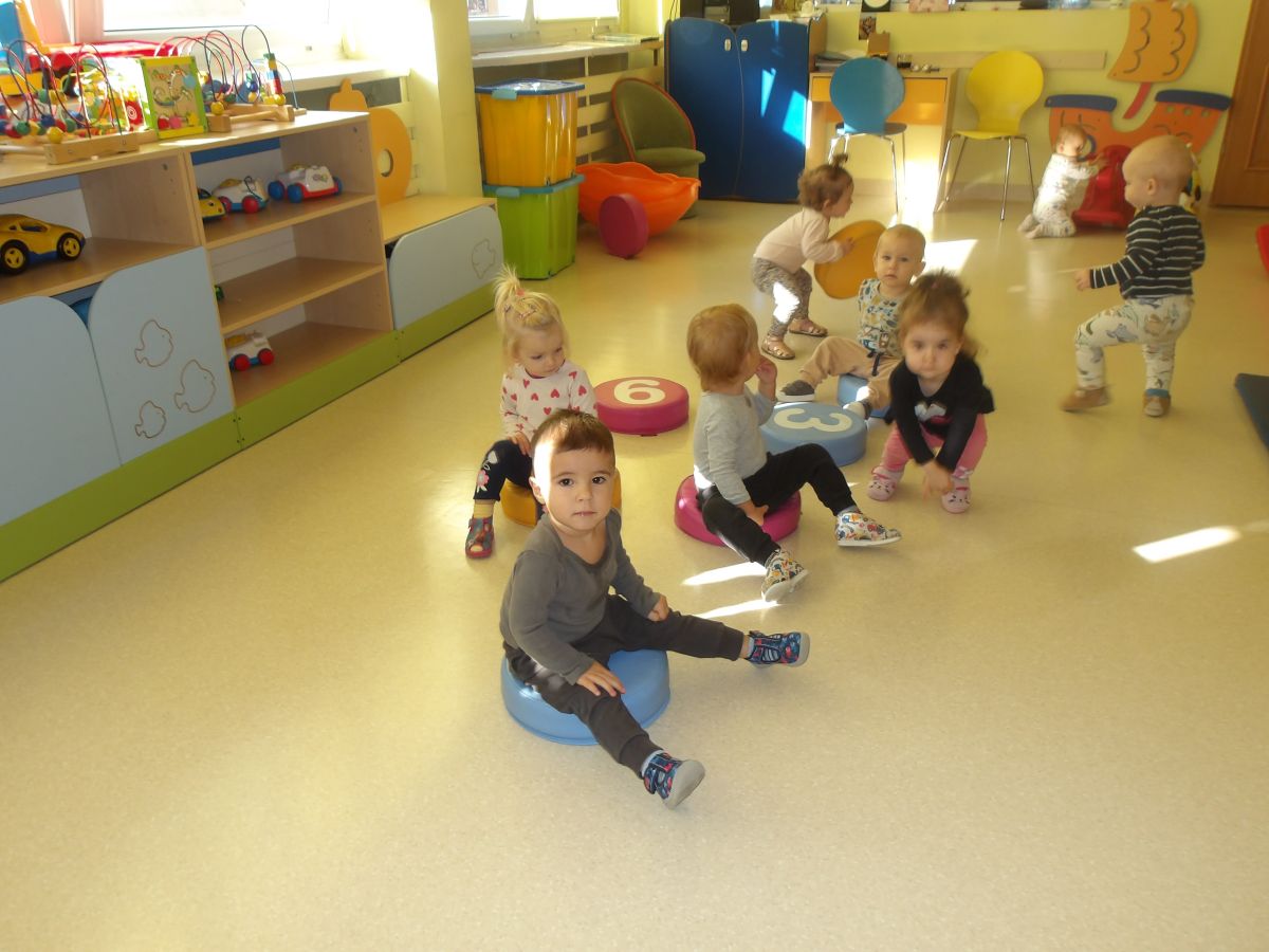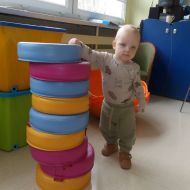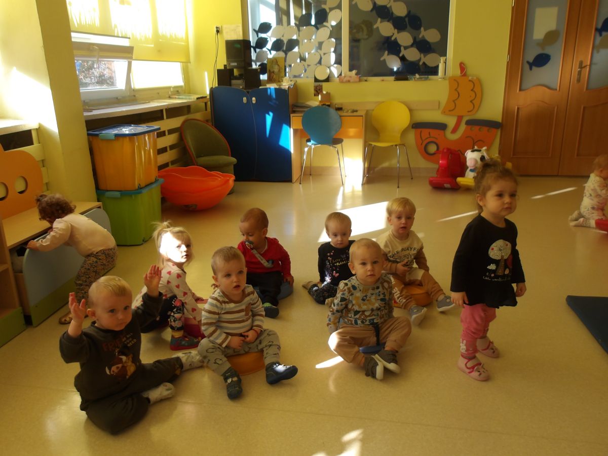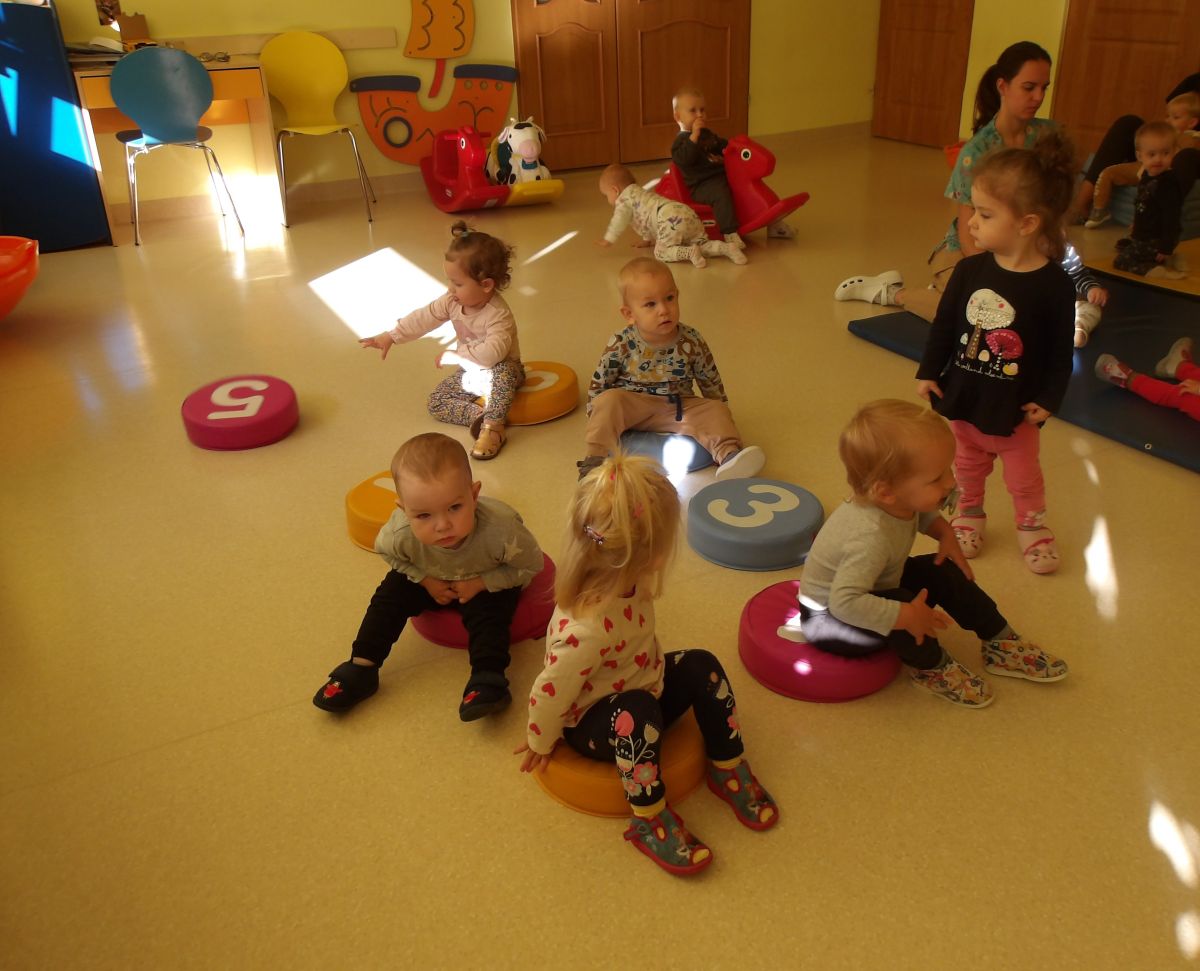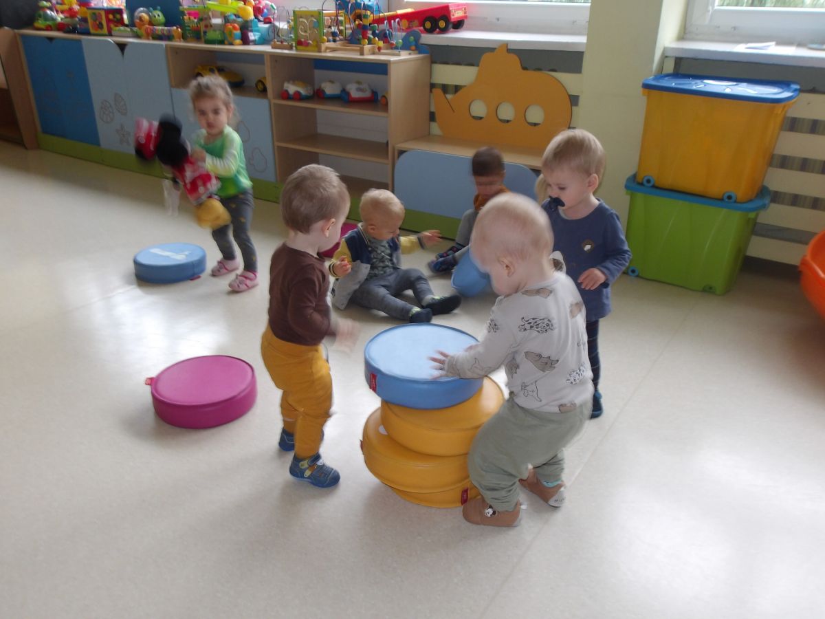 Opublikowano: czw., 10/31/2024 - 13:55 Nasze Maluszki chętnie bawią się kolorowymi krążkami: toczą je, układają jeden na drugim, wspinają się po nich a także siedzą słuchając opowiadania cioci.