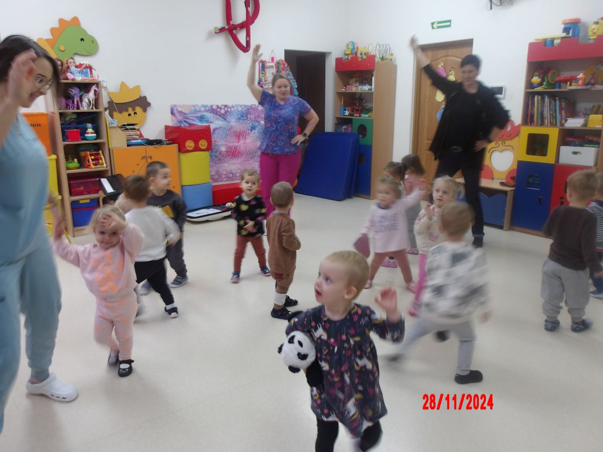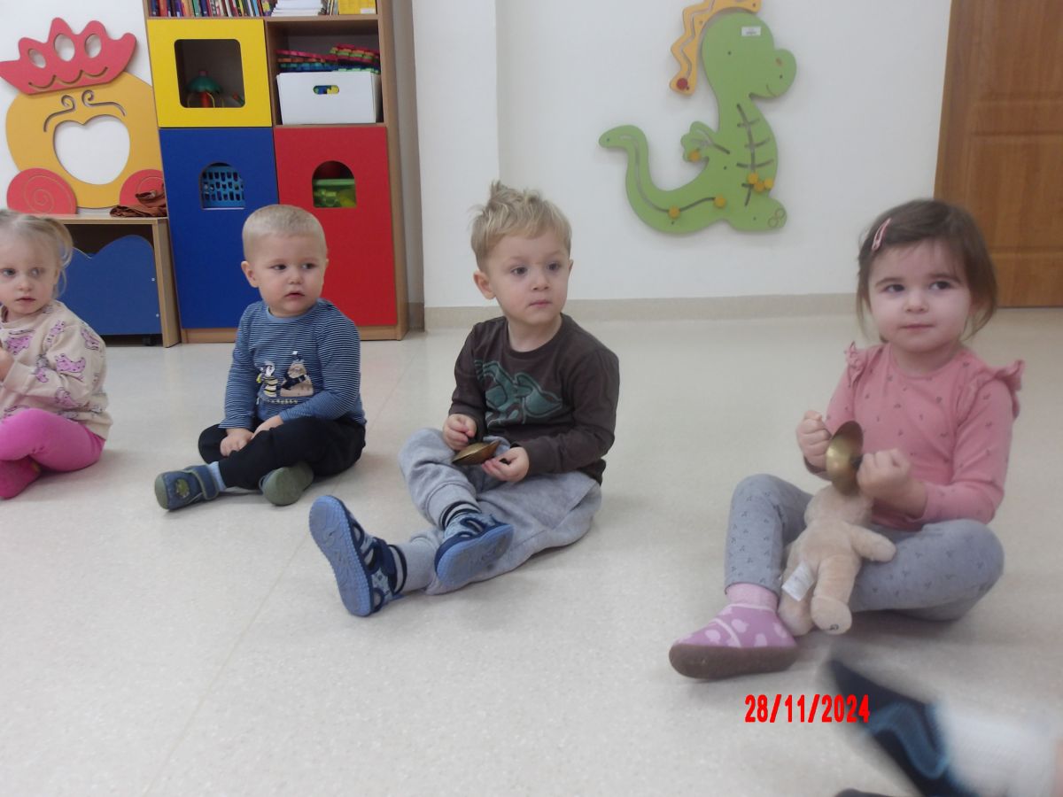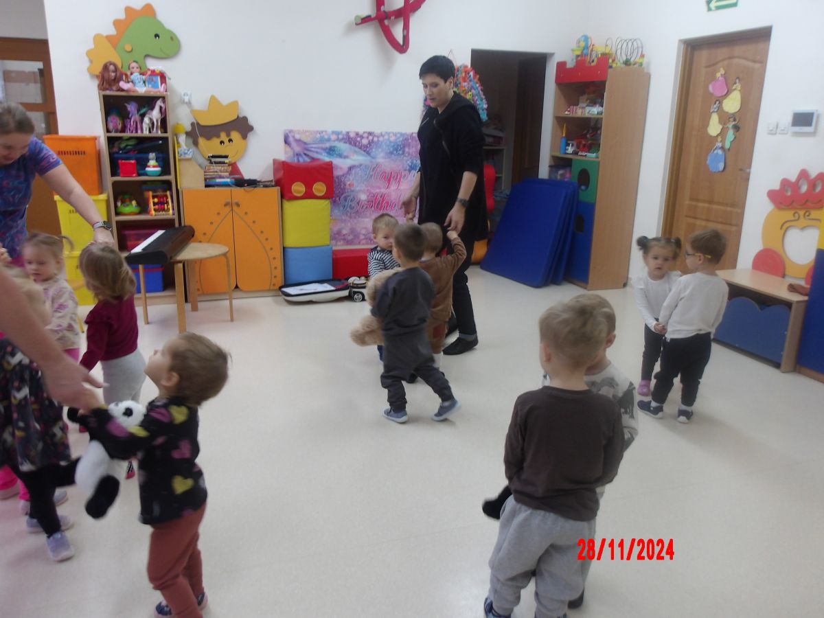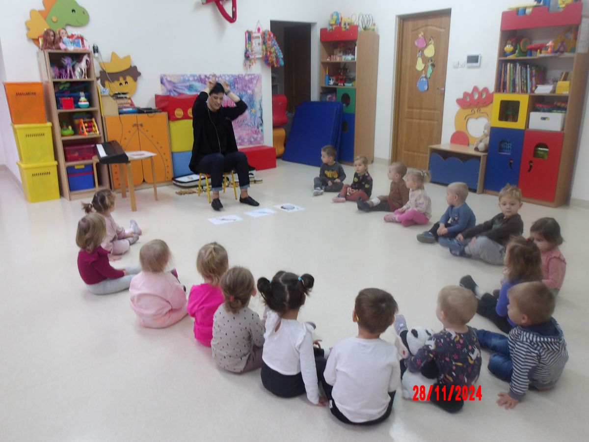 Opublikowano: pt., 11/29/2024 - 11:20 Zajęcia muzyczno-rytmiczne prowadzone przez Panią Anię, inspirowane piosenkami ,,Na polanie w lesie'' , ,,Wiewiórka mała po lecie biegała''.